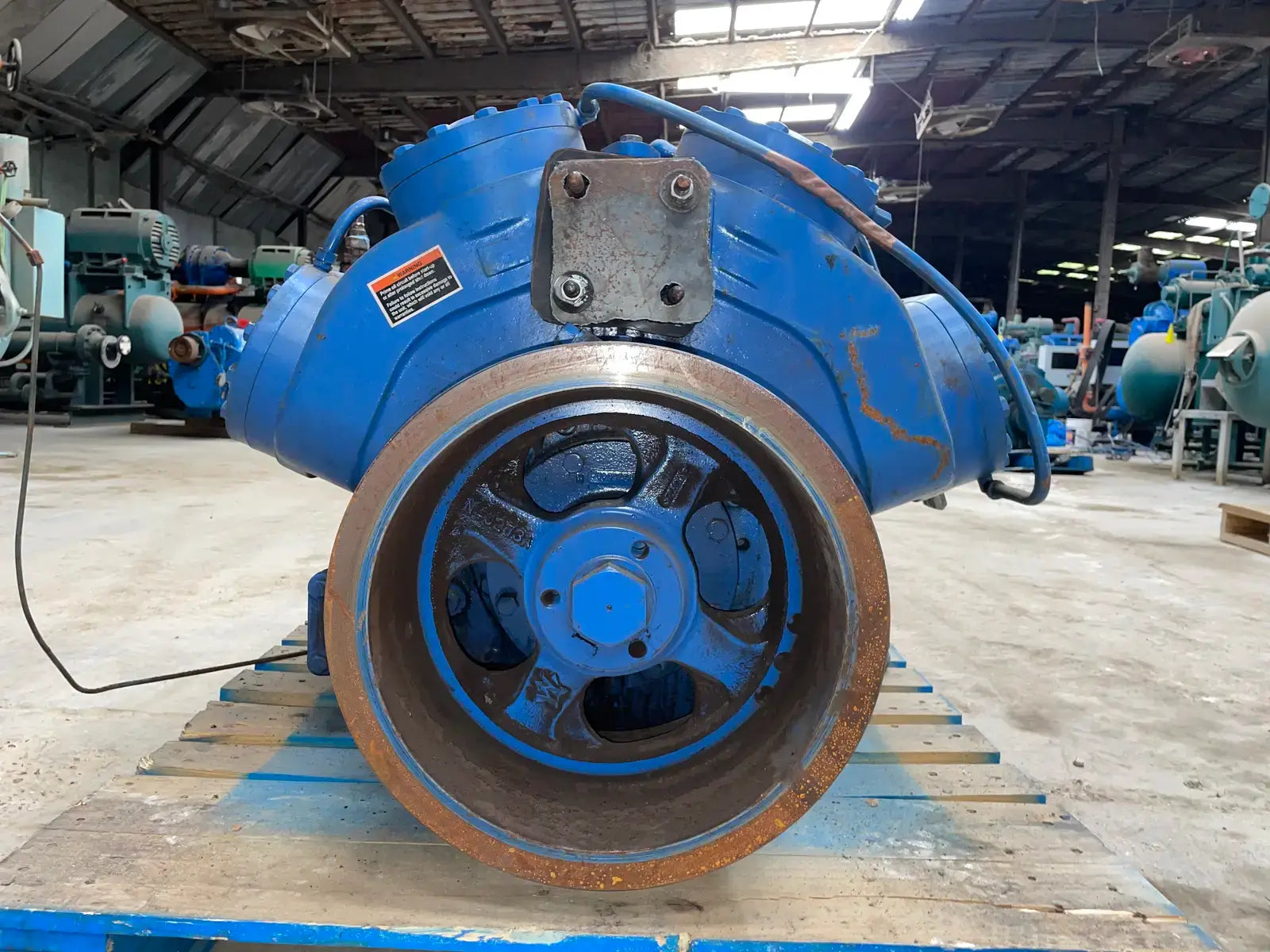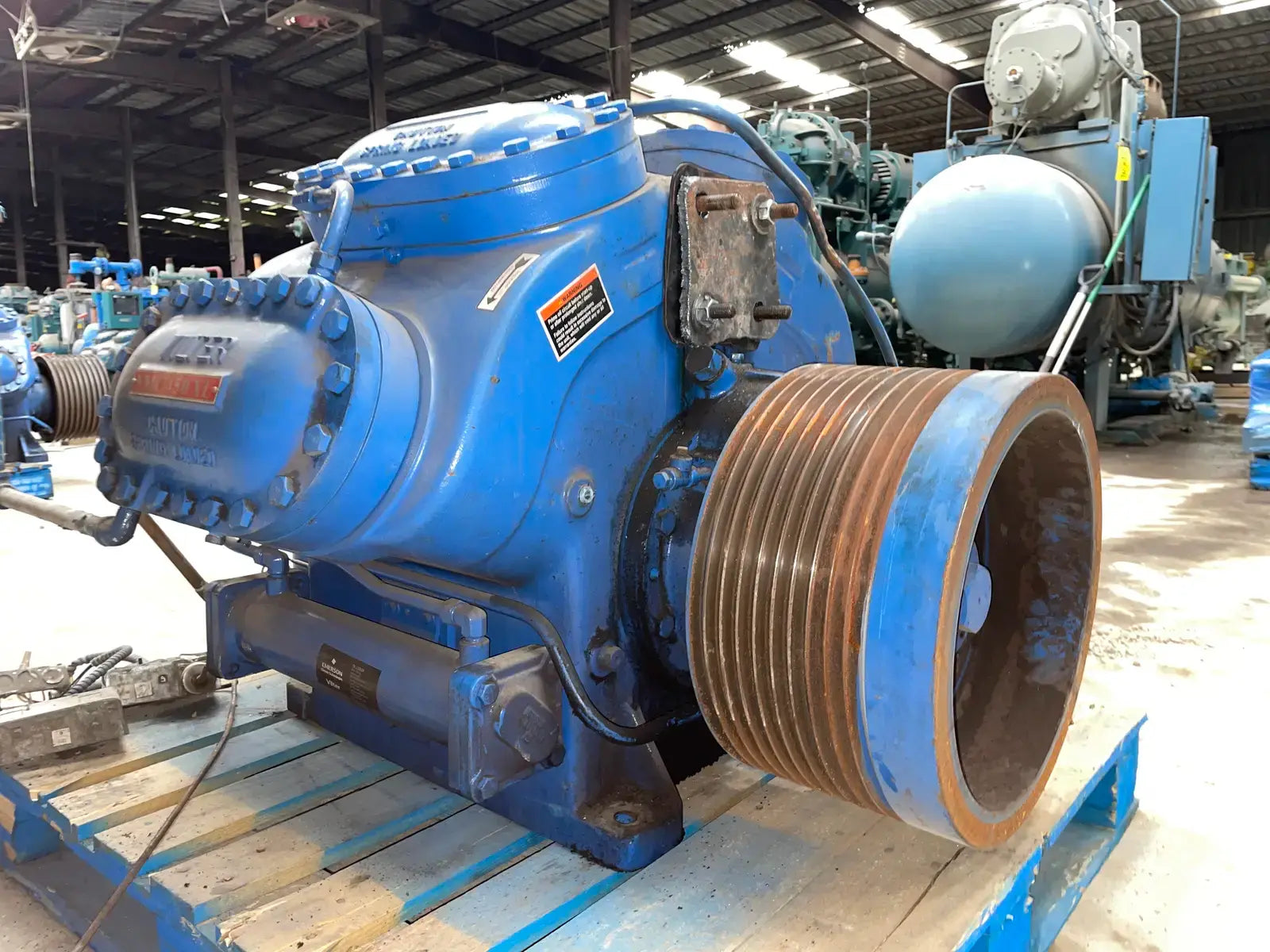Vilter belt-driven reciprocating compressor. Model: M95KX458XL. Serial No: 83864. Order No: S183310. Refrigerant: R22. Number of Cylinders: 8. Maximum RPM: 1200. CFM @ Maximum RPM: 398. Connections: Suction: 4 in. Discharge: 3 in.