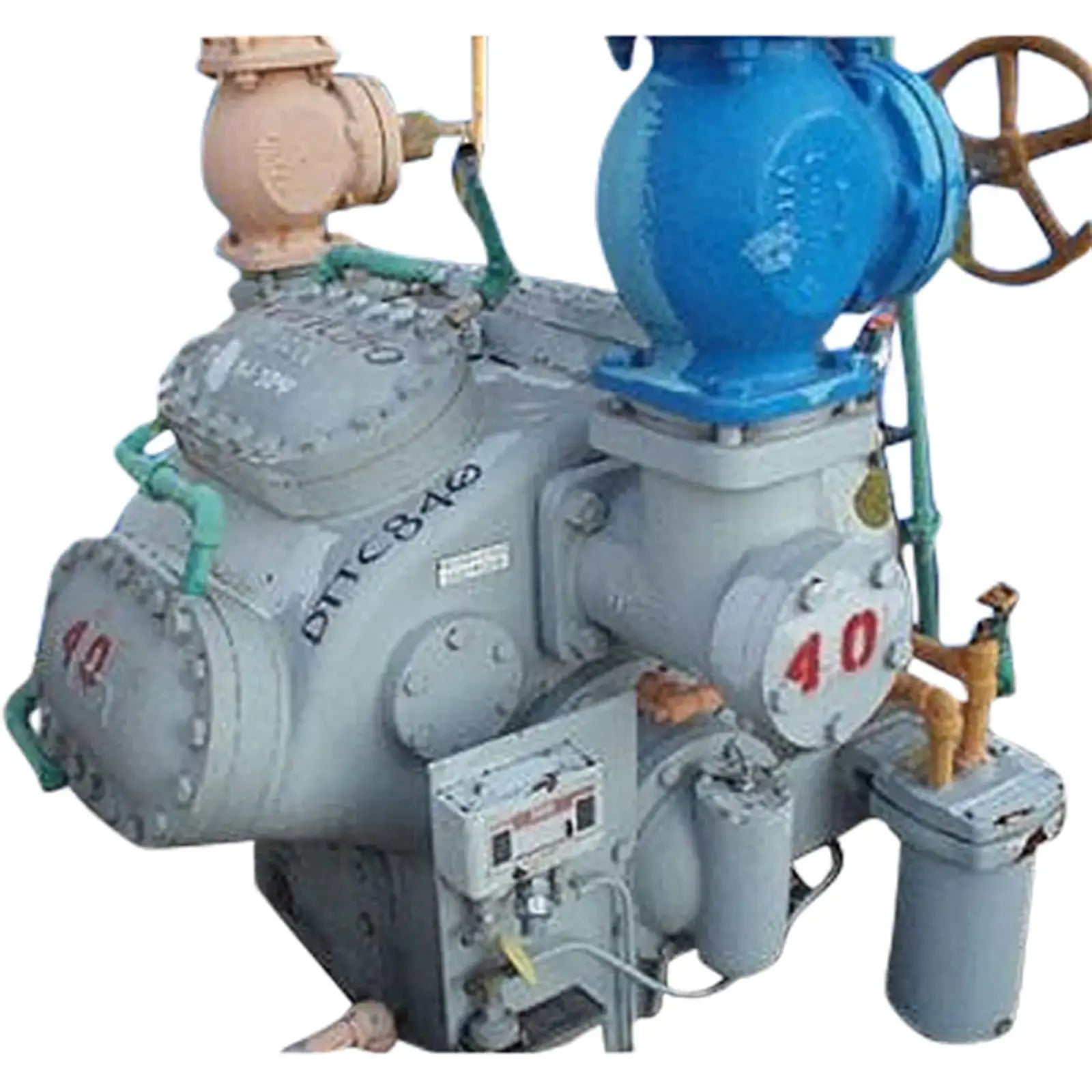 Used Vilter 8-Cylinder Reciprocating Compressor. Refrigerant: ammonia. Liquid-cooled heads. Inlets: (1) 3/4 in. dia. pipe (liquid), (1) 4 in. dia. refrigerant suction port. Outlets: (1) 3/4 in. dia. pipe (liquid), (1) 3 in. dia. refrigerant discharge port. Overall dimensions: 51 in. L x 40 in. W x 70 in. H.