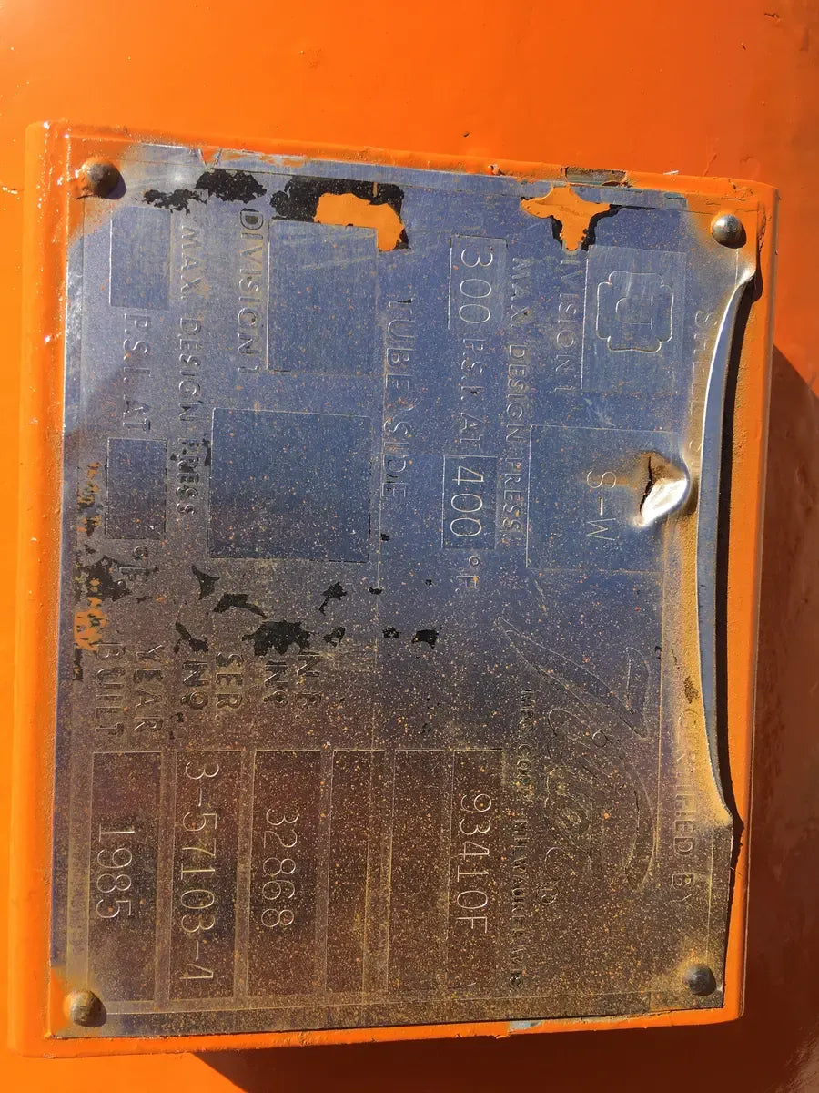 Vilter 93410F Horizontal Oil Separator (15in x 30 in. 20 Gallons) Serial Number: 3-57103-4. Tank National Board Number: 32868. Tank Estimated Capacity (Gallons): 20. Tank MAWP (PSI @ Temp): 300 PSI @ 400F. Tank MAWT (PSI @ Temp). Previous Refrigerant was Ammonia (R717 | NH3). Manufactured in 1985. Shipping Dimensions (Inches): 68 x 15 x 5. 460 LB
