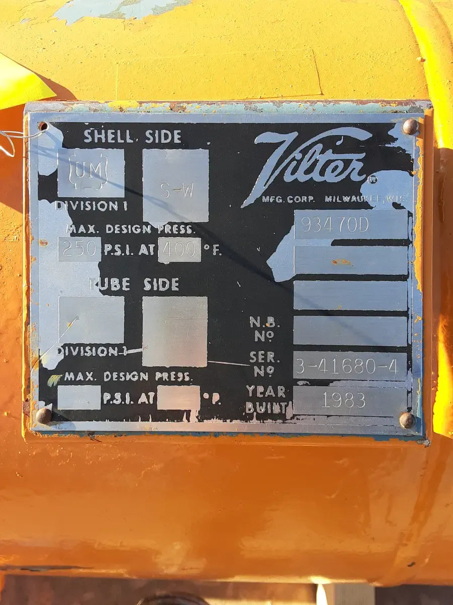 Vilter 93470D Horizontal Oil Separator (15in x 30in. 23 Gallons) Serial Number: 3-41680-4. Tank National Board Number: 93470D. Tank Estimated Capacity (Gallons): 23. Tank MAWP (PSI @ Temp): 250 PSI @ 400 F. Tank MAWT (PSI @ Temp). Previous Refrigerant was Ammonia (R717 | NH3). Manufactured in 1983. Shipping Dimensions (Inches): 30 x 15 x 15. 290 LB