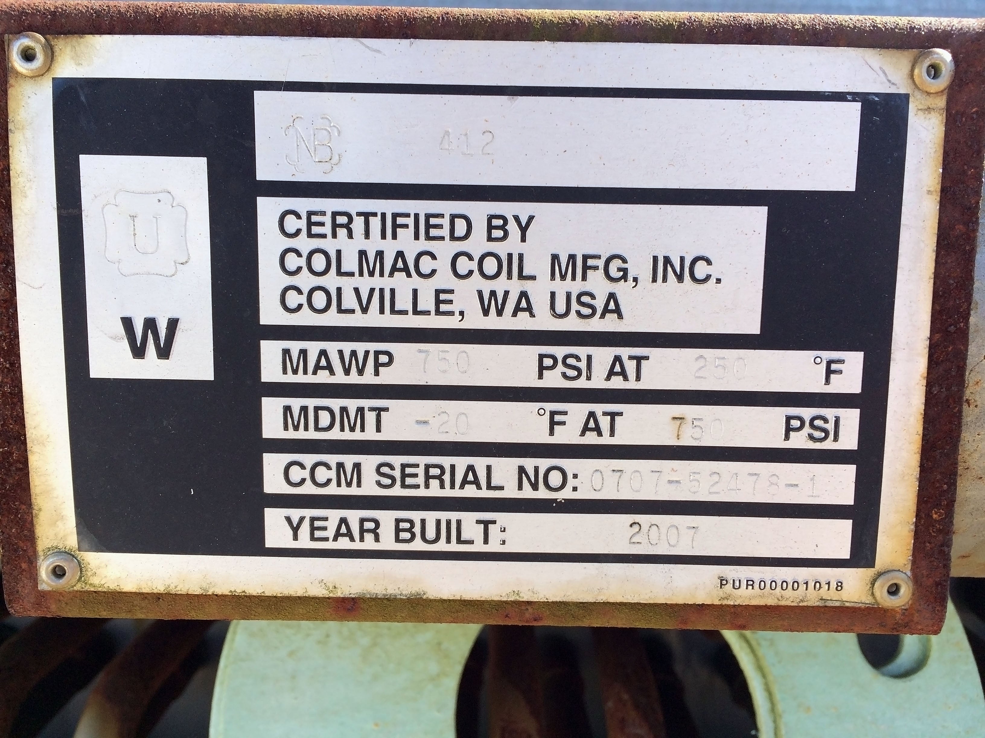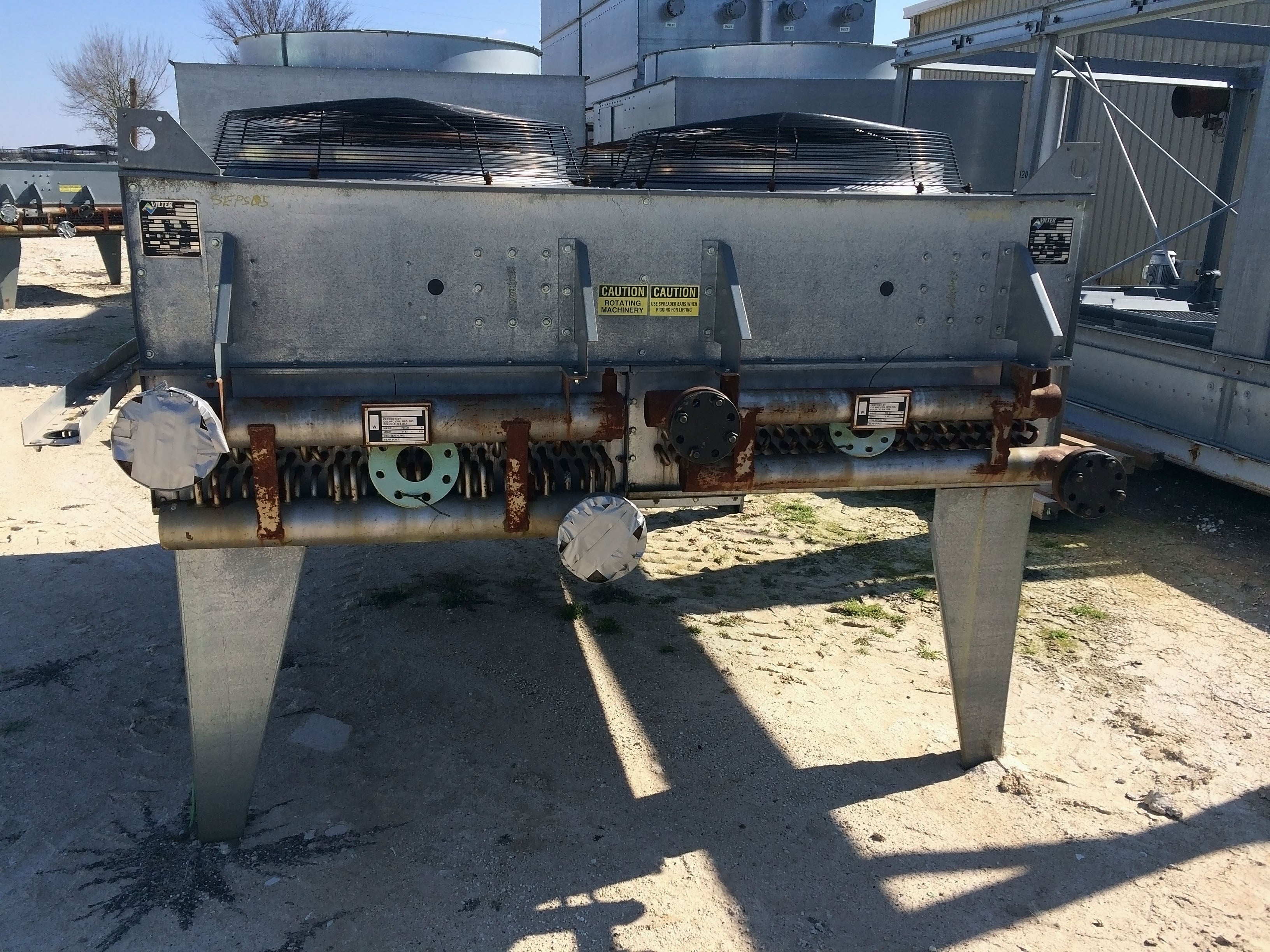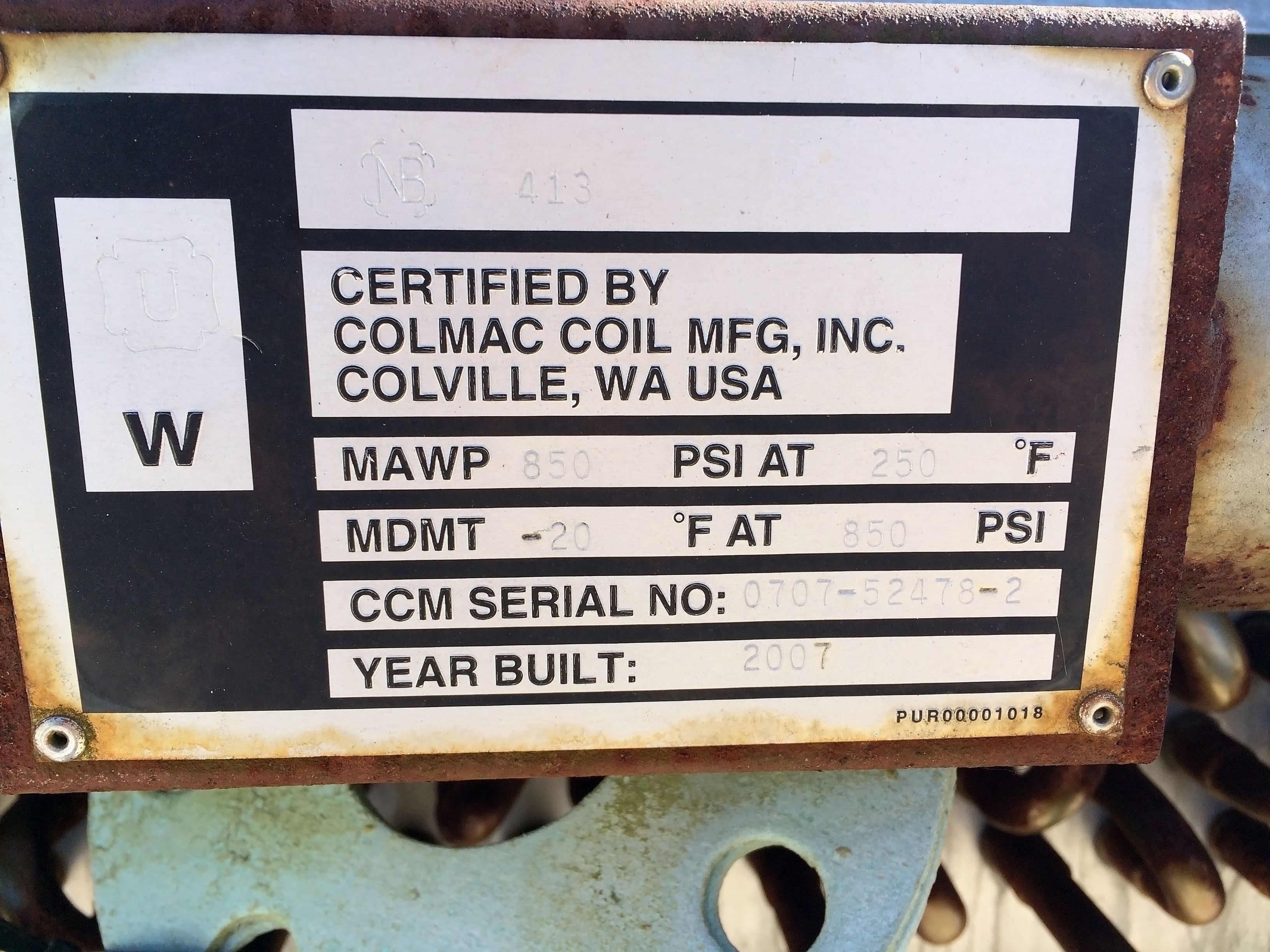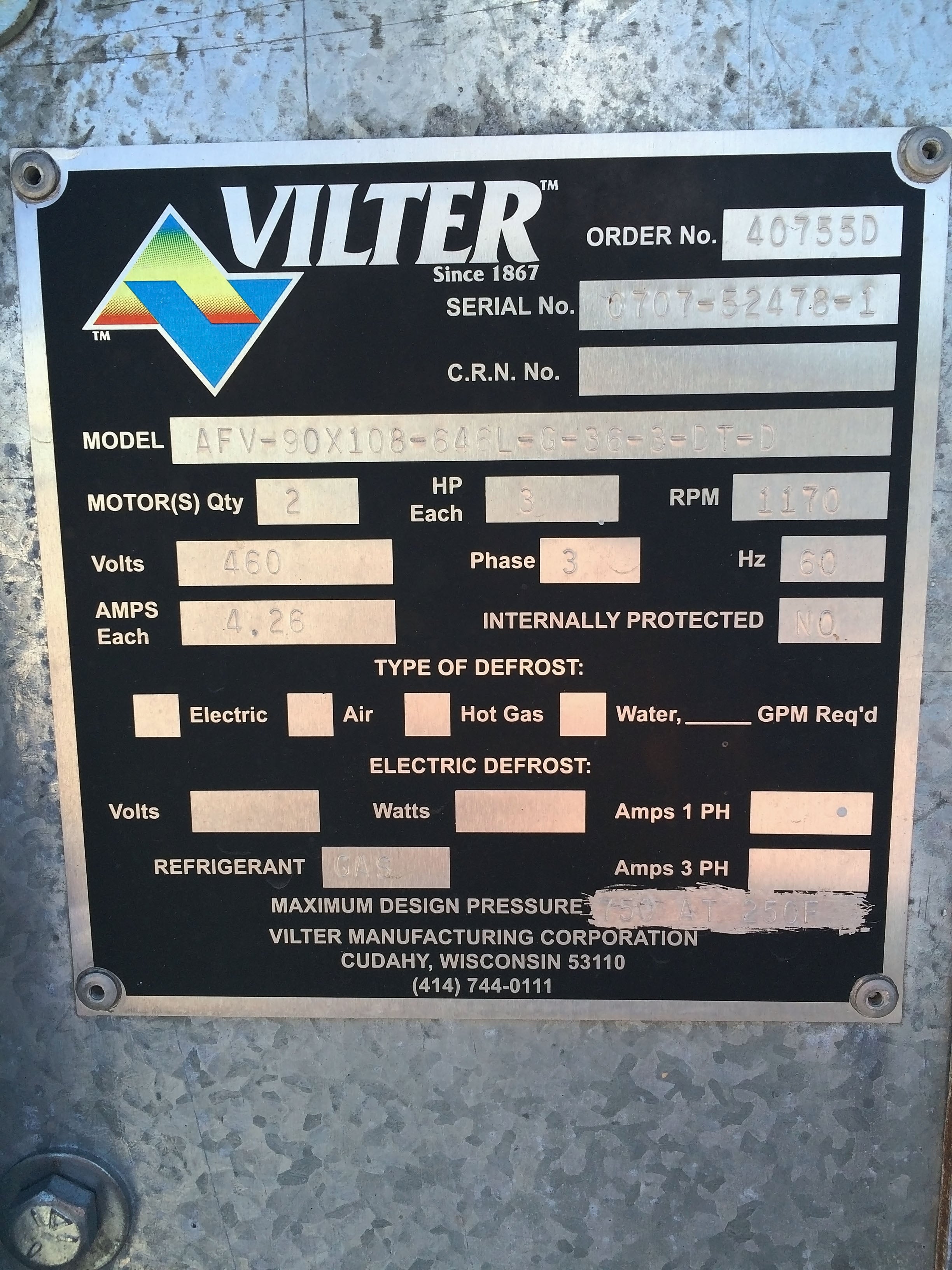 Used Vilter Air-cooled Condenser / Cooler. Left Model: AFV-90X108-646L-G-36-3-DT-D. Serial: 0707-52478-1. Order: 40775D. Refrigerant: gas. MAWP: 750 PSI at 250F. MDMT -20F at 750 PSI. Year 2007. (2) 3 HP 460V fan motors. Right Model: AFV-90X108-646L-G-36-3-DT-D. Serial: 0707-52478-2. Order: 40775D. Refrigerant: oil. MAWP: 850 PSI at 250F. MDMT -20F at 850 PSI. (2) 3 HP 460V fan motors. Certified by Colmac Coil Mfg., Inc. Previously run in a 'sweet gas' application. Also known as a dry cooler / fluid cooler.