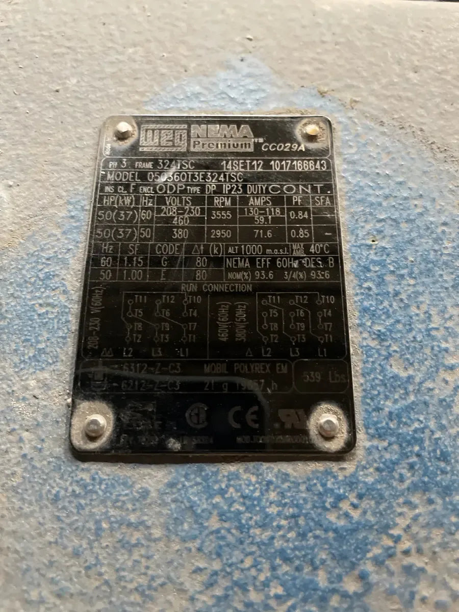- If Multiple Motors, Motor Descriptions vs specs: Lincoln Motor, Model SD2P50TSC61Y, 50HP, 3550 RPM, 230/460V, 112/56 AMPS, 3 Phase, 60 Hz, ODP Enclosure, 324TSC Frame.