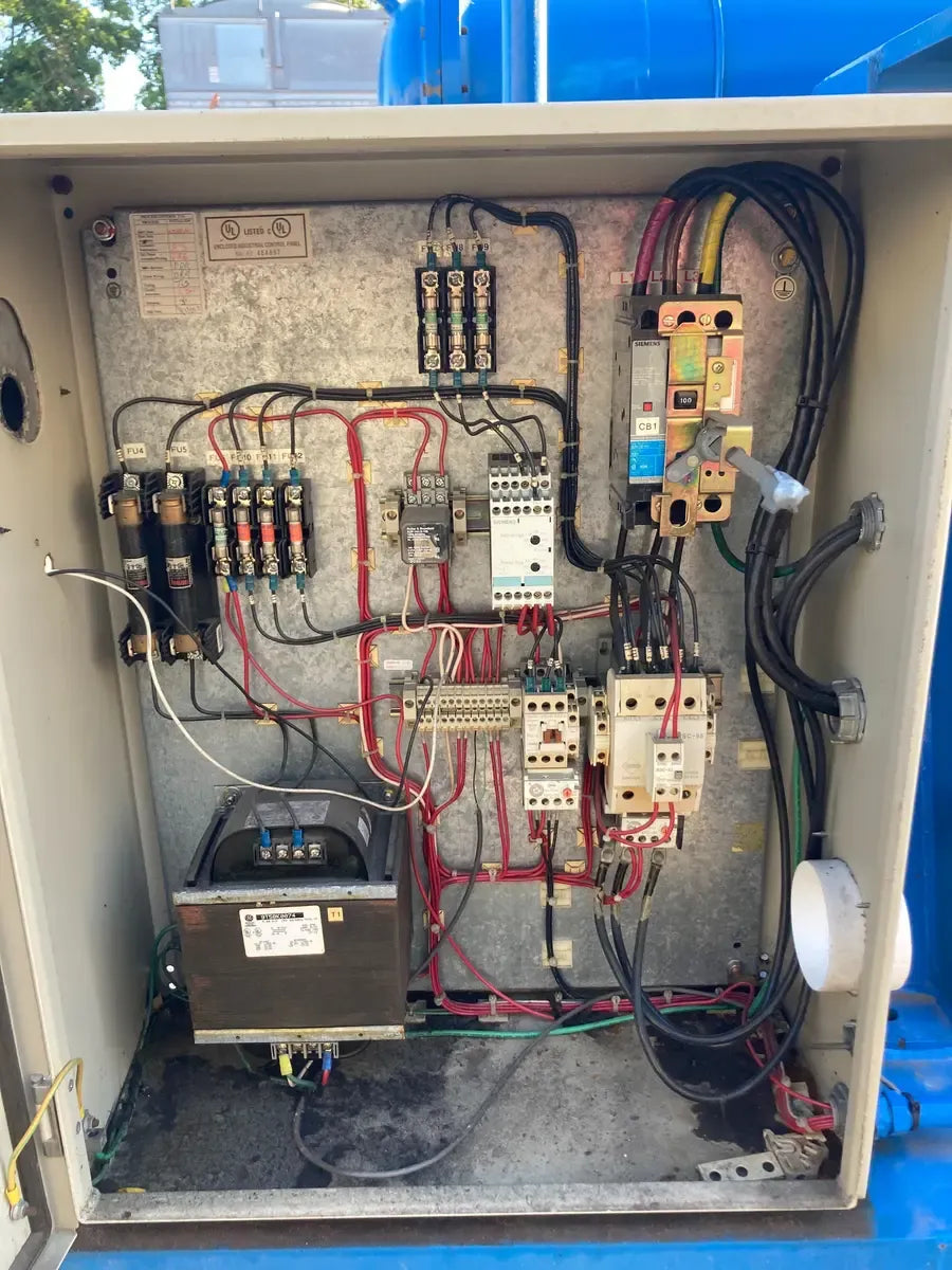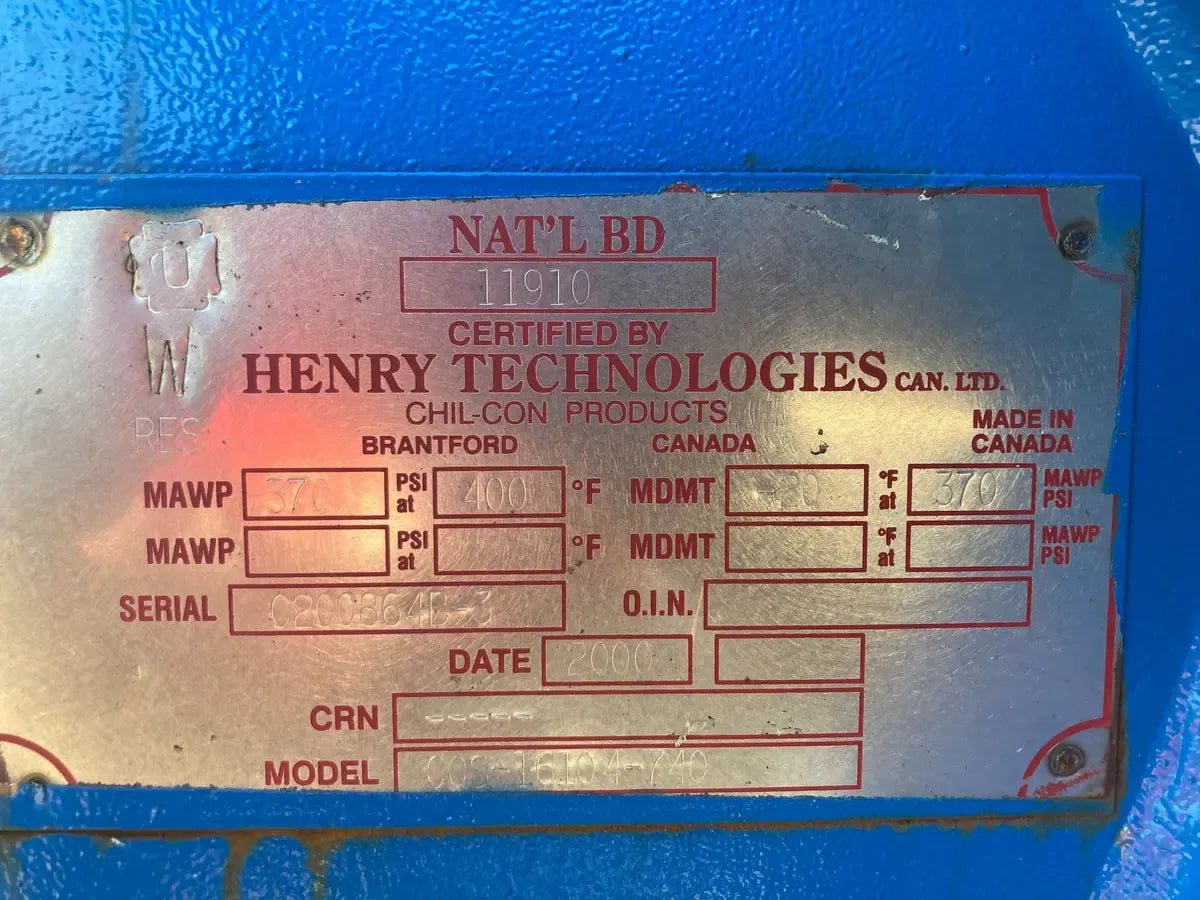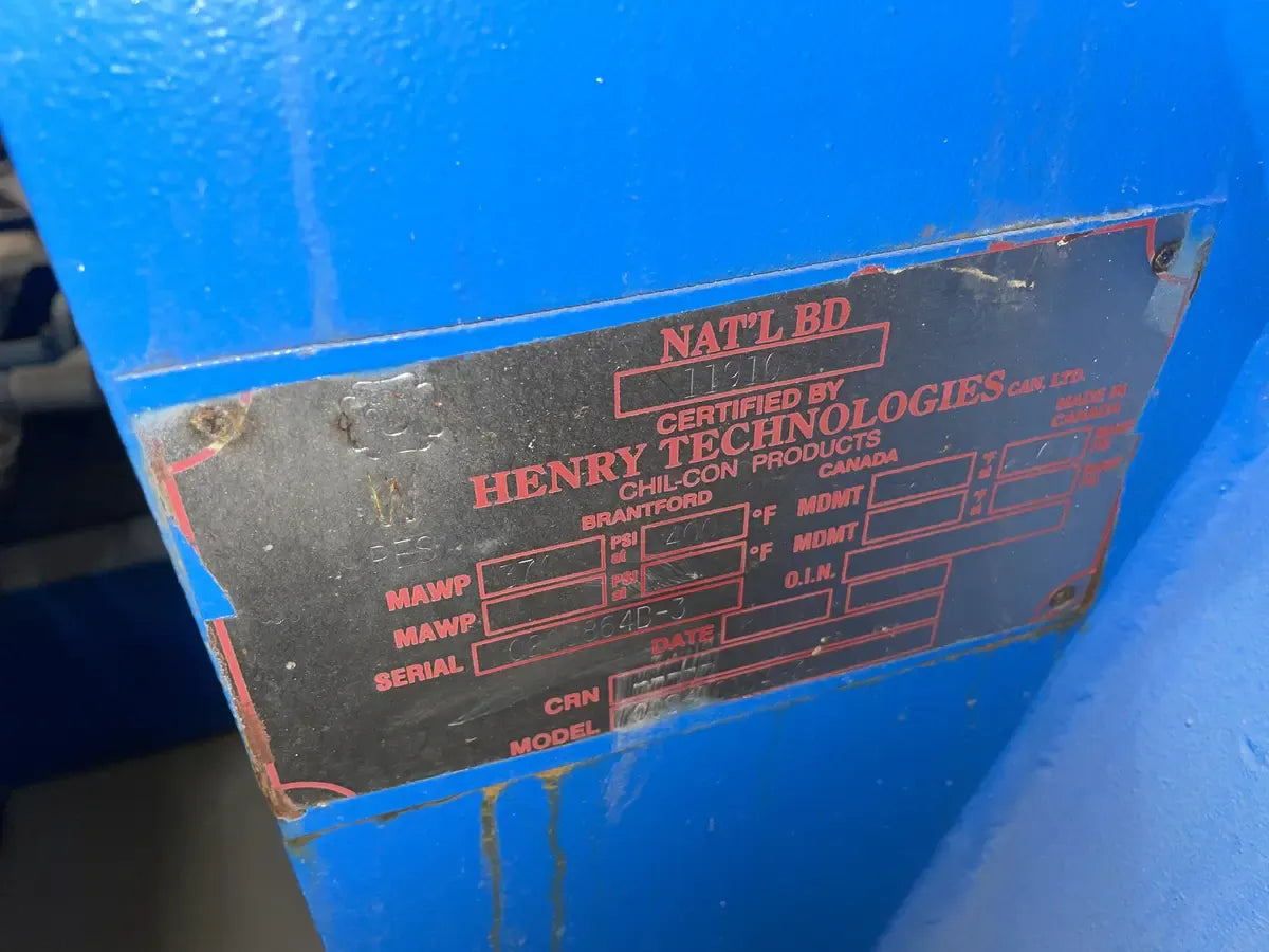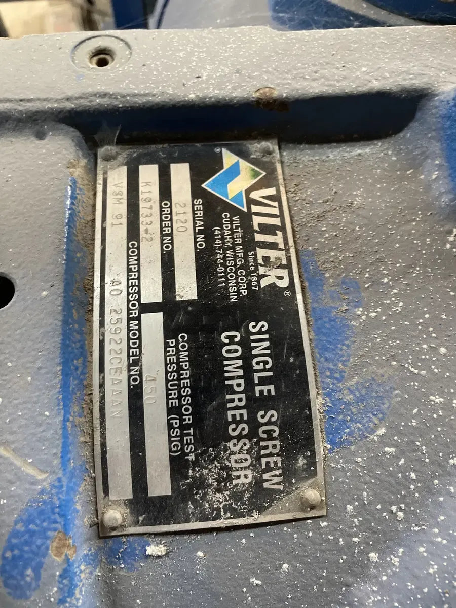 Vilter Chiller Refrigeration Air Conditioning Heat Transfer Unit. Model COS-16104-740, Serial C200864B-3. Single Screw Compressor - Model#: VSM 91 AO 25922CEAAAN, Serial#: 2120, Order#: K19733-2, Compressor Test Pressure: 450 PSIG National Board 11910, Maximum Allowable Pressure 370 PSI at 400F, Minimum Temperature -20F at 370 PSI. Vilter Vission Micro-controller. Benshaw Starter. Motor: Lincoln Motor, Model SD2P50TSC61Y, 50HP, 3550 RPM, 230/460V, 112/56 AMPS, 3 Phase, 60 Hz, ODP Enclosure, 324TSC Frame.
