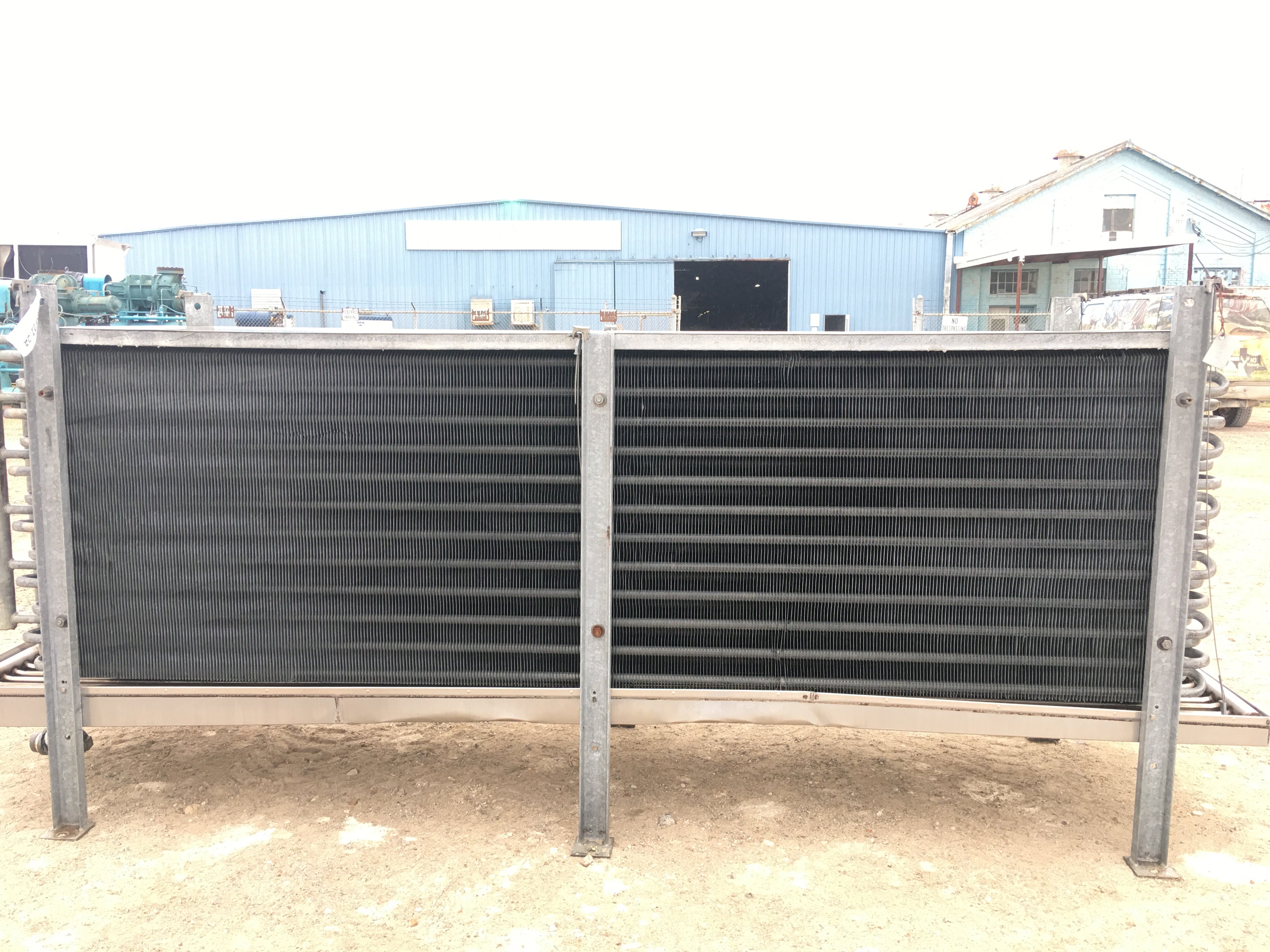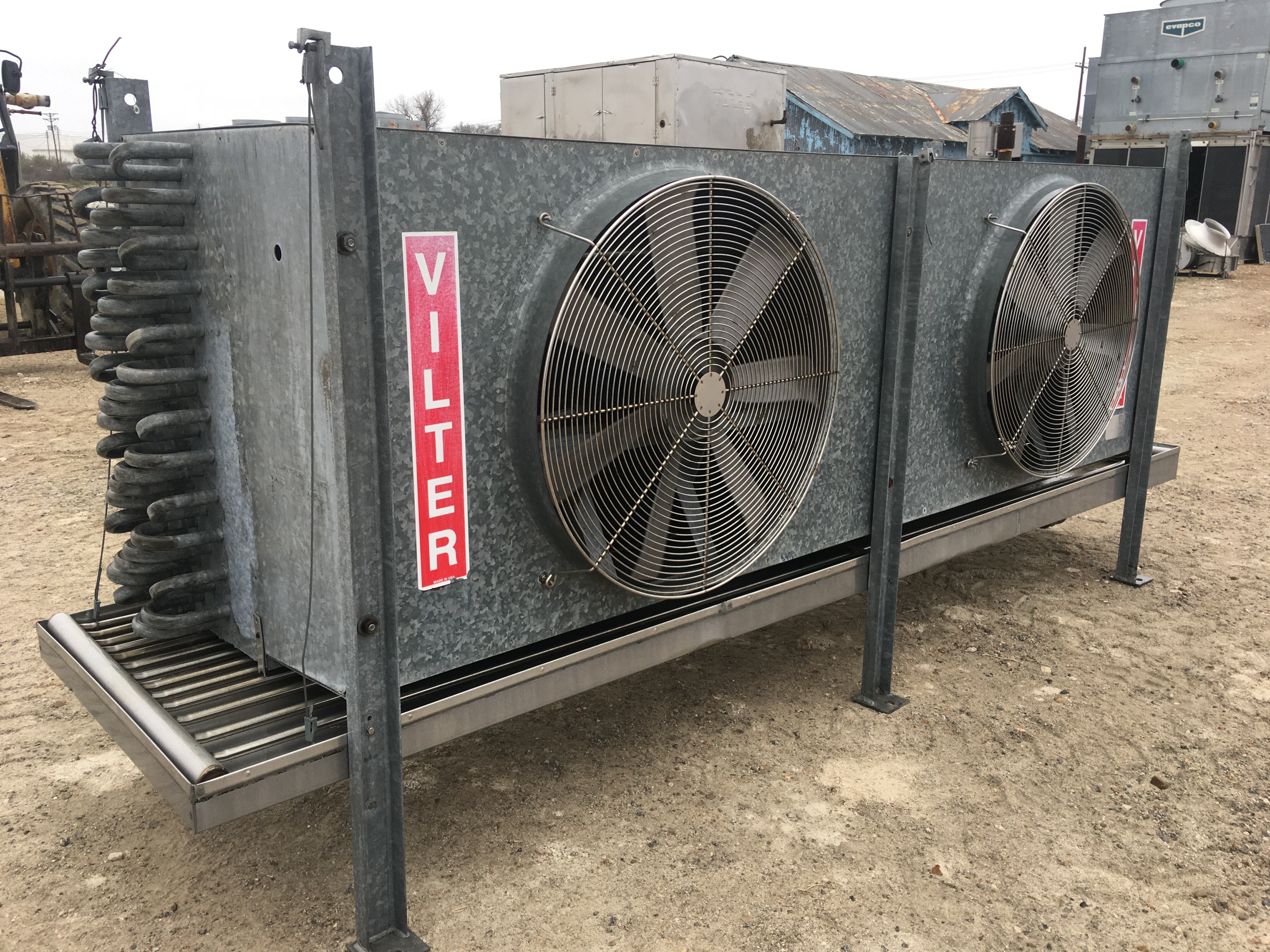 Vilter HP-28-63 Ammonia Evaporator Coil- 13 TR, 2 Fans (Low Temperature) This evaporator runs with Low Temperature frosted coils. It has a capacity of 10400 (BTUH / °F TD) with an estimated tonnage of 13(TR) @15TD. An Airflow of 19000 CFM and a face velocity of 680 FPM. It has recirculated bottom fed coils with a gas defrost system. It previous ran on Ammonia, but can be configured to use Freon. Included are 2 1 HP fan motors.