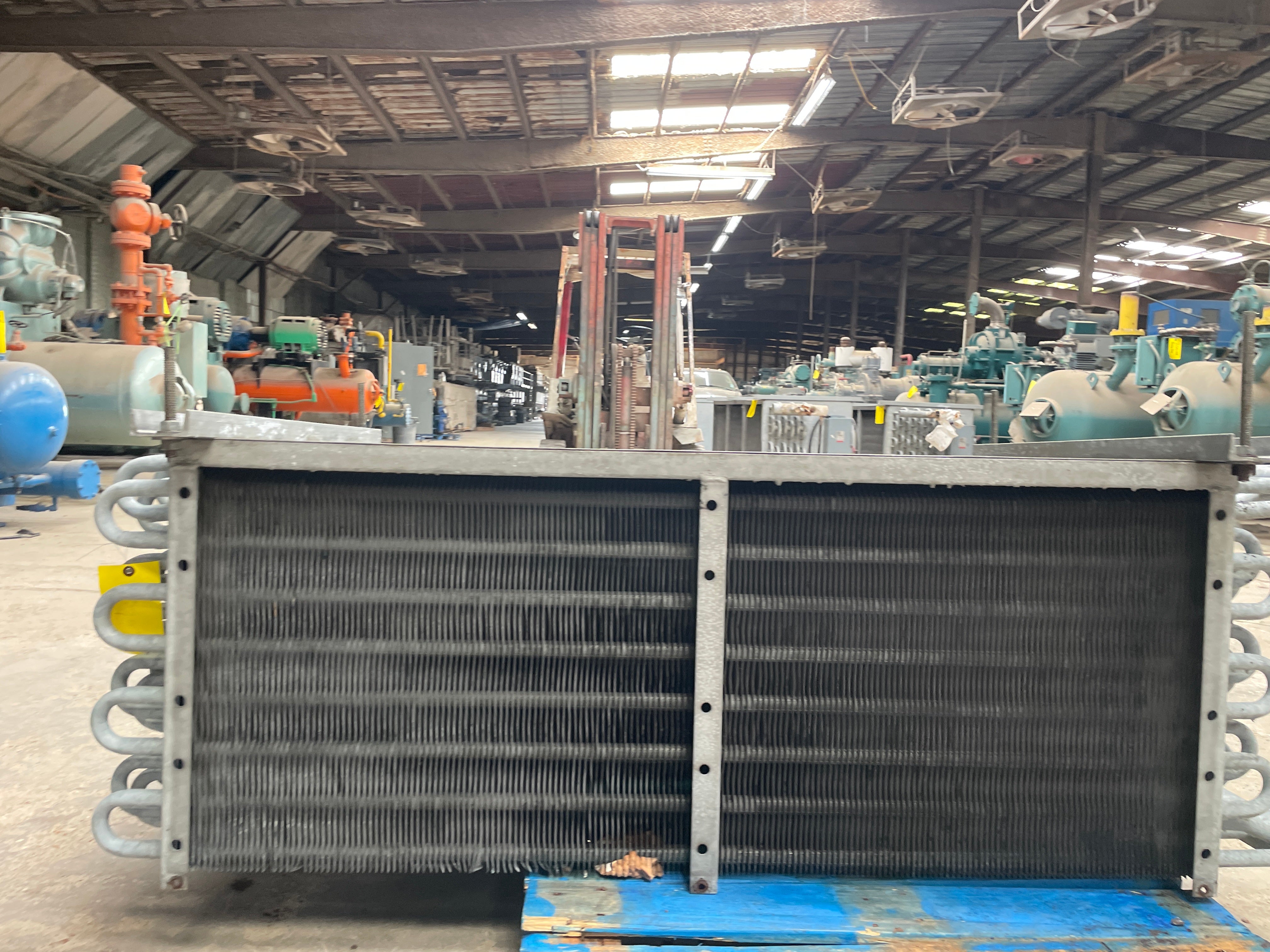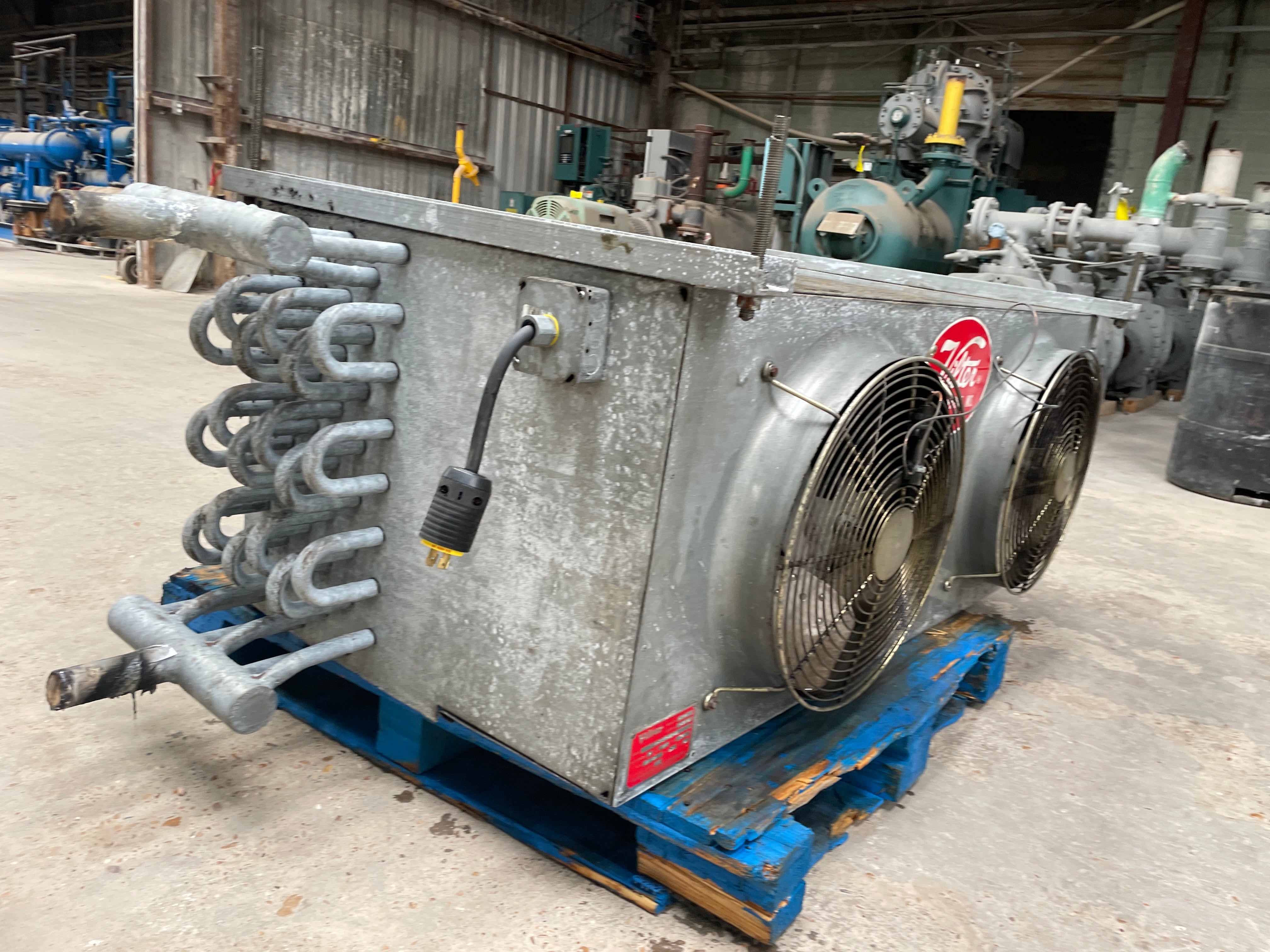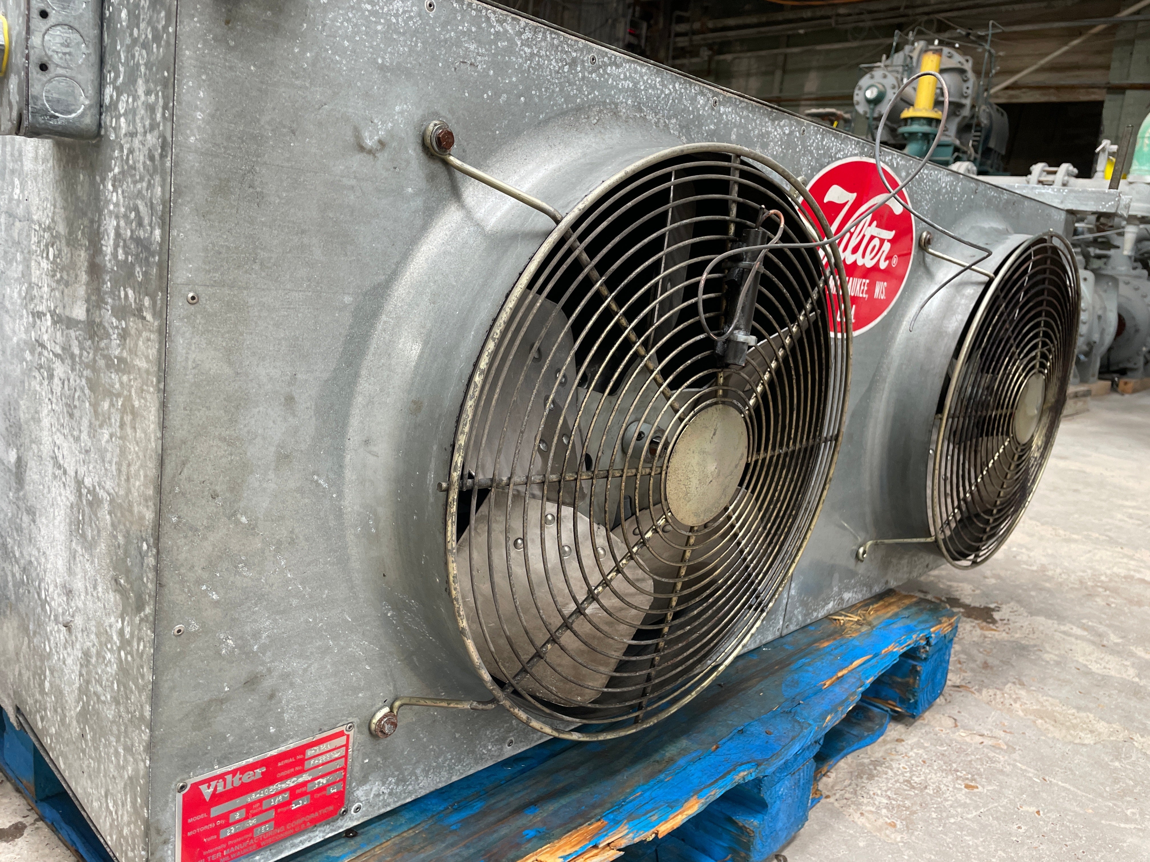 Vilter LP-10-63-1/3-FA Ammonia Evaporator Coil - 5 TR 2 Fans (Low Temperature) This evaporator runs with Low Temperature frosted coils. It has a capacity of 3900 (BTUH / °F TD) with an estimated tonnage of 5(TR) @15TD. An Airflow of 7200 CFM and a face velocity of 720 FPM. It uses flooded top fed coils with a gas defrost system. It previous ran on Ammonia. Included are 2 0.3HP fan motors.