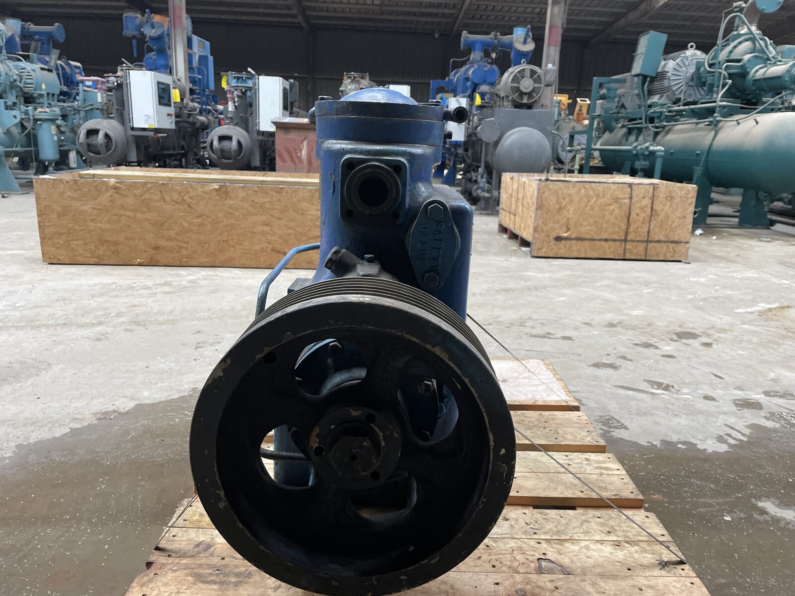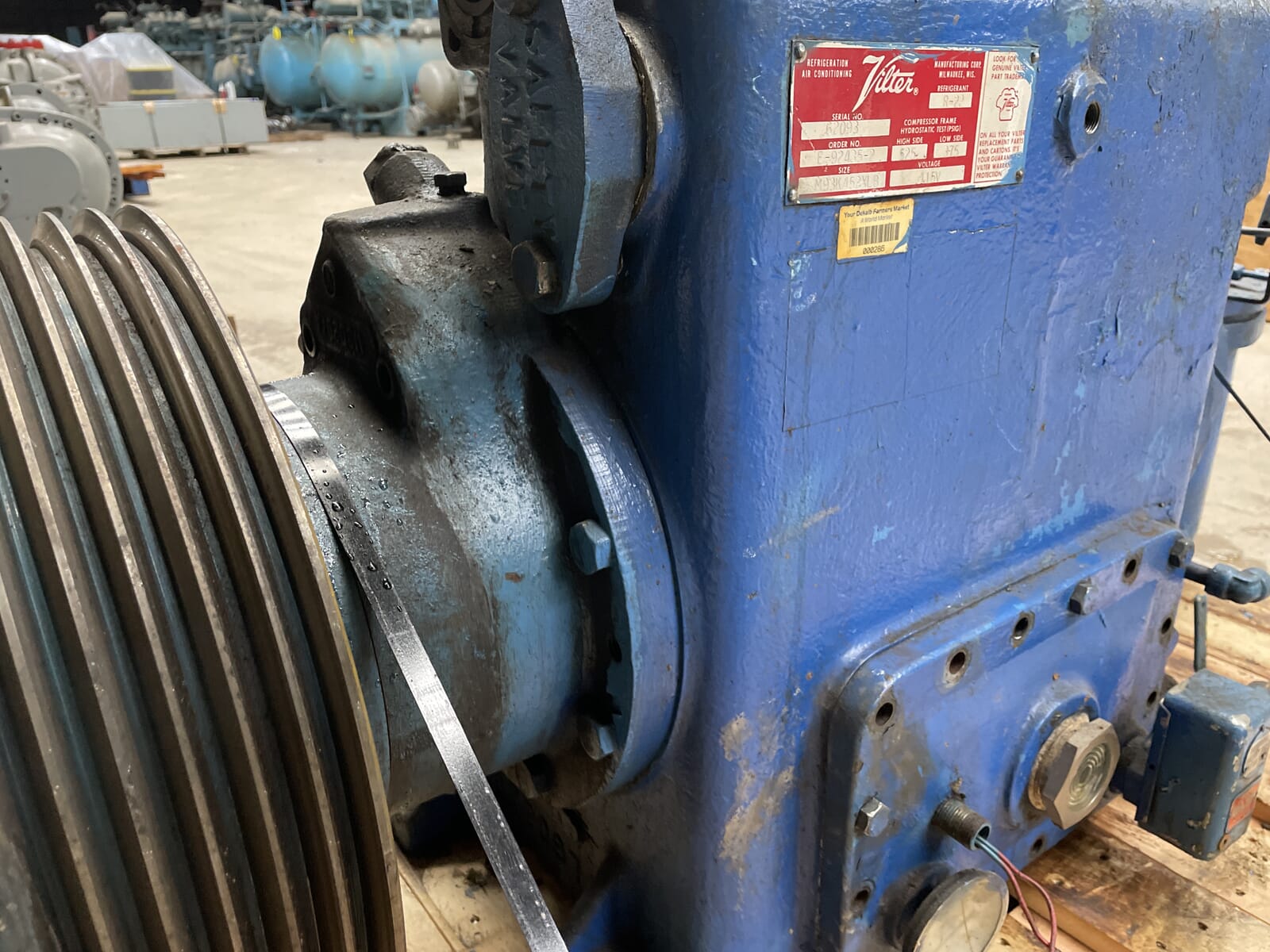 Vilter 2-Cylinder belt-driven reciprocating compressor. Serial No: 62093, Order No: F-92435-2, Size: M93K452XLB. Refrigerant: R-22. Compressor Frame Hydrostatic Test(PSIG) - High side: 525, Low Side: 375. Voltage: 115v.