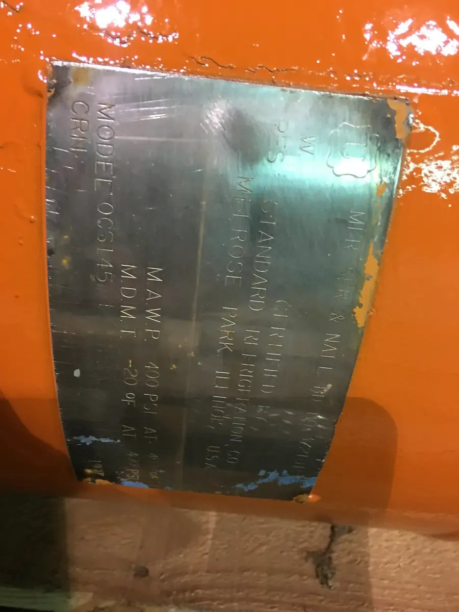 Vilter OCS145 Vertical Oil Separator (12in x 30in. 15 Gallons) Serial Number: 372101. Tank National Board Number: 372101. Tank Estimated Capacity (Gallons): 15. Tank MAWP (PSI @ Temp): 400 PSI @ 400F. Tank MAWT (PSI @ Temp): -20F at 400 PSI. Previous Refrigerant was Ammonia (R717 | NH3). Manufactured in 1997. Shipping Dimensions (Inches): 30 x 12 x 12. 382 LB