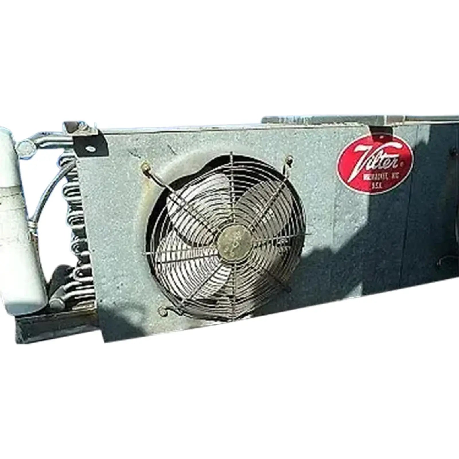 Vilter Recirculated Ammonia Evaporator- 5 Ton. Model: LPS 12-34-1/2-RH-HGP. S/N: B-6472-2. Capacity: 6,100 Btu/TD. Airflow: 8,400 cfm. Liquid temperature: 30 °F. Liquid pressure: 45 psig. Heat transfer surface: 1,578 sq. ft. Coil volume 1.64 cu. ft. Nominal fin spacing: 4 fpi. Fan diameter: 18 in. Galvanized steel housing with. Hot dipped galvanized coil and Frame. Stainless steel drain pan. Motor, 1/2 hp, 1200 rpm, 230/460 amps, 60 Hz, 3 phase. The air unit is ideal for low headroom applications and smaller room sizes and extremely quiet. Inlets: (1) 3/4 in. dia. refrigerant infeed. Outlets: (1) 1-1/2 in. dia. suction port. Overall dimensions: 94 in. L x x41 in. W x 29-1/2 in. H.(H15).