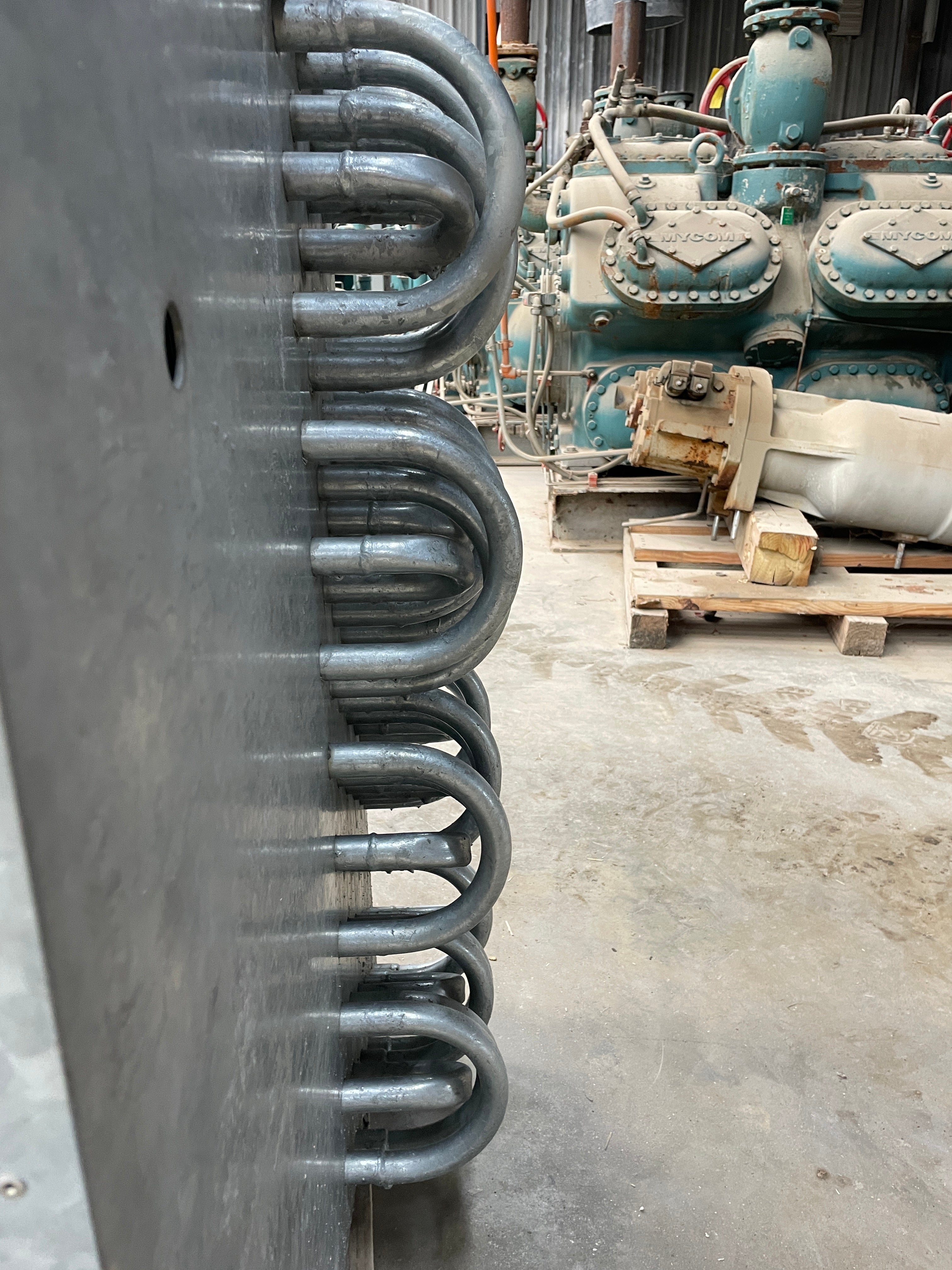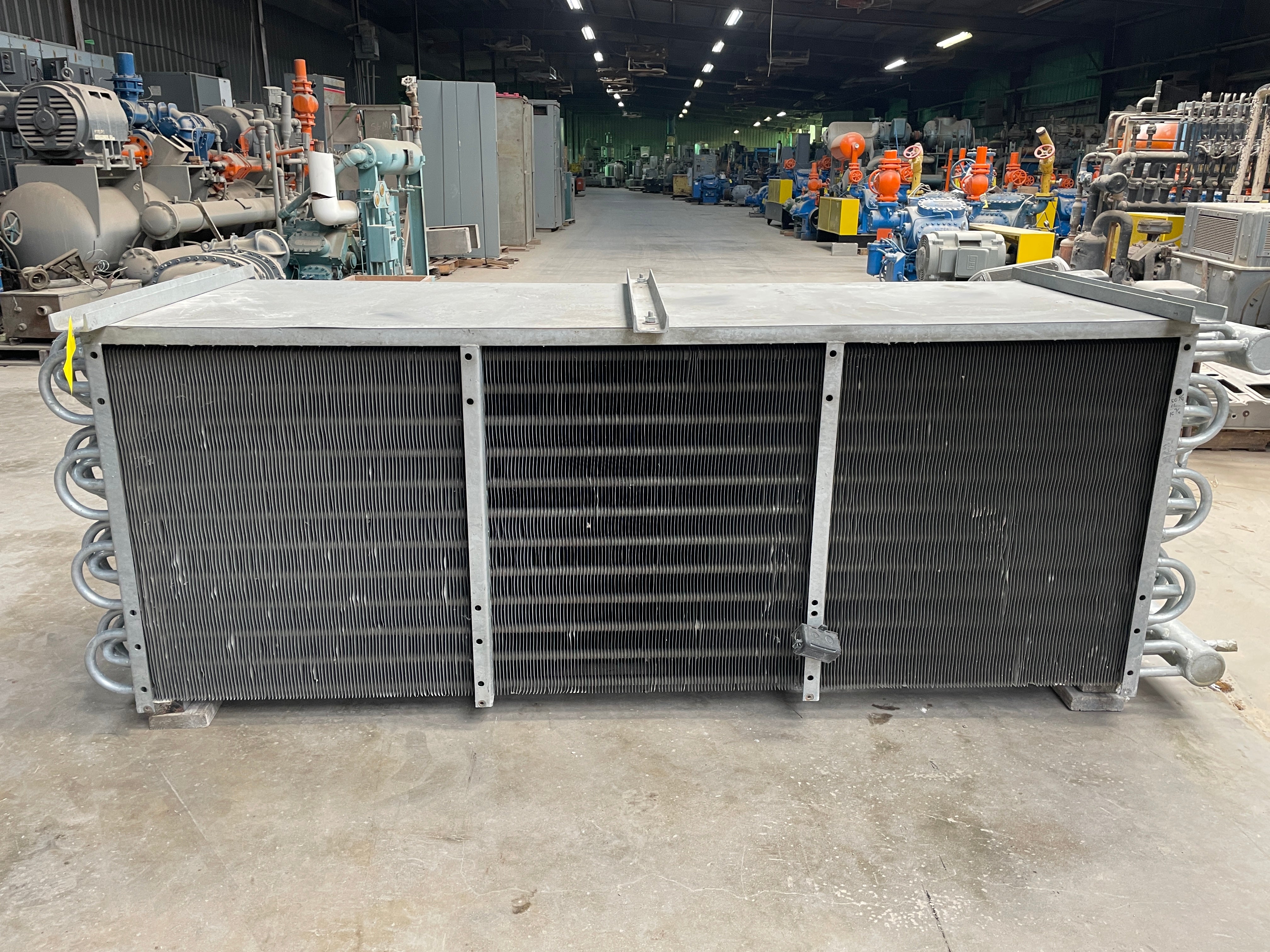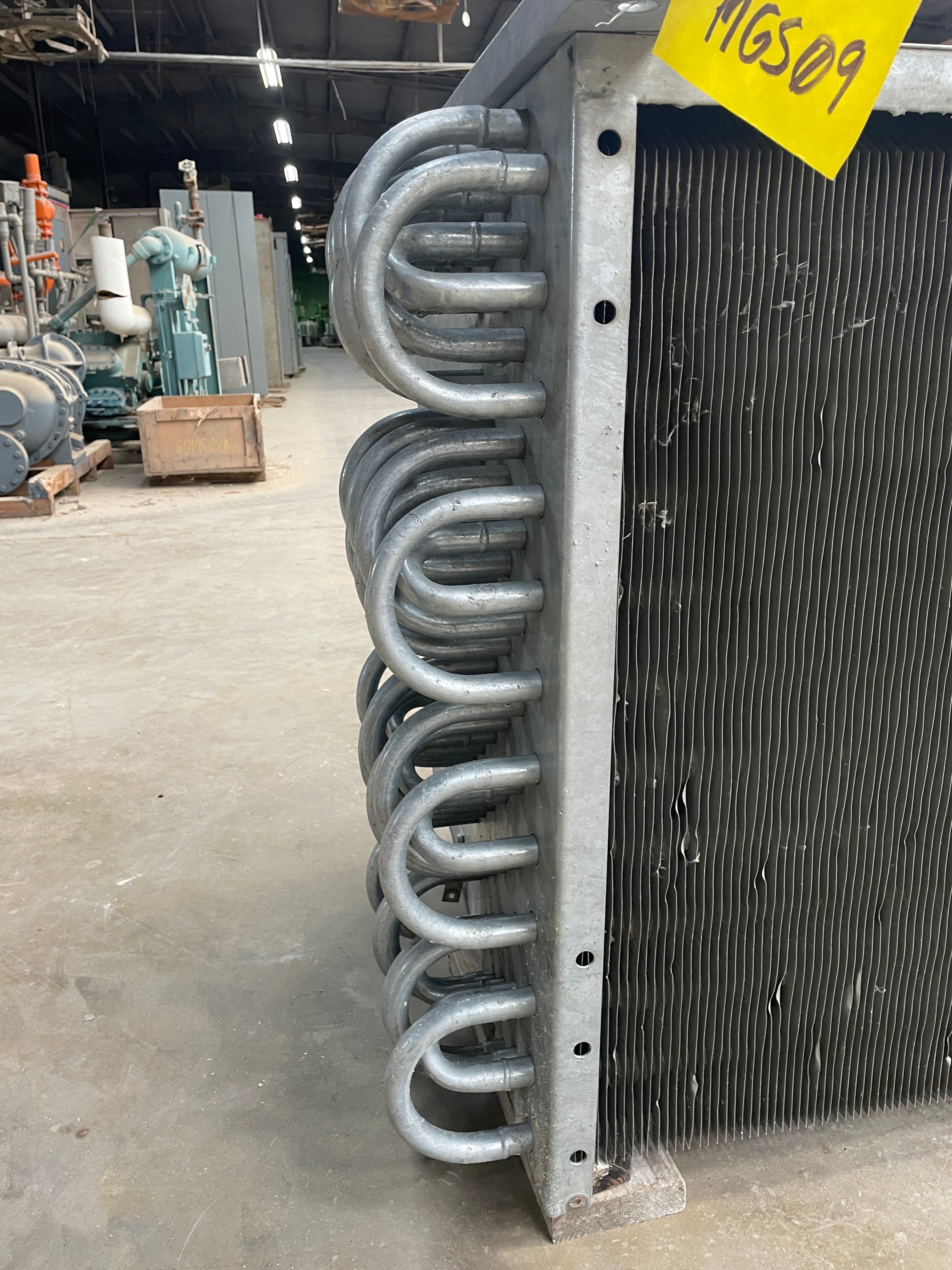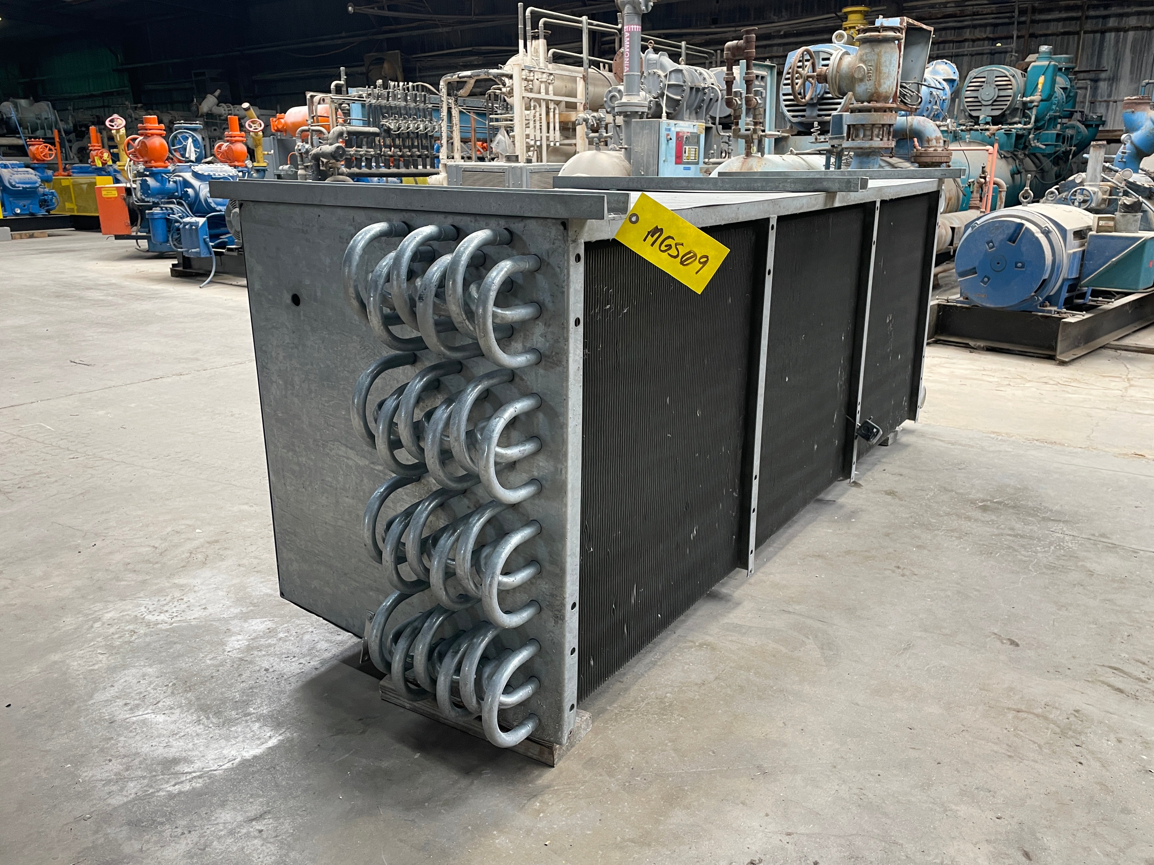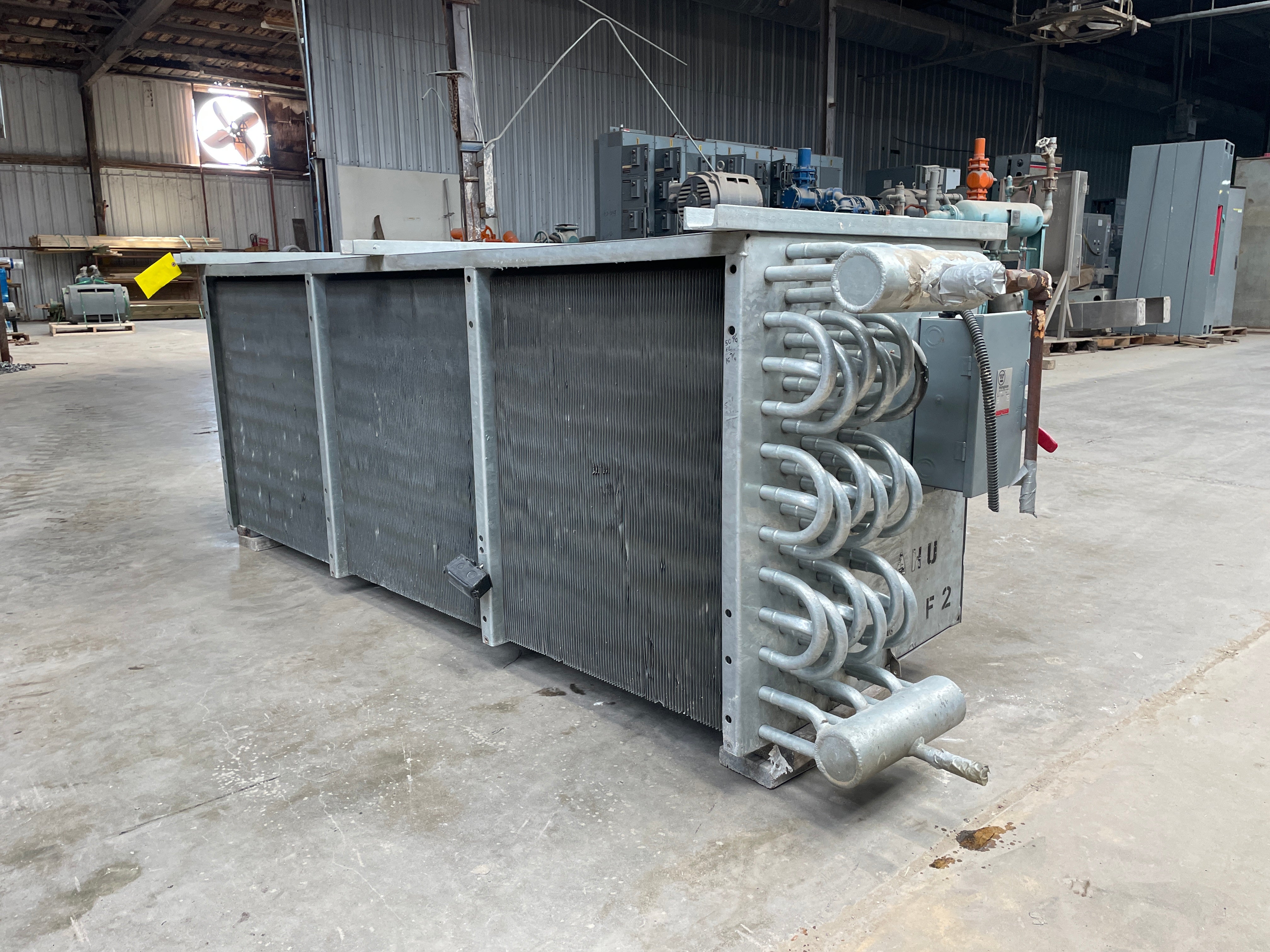 Vilter SC 24-64-1/2-RA-HGC Ammonia Evaporator Coil- 11TR 3 Fans (Low Temperature) This evaporator Coil uses Low Temperature frosted coils. A capacity of 9060 (BTUH / °F TD) and an estimated tonnage of 11(TR) @15TD. An Airflow of 15000 CFM and a face velocity of 625 FPM. Direct Expansion top fed coils with a gas defrost system. This unit was previously ran with Ammonia. The package includes 3 motors for the fans.