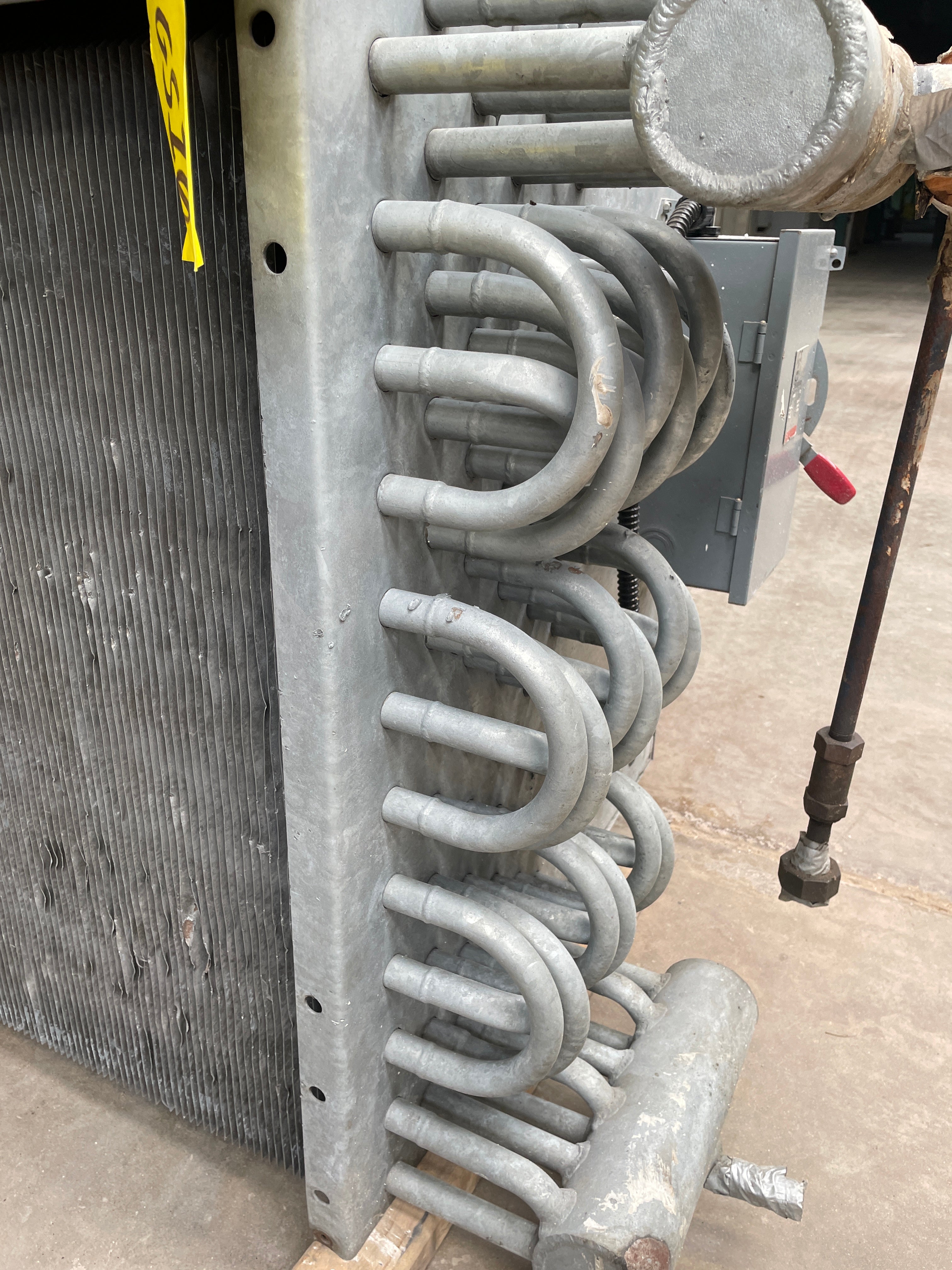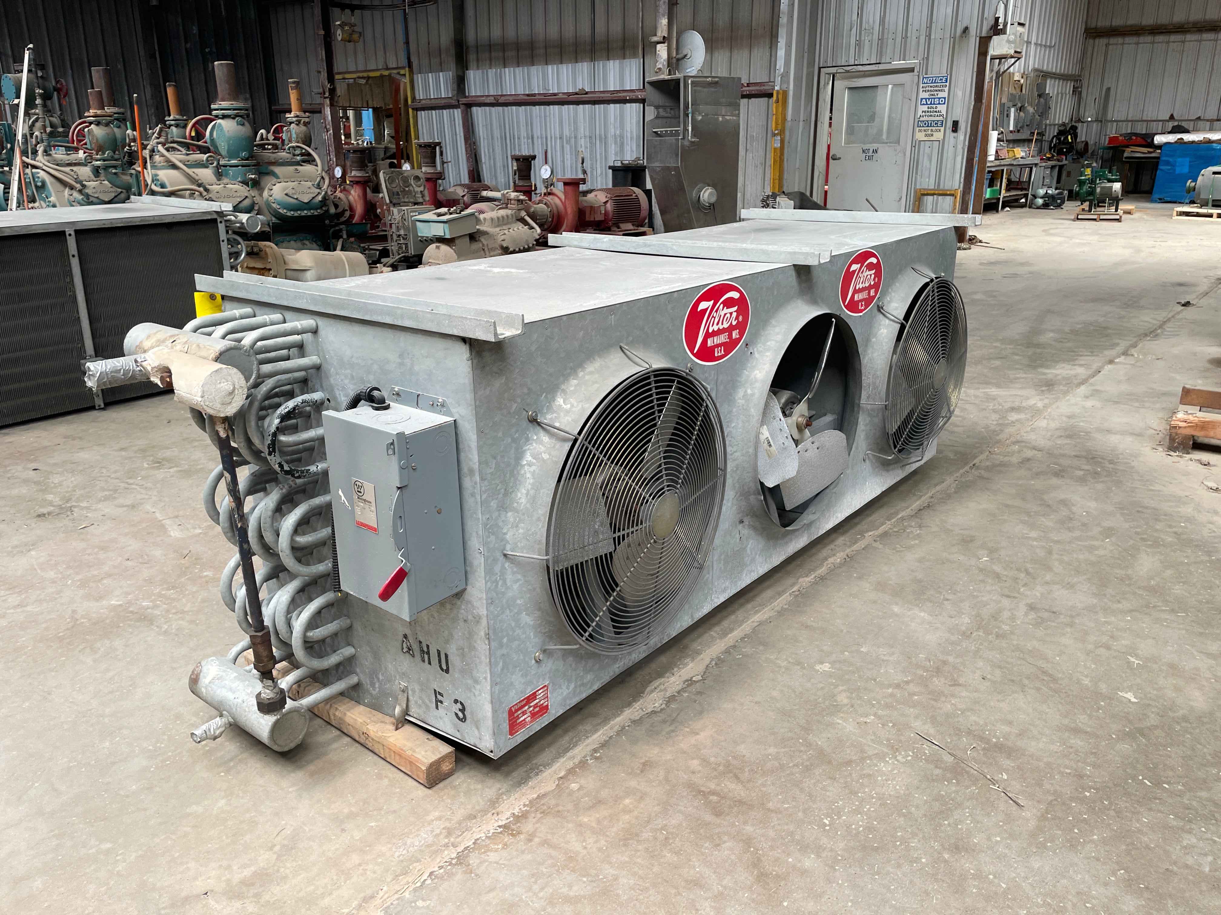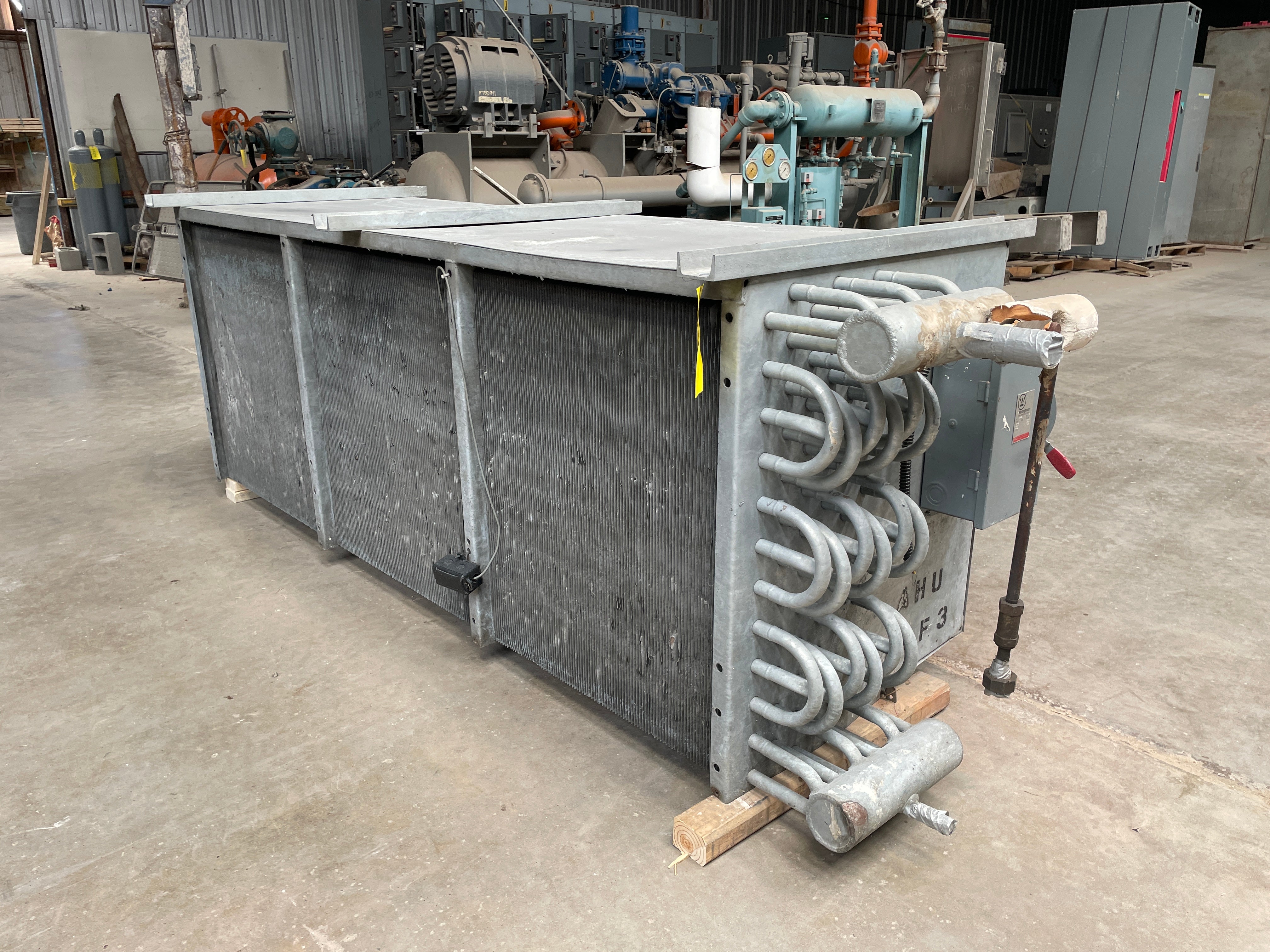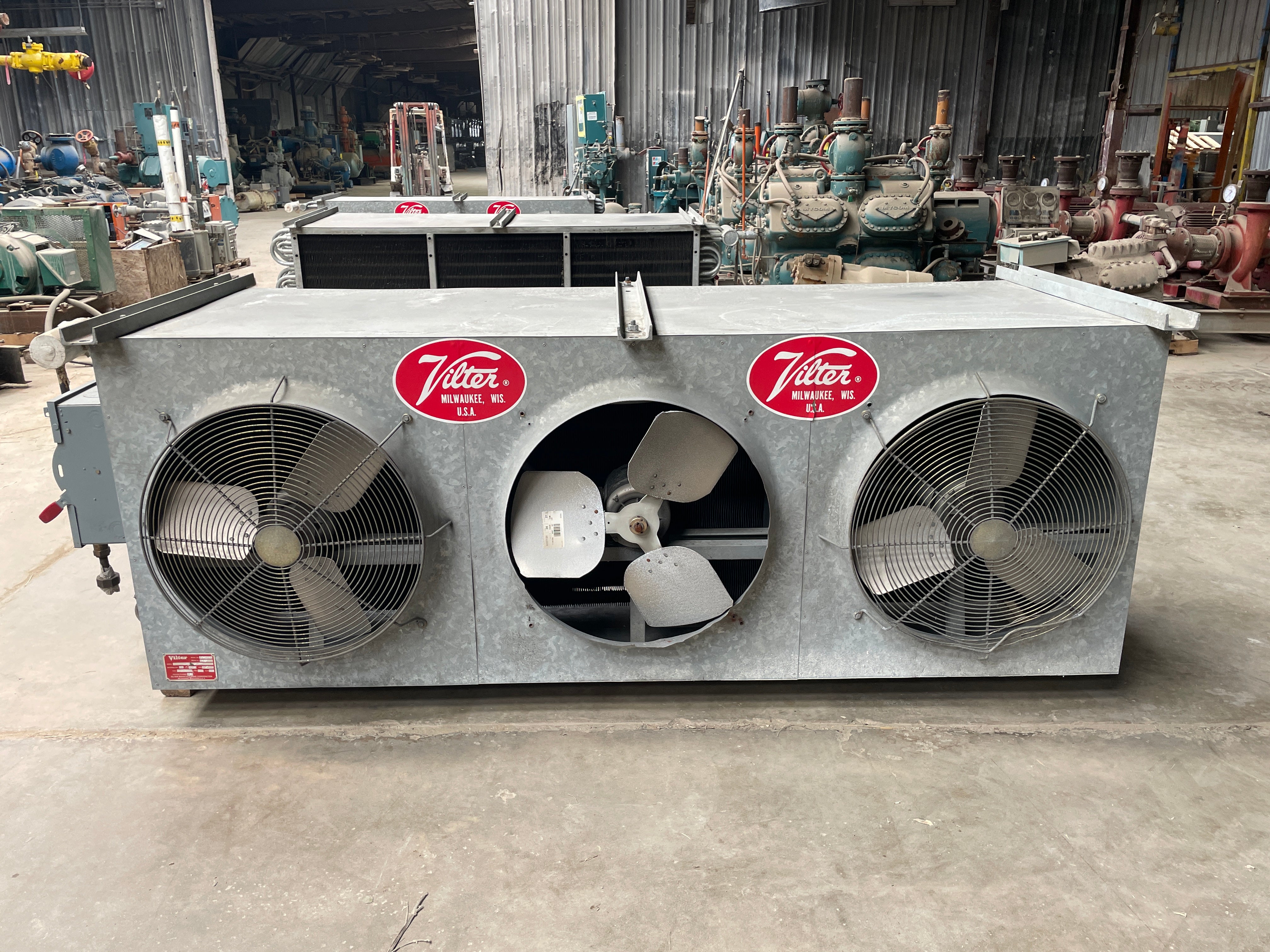 Vilter SC 24-64-1/2-RA-HGC Ammonia Evaporator Coil- 11TR 3 Fans (Low Temperature) This evaporator Coil uses Low Temperature frosted coils. A capacity of 9060 (BTUH / °F TD) and an estimated tonnage of 11(TR) @15TD. An Airflow of 15000 CFM and a face velocity of 625 FPM. Direct Expansion top fed coils with a gas defrost system. This unit was previously ran with Ammonia. The package includes 3 motors for the fans.