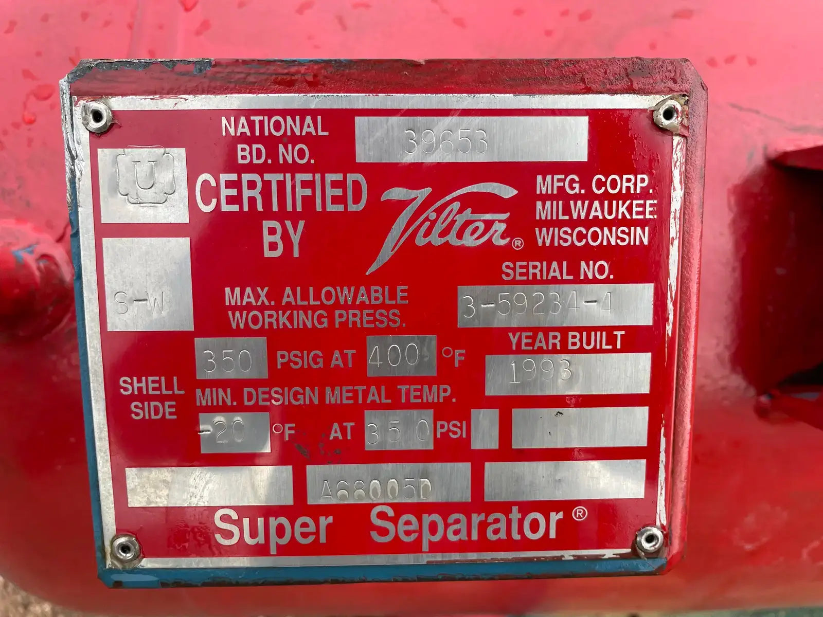 Vilter Vertical Super Separator. National Board: 39653. Serial No: 3-59234-4. Year Built: 1993. Max Allowable Working Pressure: 350 PSIG @ 400 F. Min.Design Metal Temperature: -20 F @ 350 PSI.