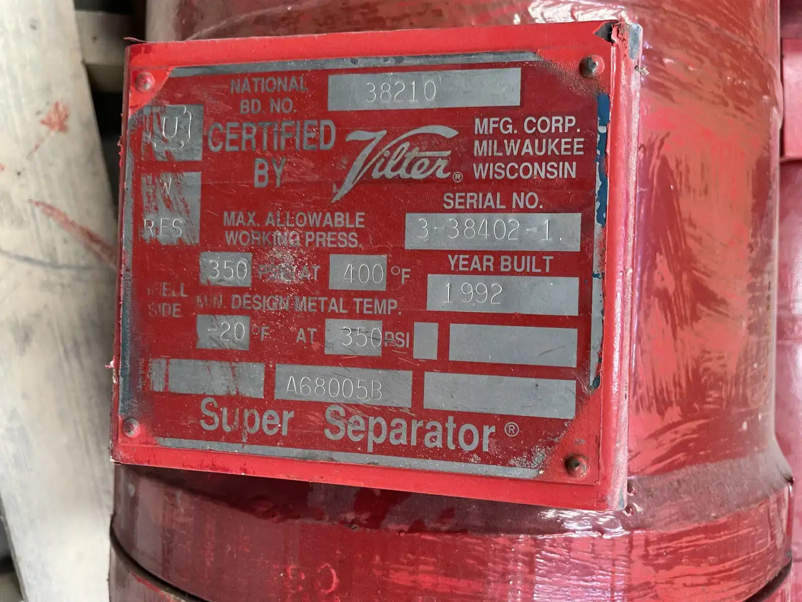Vilter Super Separator Series Oil Tank. Model: Super Separator. Serial No:3-38402-1. National Board: 38210. MAWP: 350 PSI @ 400 F. MDMT: -20 F @ 350 PSI. Year Built: 1992. Inlet/Outlet Size: 2.5 in.