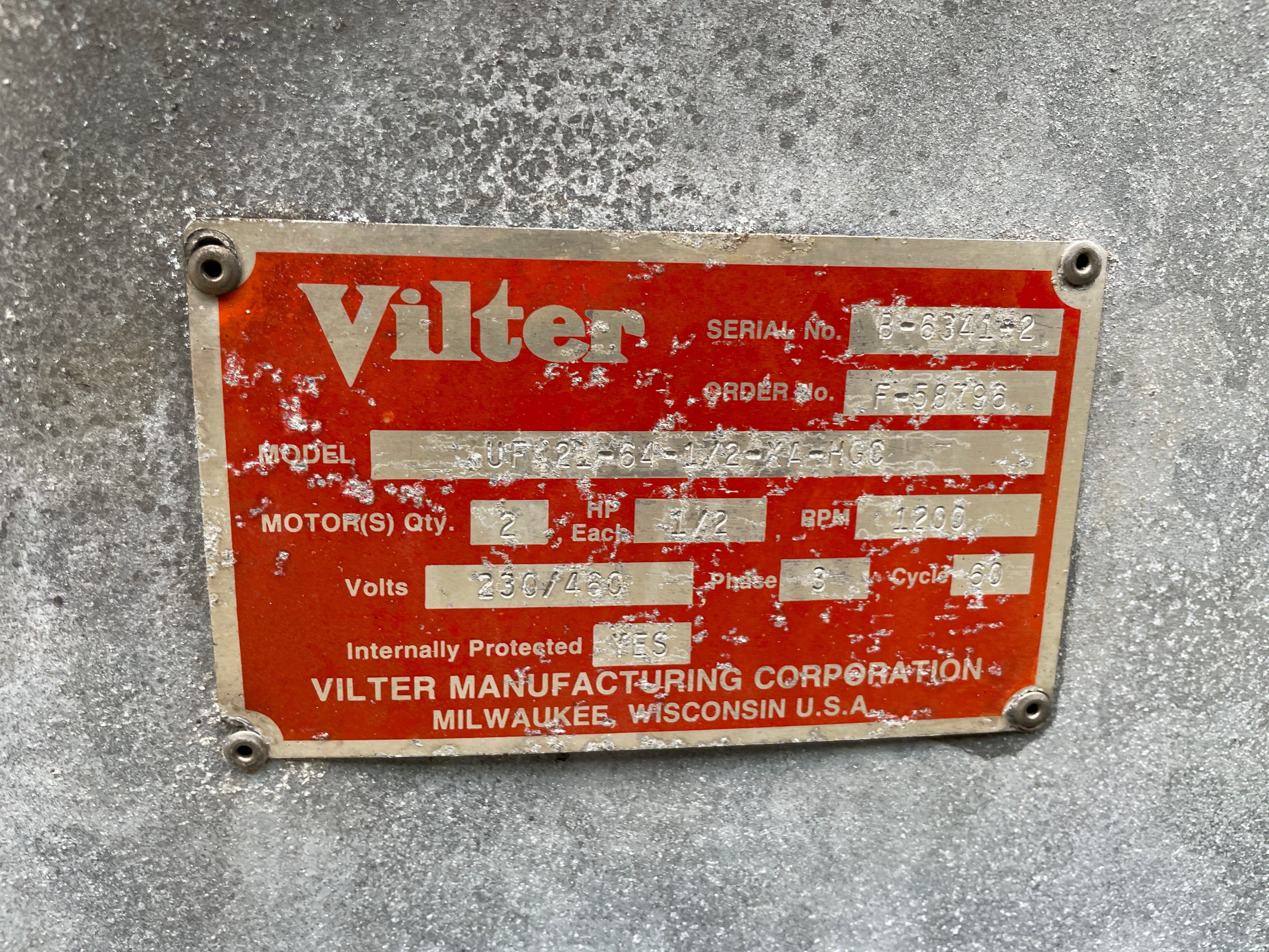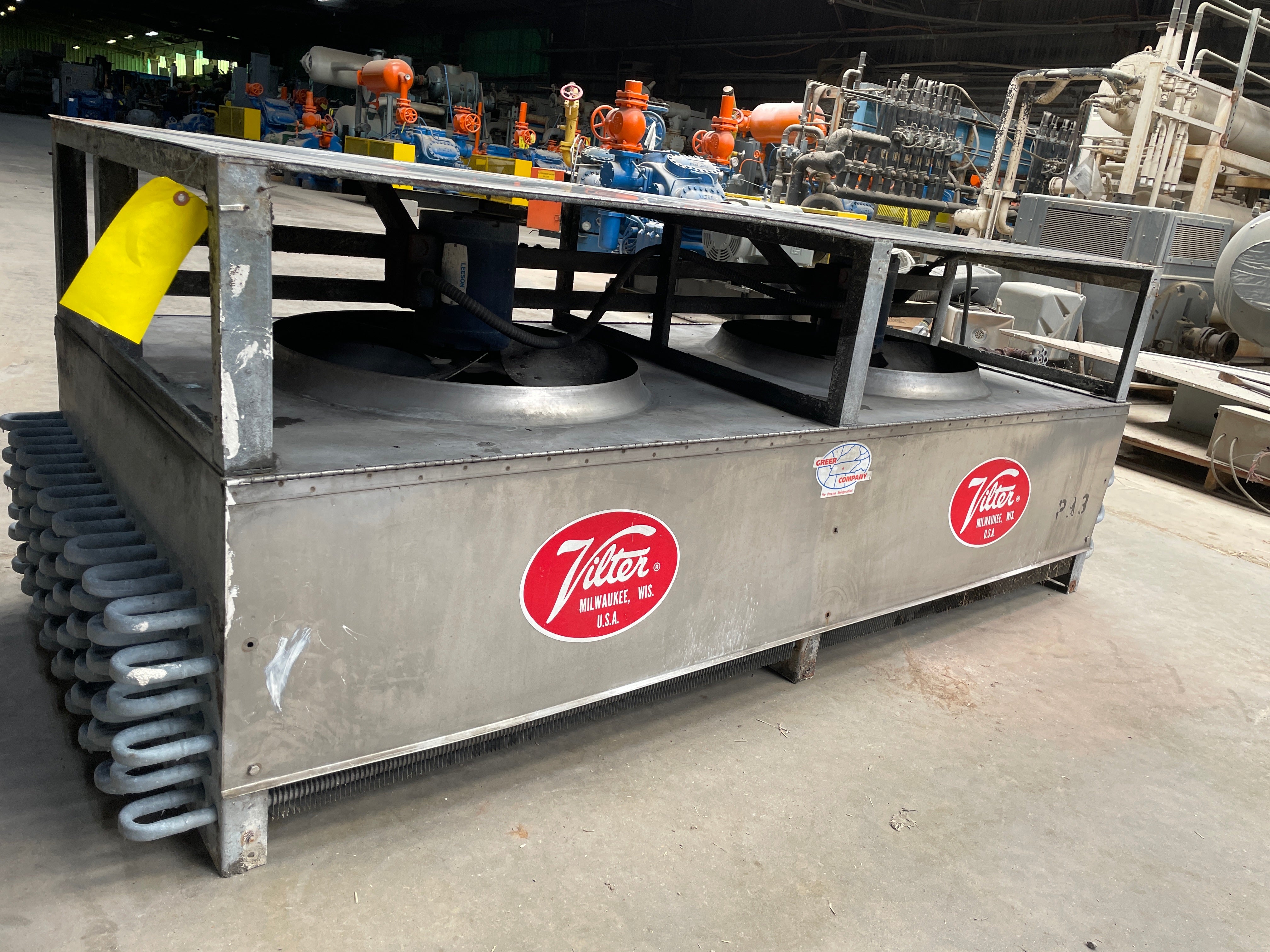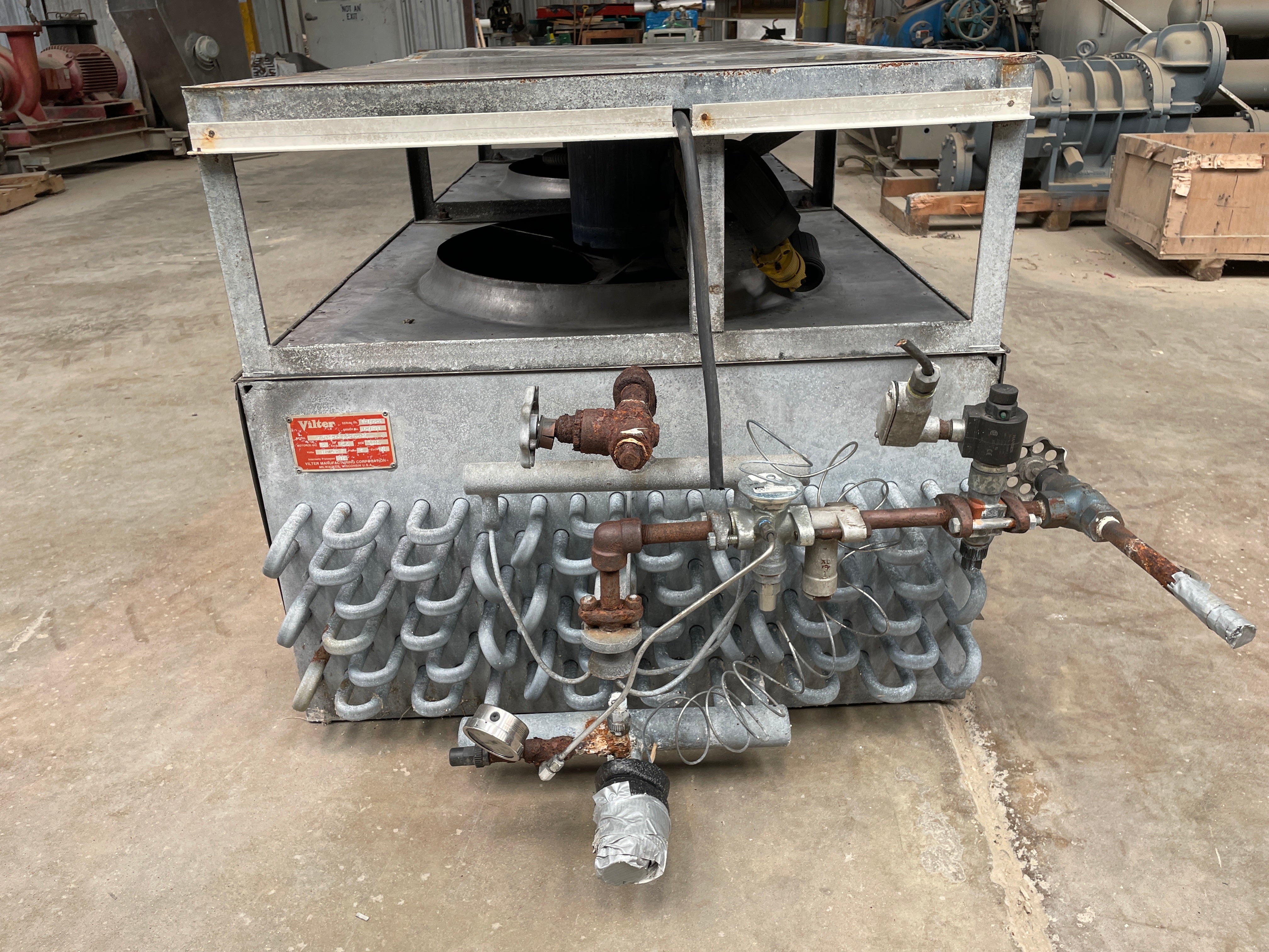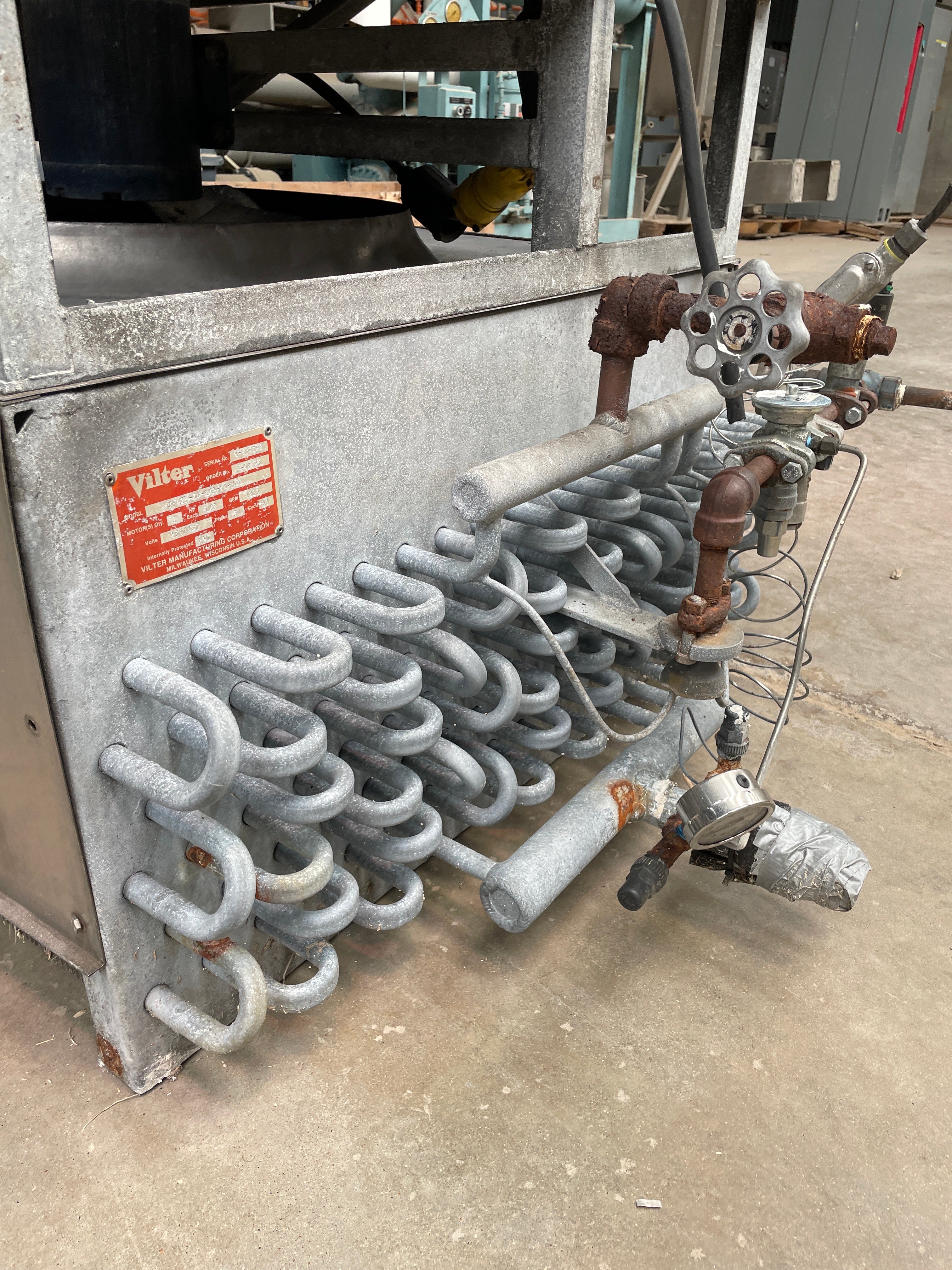 Vilter UF 21-64-1-2-XA-HGC Ammonia Evaporator Coil - 9 TR, 2 Fans (Low Temperature) This evaporator Coil uses Low Temperature frosted coils. A capacity of 7560 (BTUH / °F TD) and an estimated tonnage of 9(TR) @15TD. An Air Flow of 11600CFM and a face velocity of 550 FPM. Direct Expansion top fed coils with a gas defrost system. This unit was previously ran with Ammonia. The package includes 2 motors for the fans.