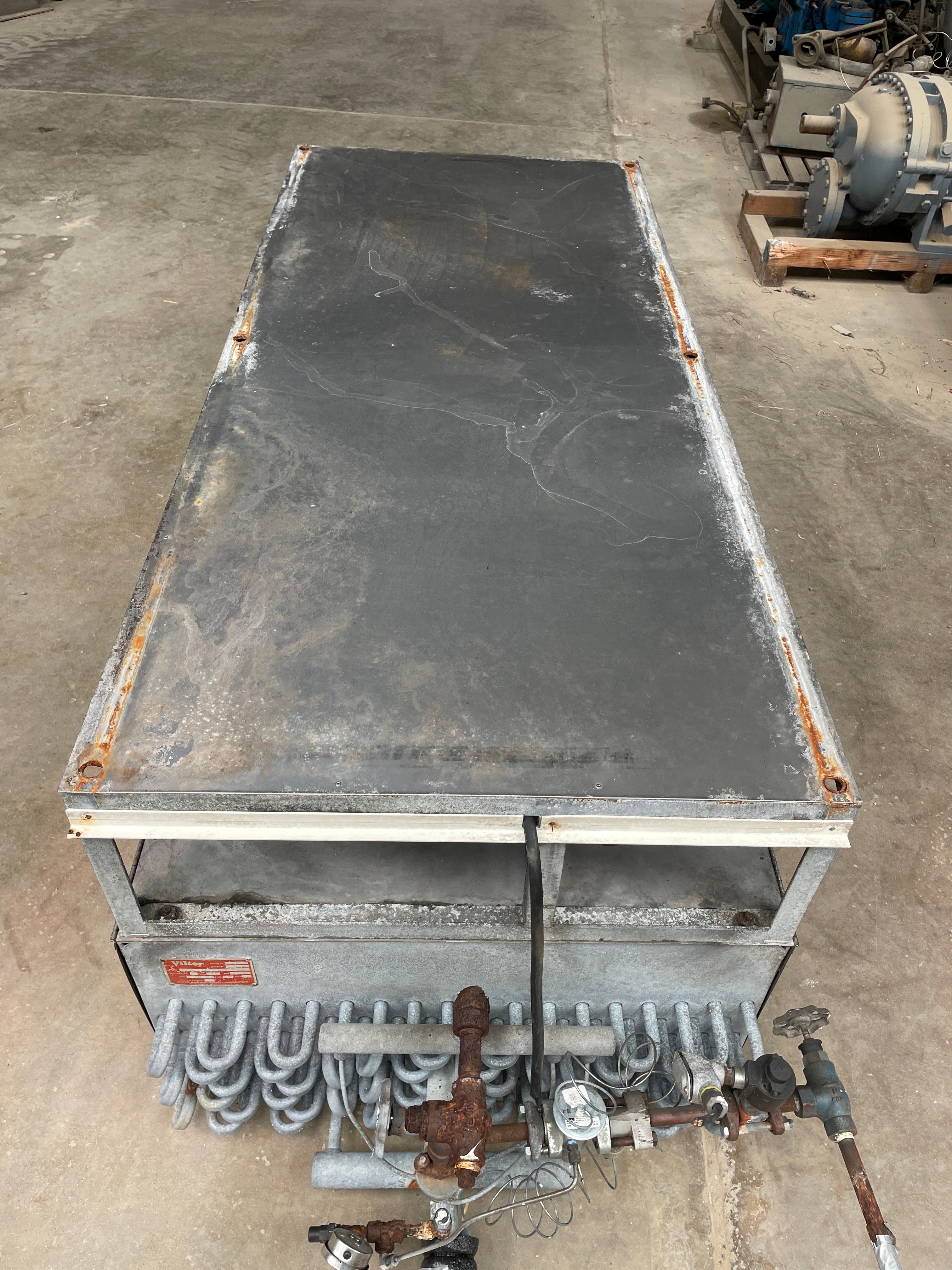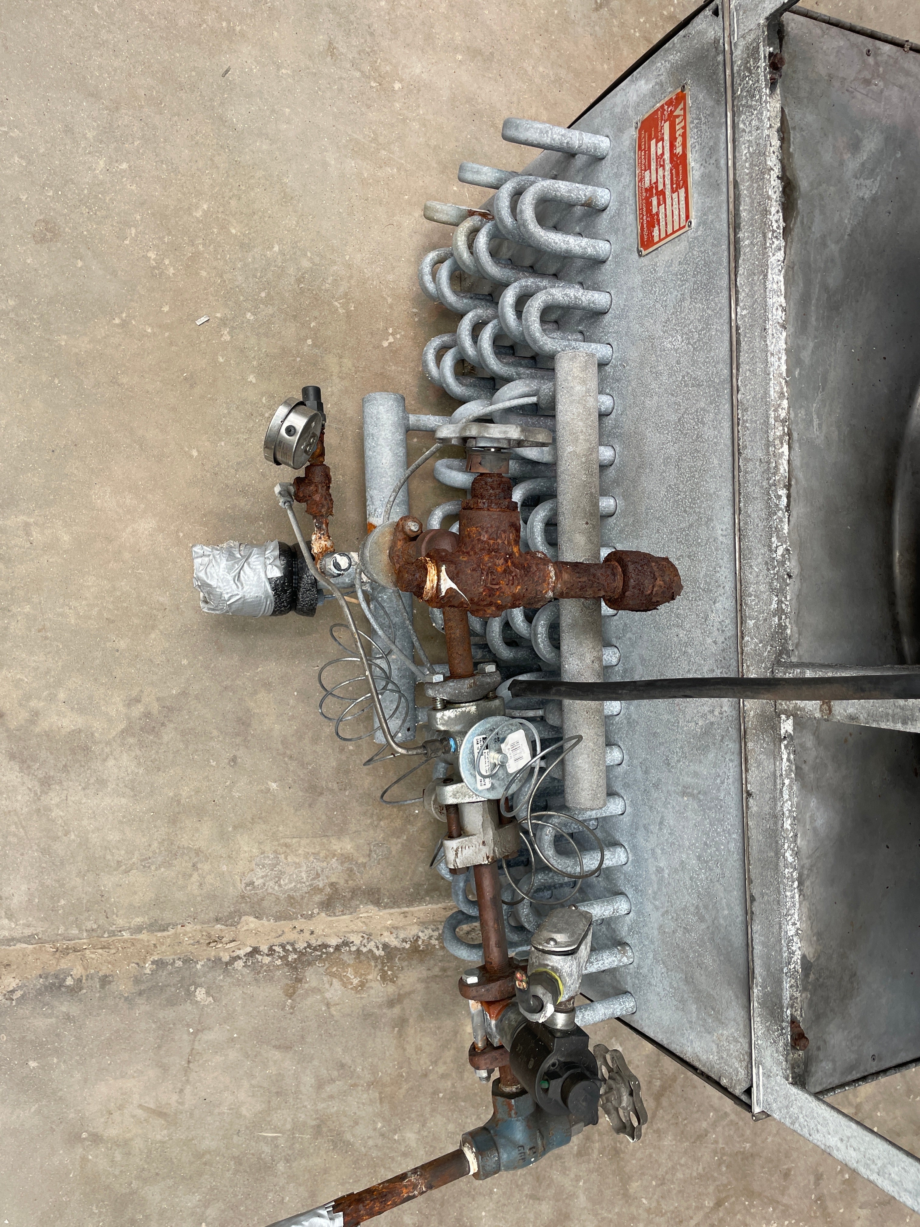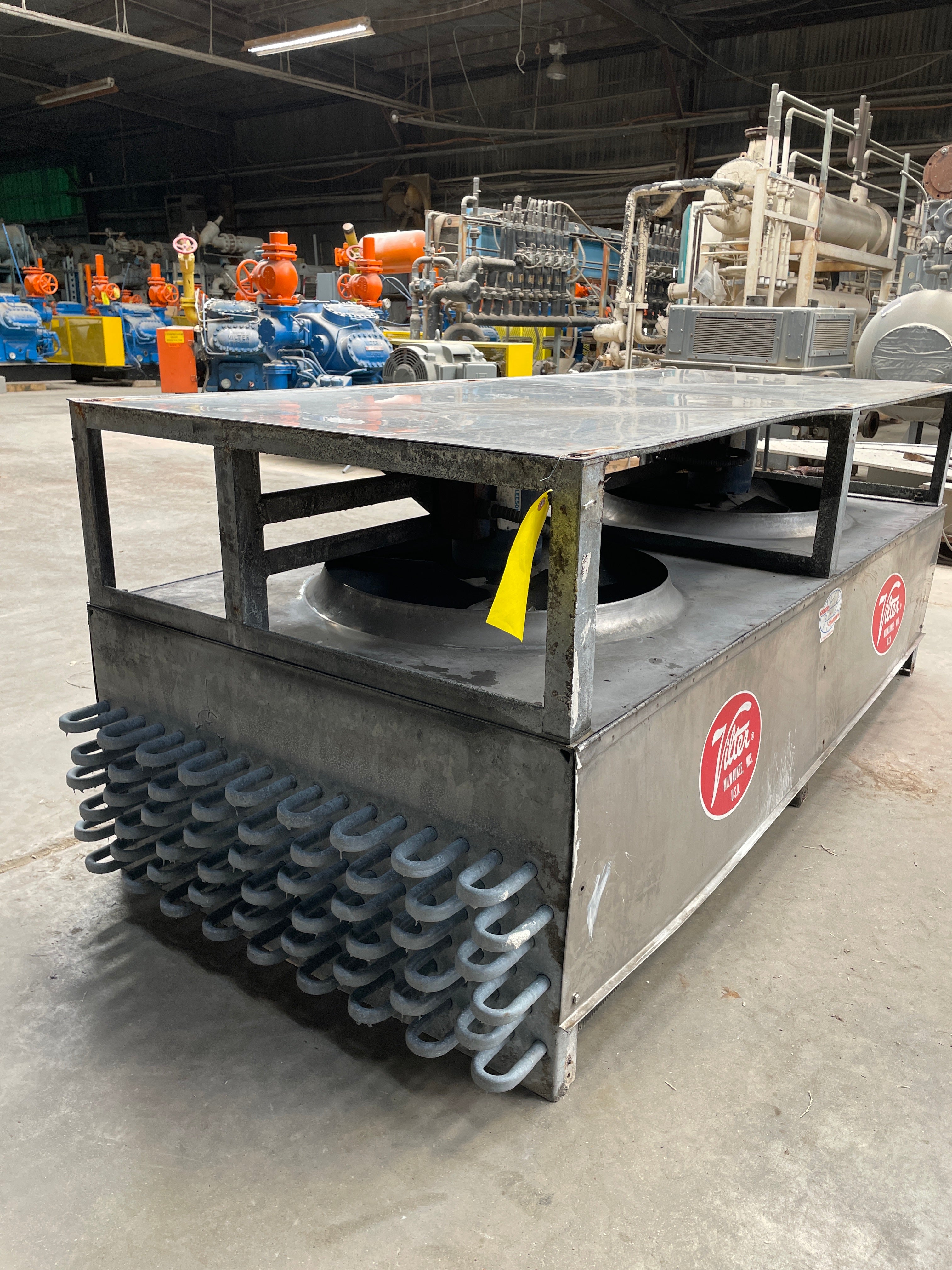 Vilter UF 21-64-1-2-XA-HGC Ammonia Evaporator Coil - 9 TR, 2 Fans (Low Temperature) This evaporator Coil uses Low Temperature frosted coils. A capacity of 7560 (BTUH / °F TD) and an estimated tonnage of 9(TR) @15TD. An Air Flow of 11600CFM and a face velocity of 550 FPM. Direct Expansion top fed coils with a gas defrost system. This unit was previously ran with Ammonia. The package includes 2 motors for the fans.
