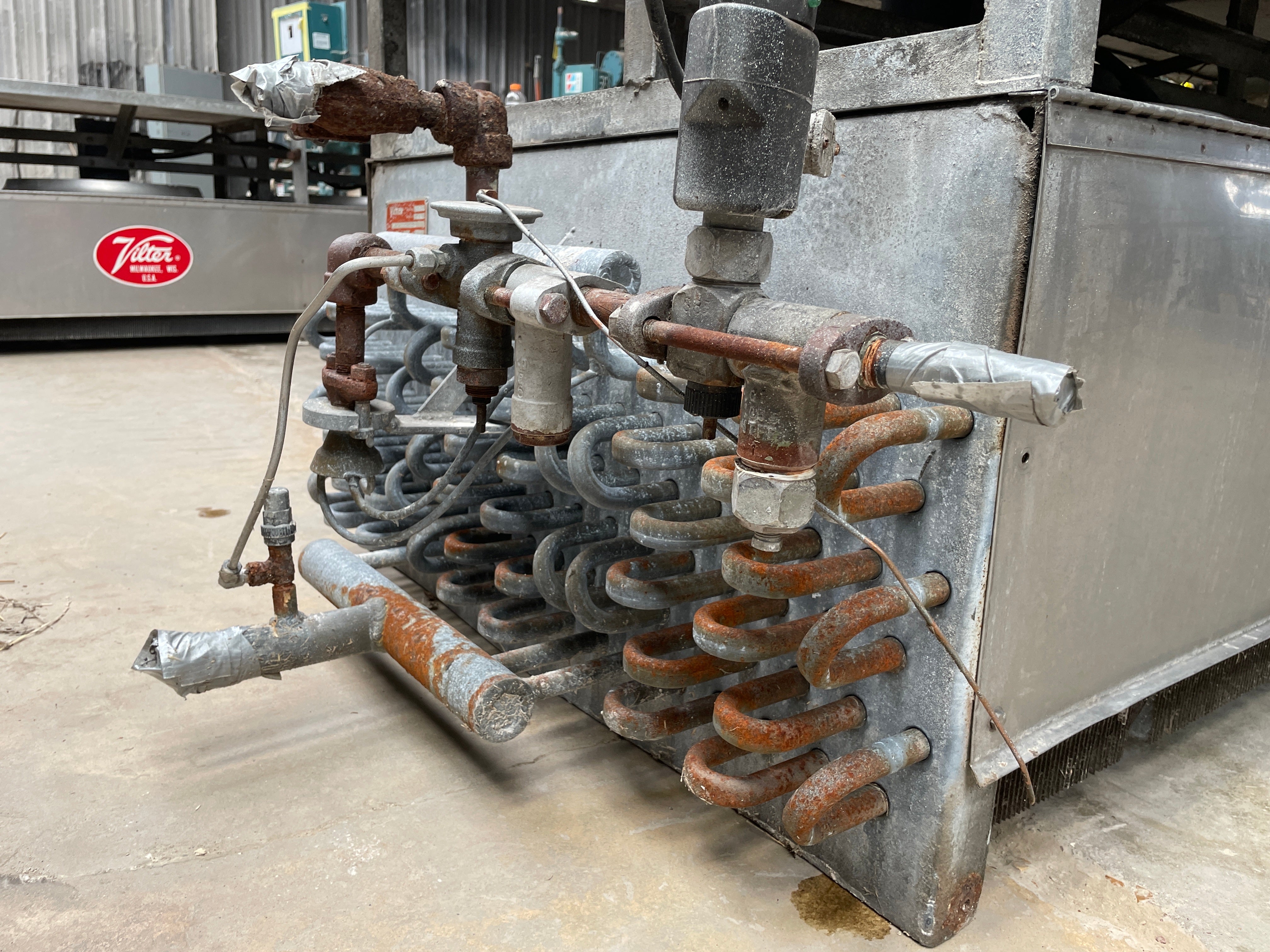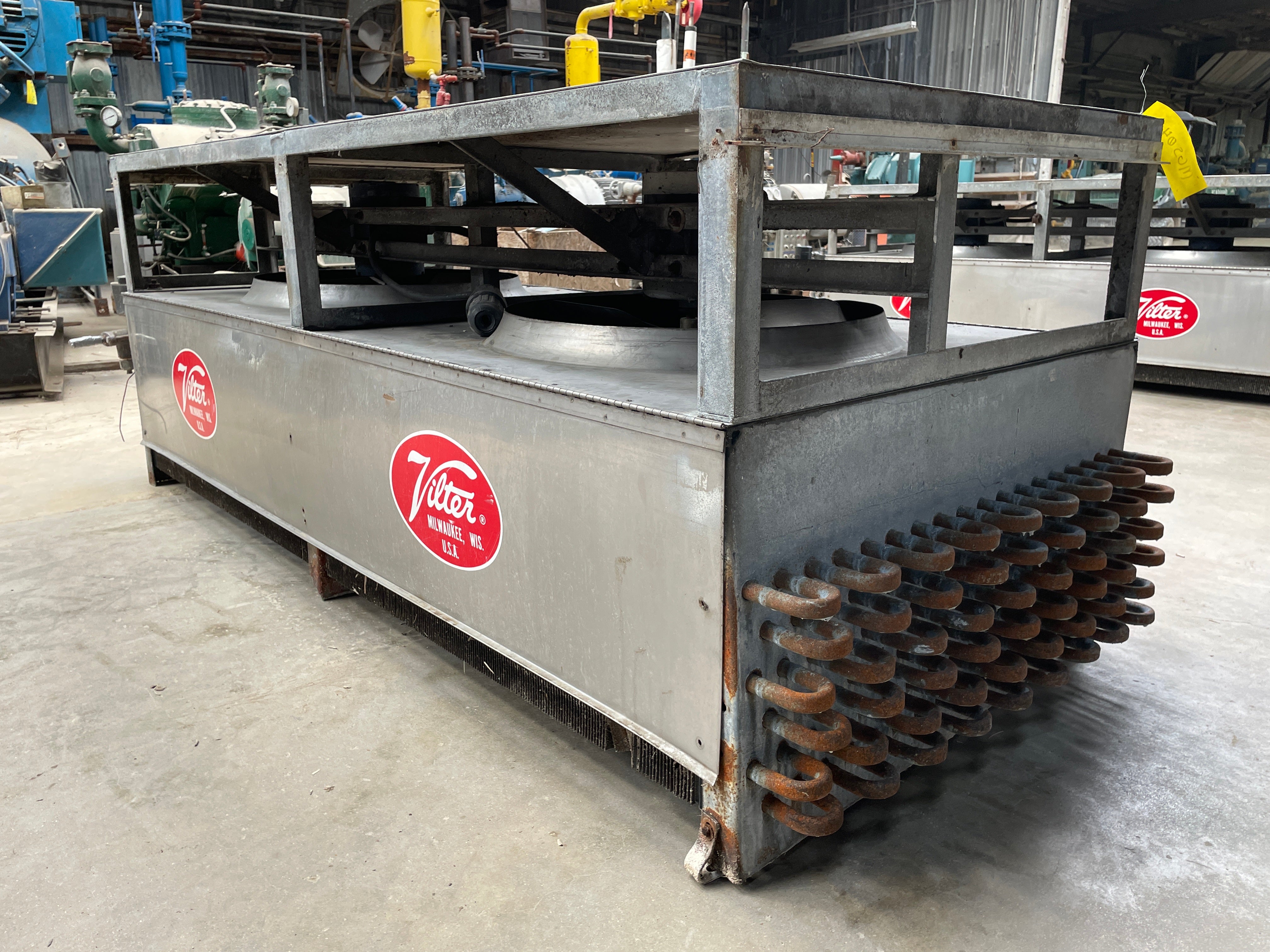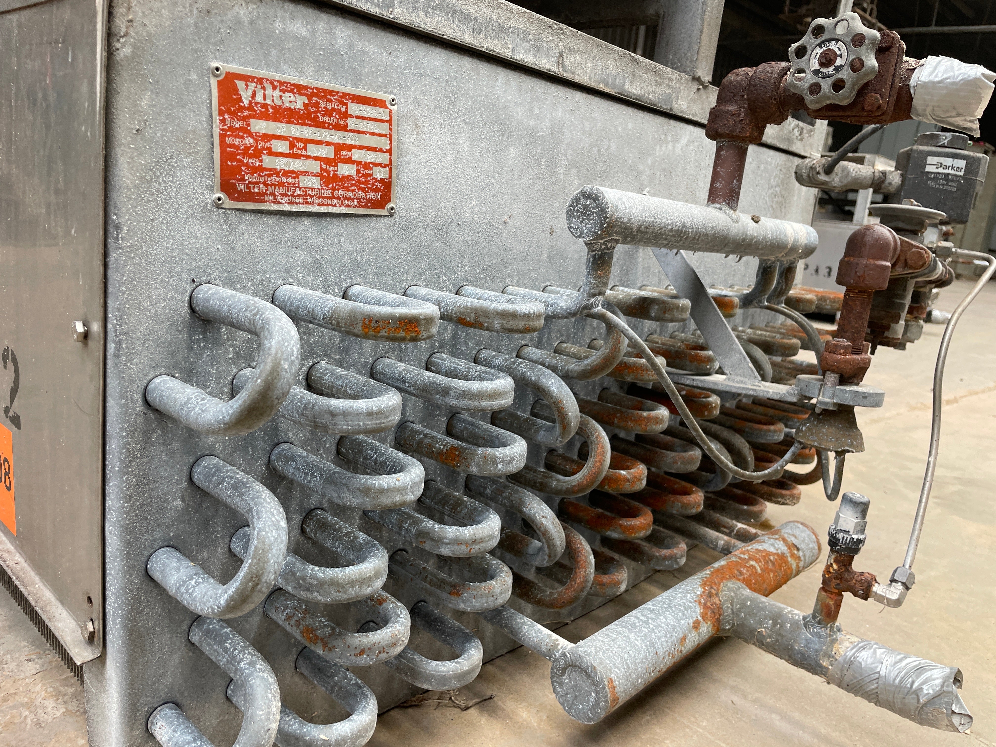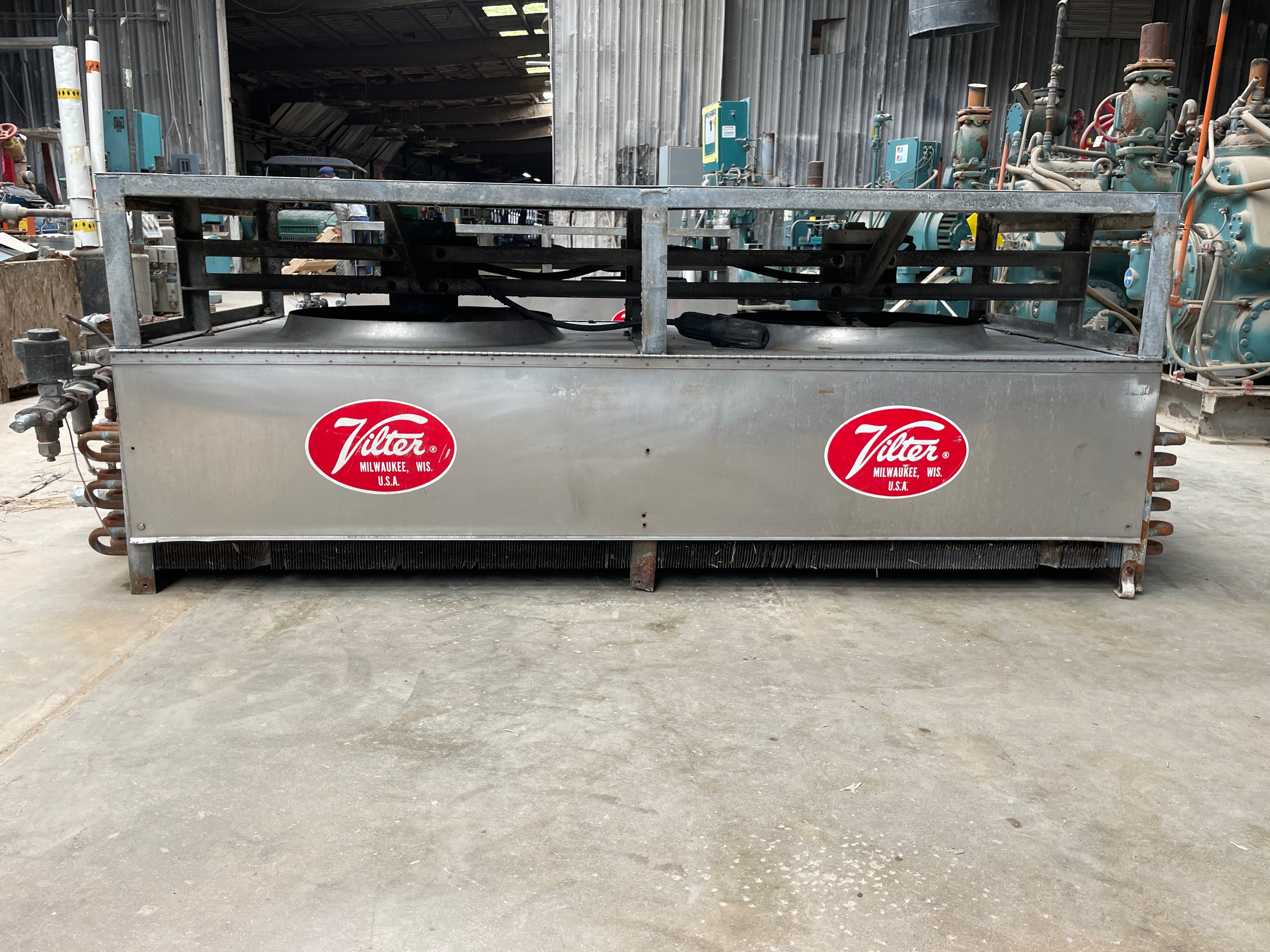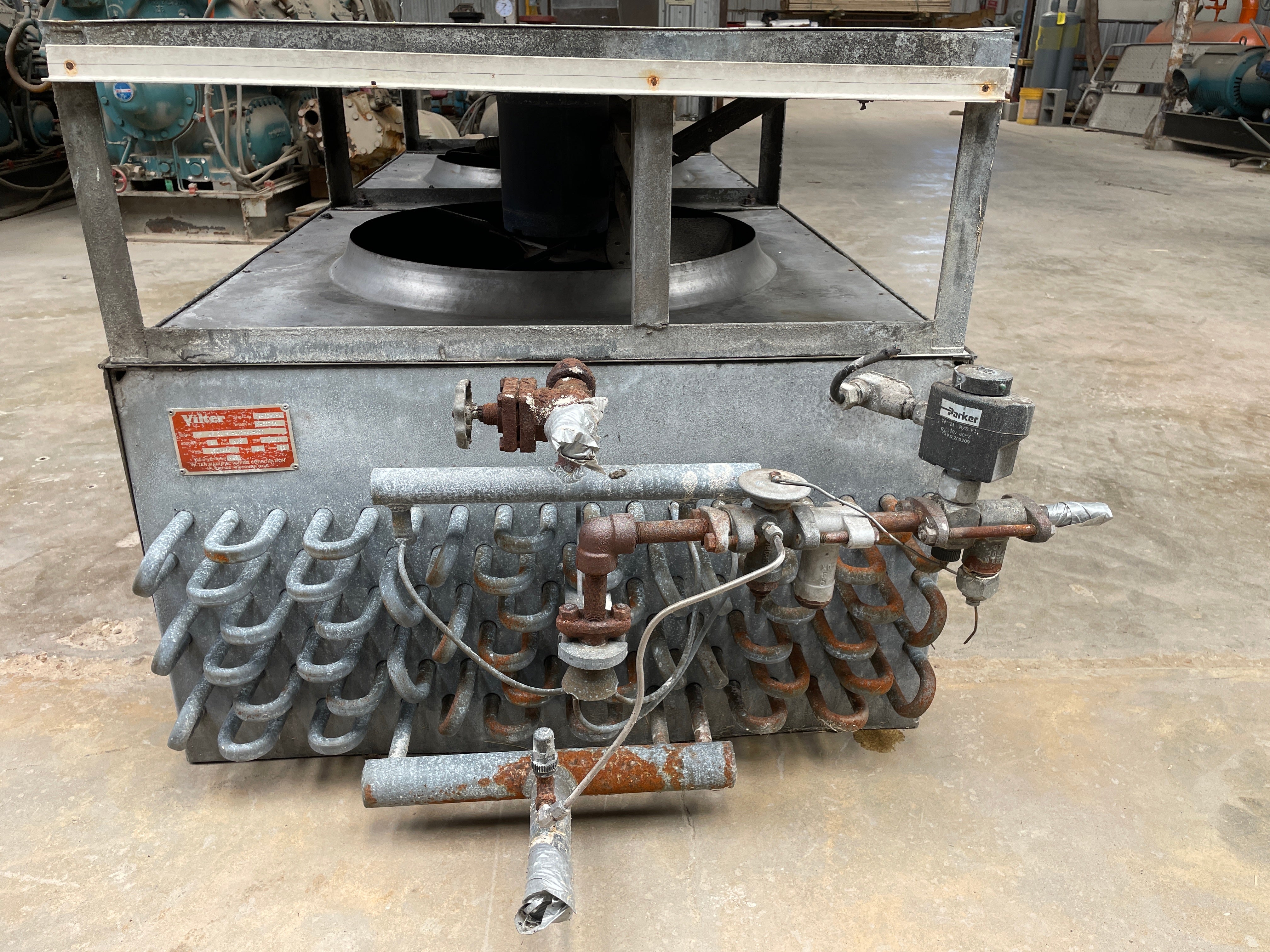 Vilter UF 21-64-1-2-XA-HGC Ammonia Evaporator Coil - 9 TR, 2 Fans (Low Temperature) This evaporator Coil uses Low Temperature frosted coils. A capacity of 7560 (BTUH / °F TD) and an estimated tonnage of 9(TR) @15TD. An Air Flow of 11600CFM and a face velocity of 550 FPM. Direct Expansion top fed coils with a gas defrost system. This unit was previously ran with Ammonia. The package includes 2 motors for the fans.