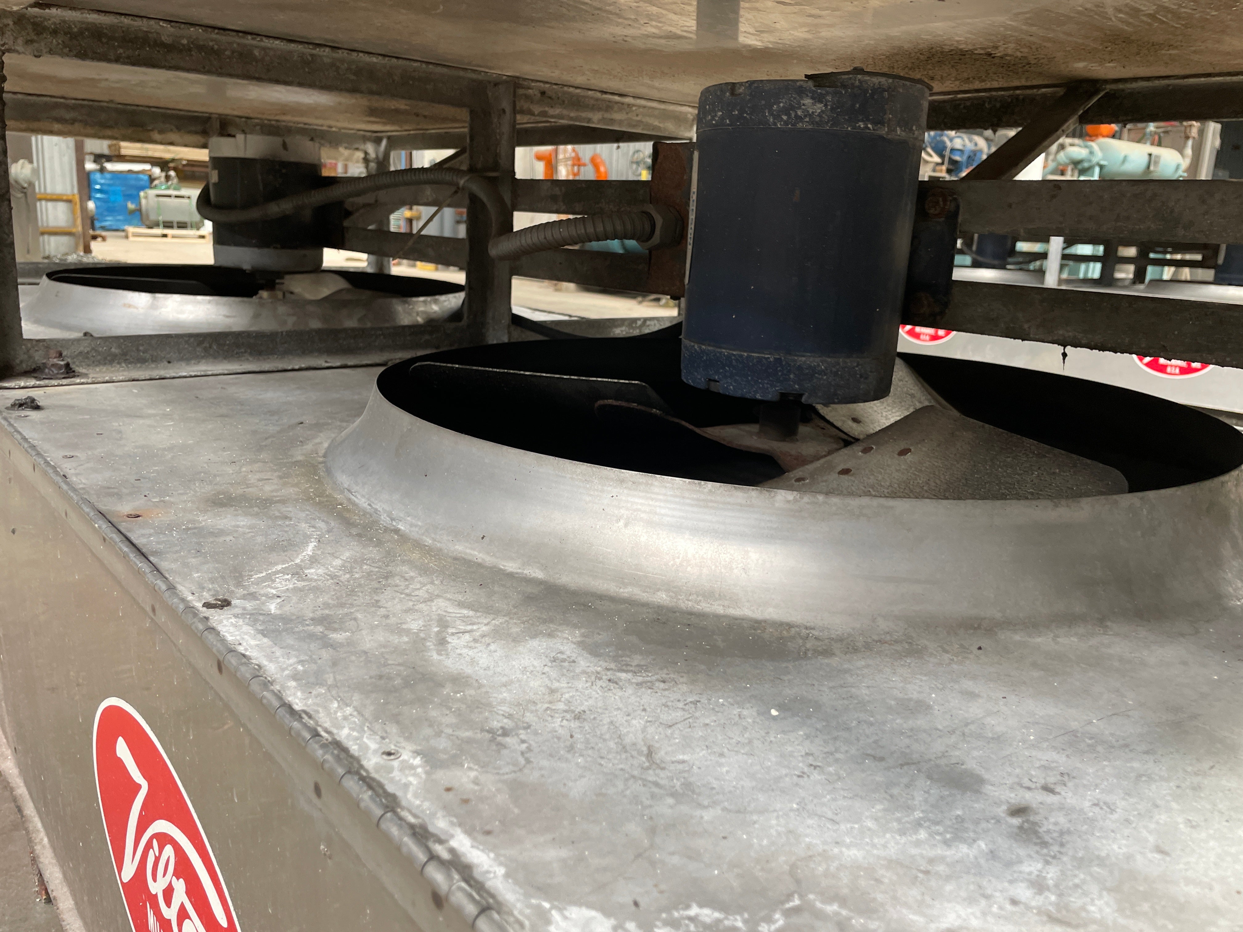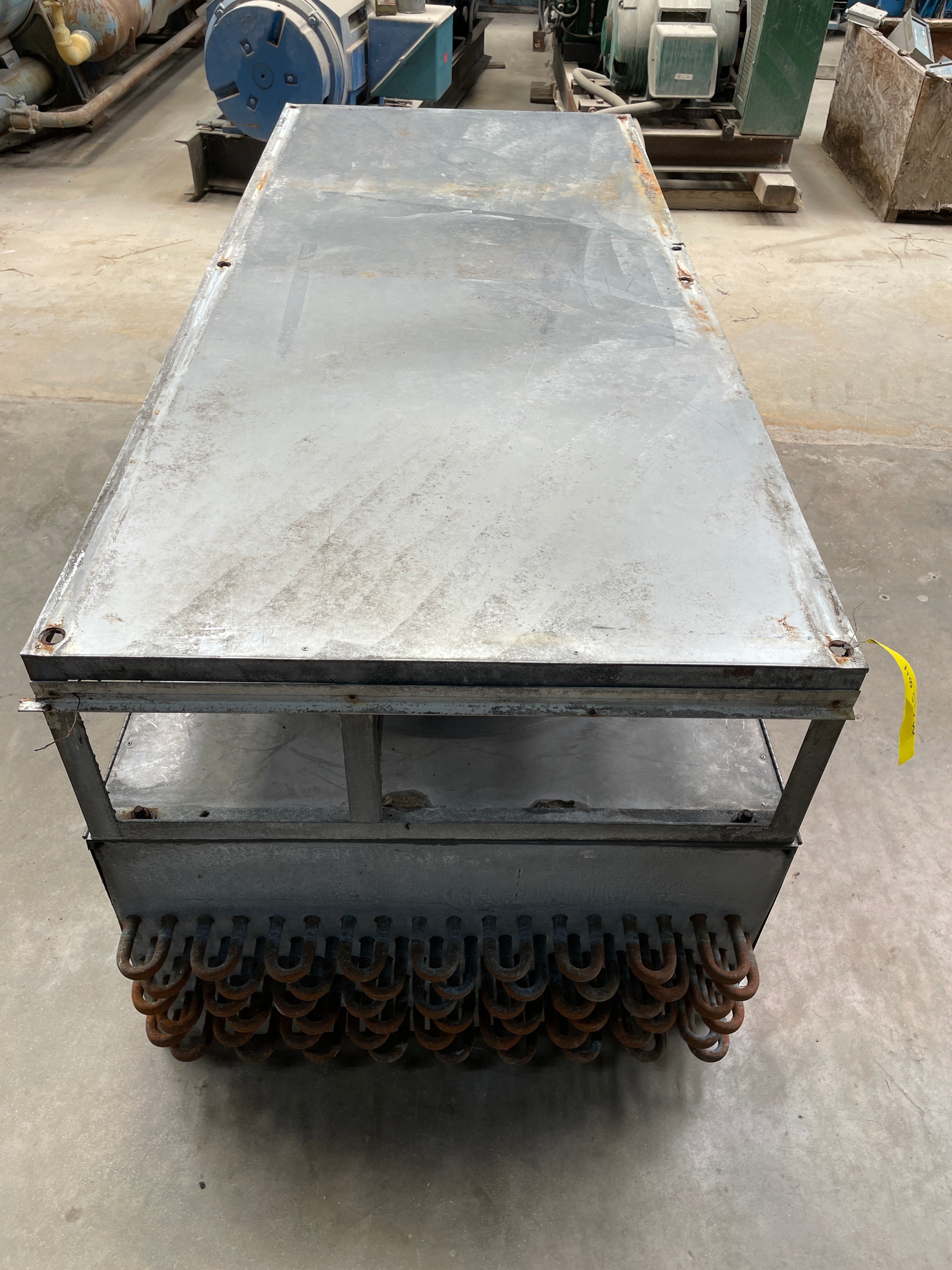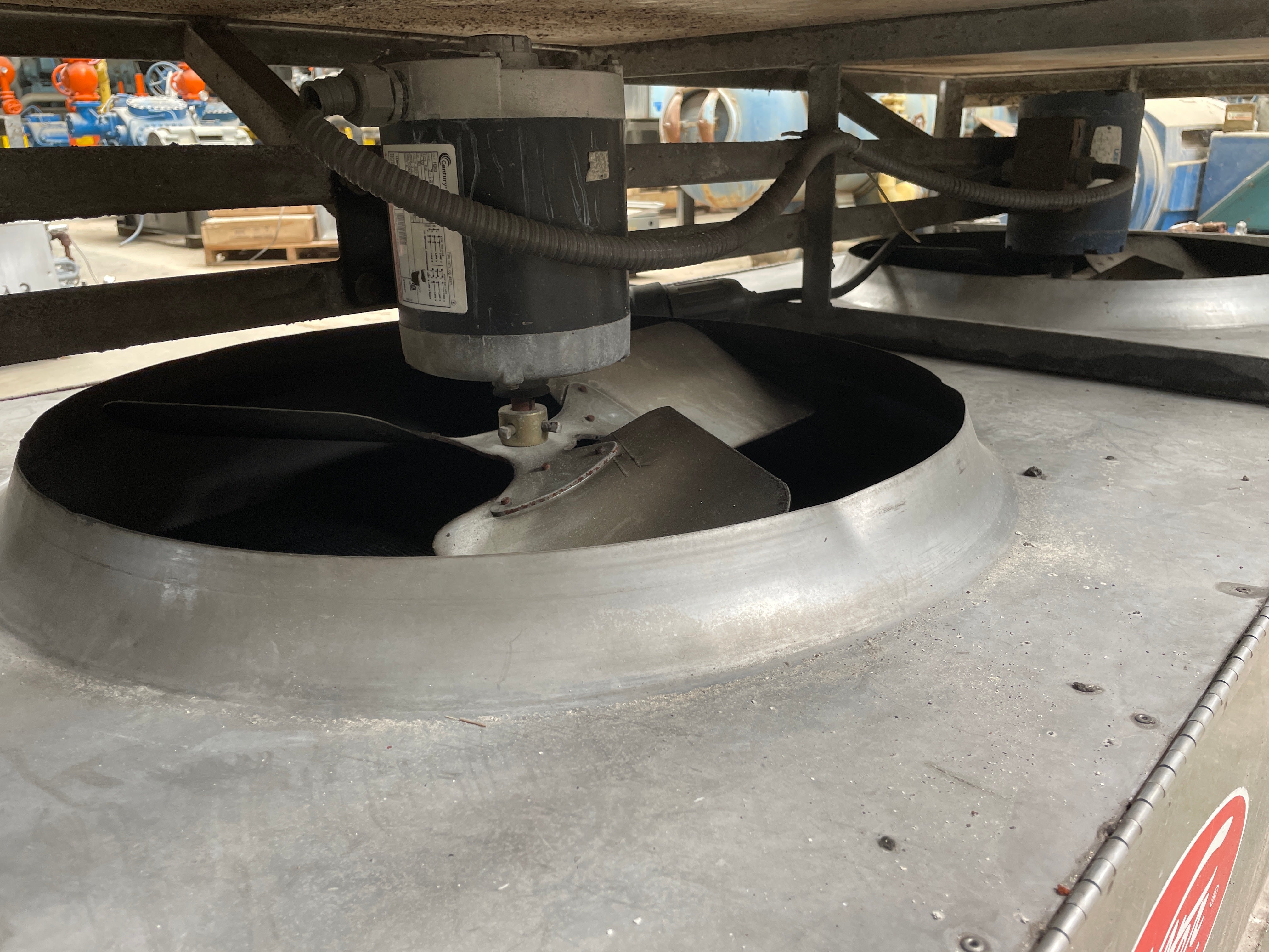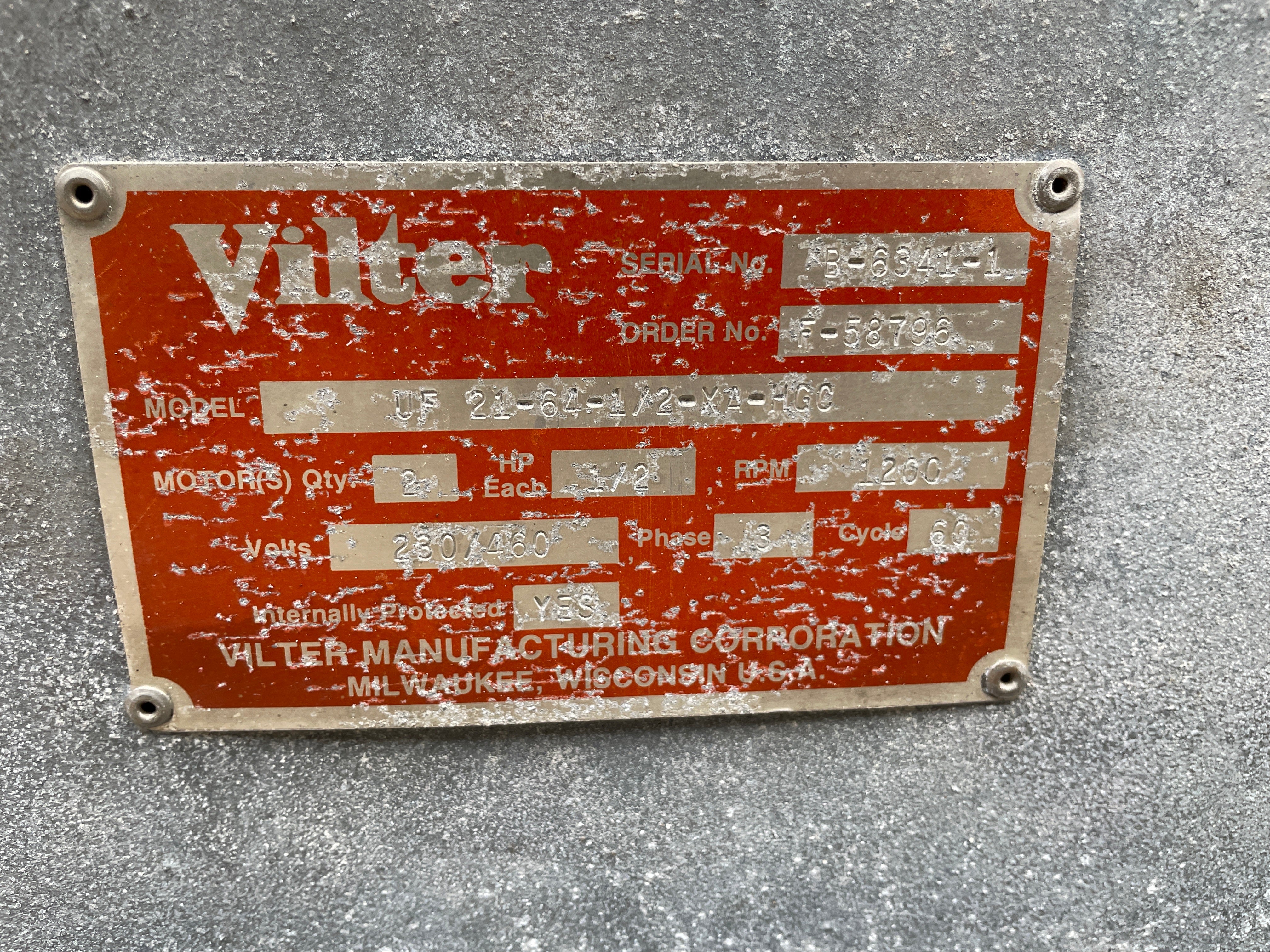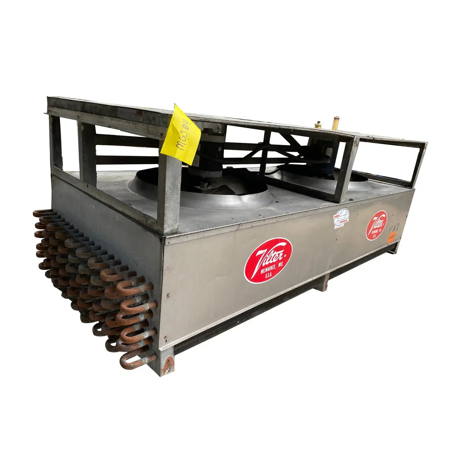 Vilter UF 21-64-1-2-XA-HGC Ammonia Evaporator Coil - 9 TR, 2 Fans (Low Temperature) This evaporator Coil uses Low Temperature frosted coils. A capacity of 7560 (BTUH / °F TD) and an estimated tonnage of 9(TR) @15TD. An Air Flow of 11600CFM and a face velocity of 550 FPM. Direct Expansion top fed coils with a gas defrost system. This unit was previously ran with Ammonia. The package includes 2 motors for the fans.