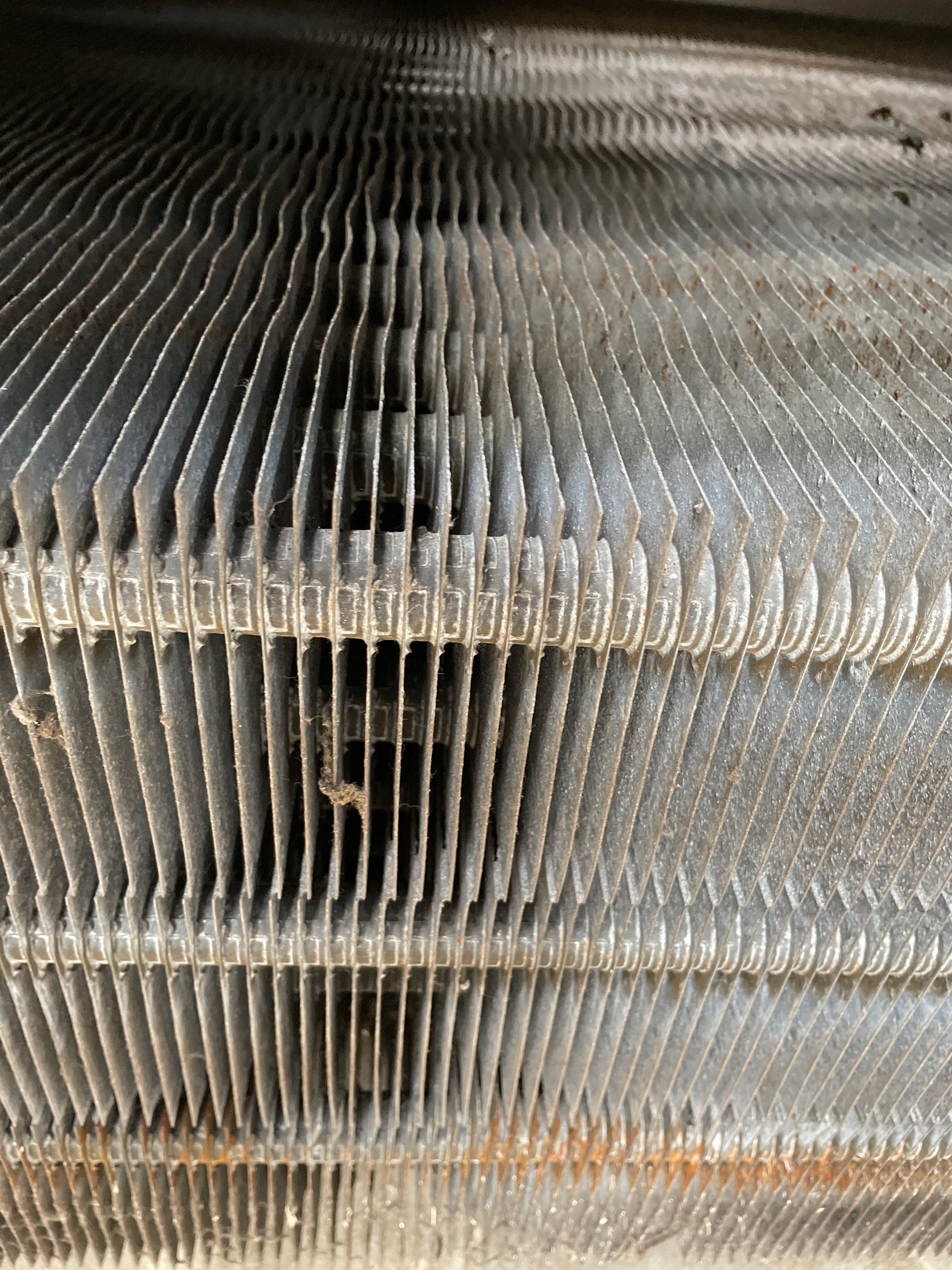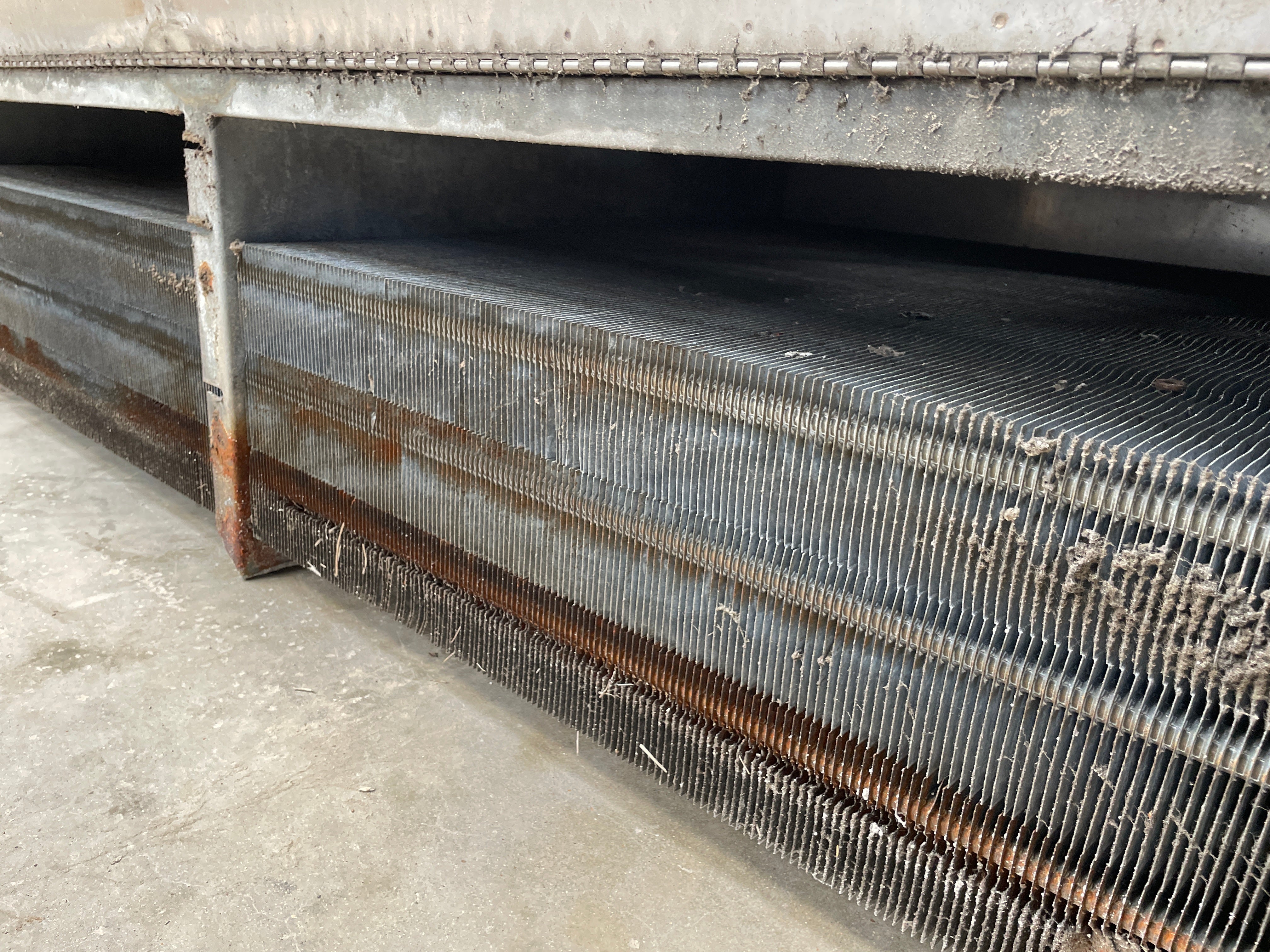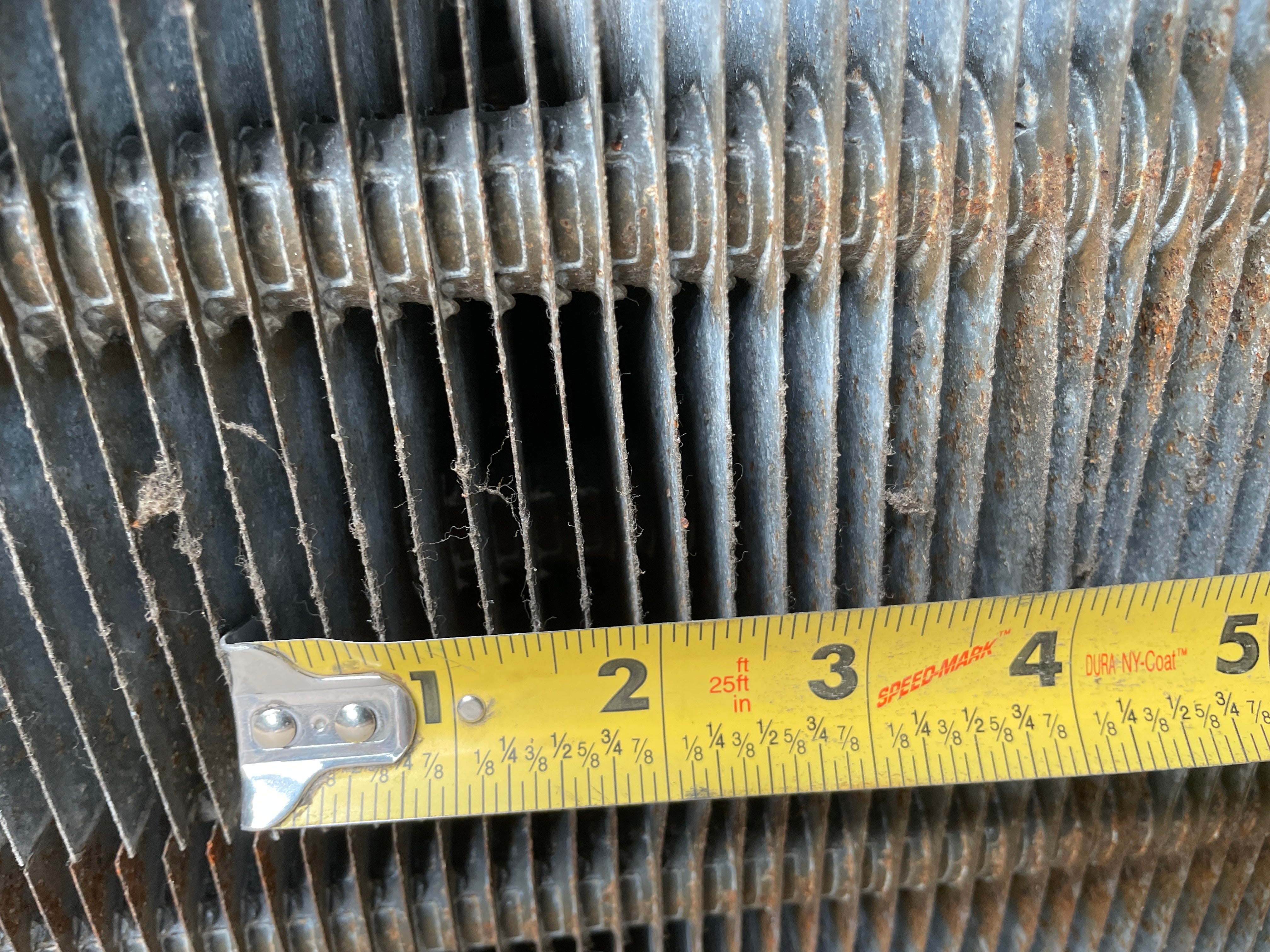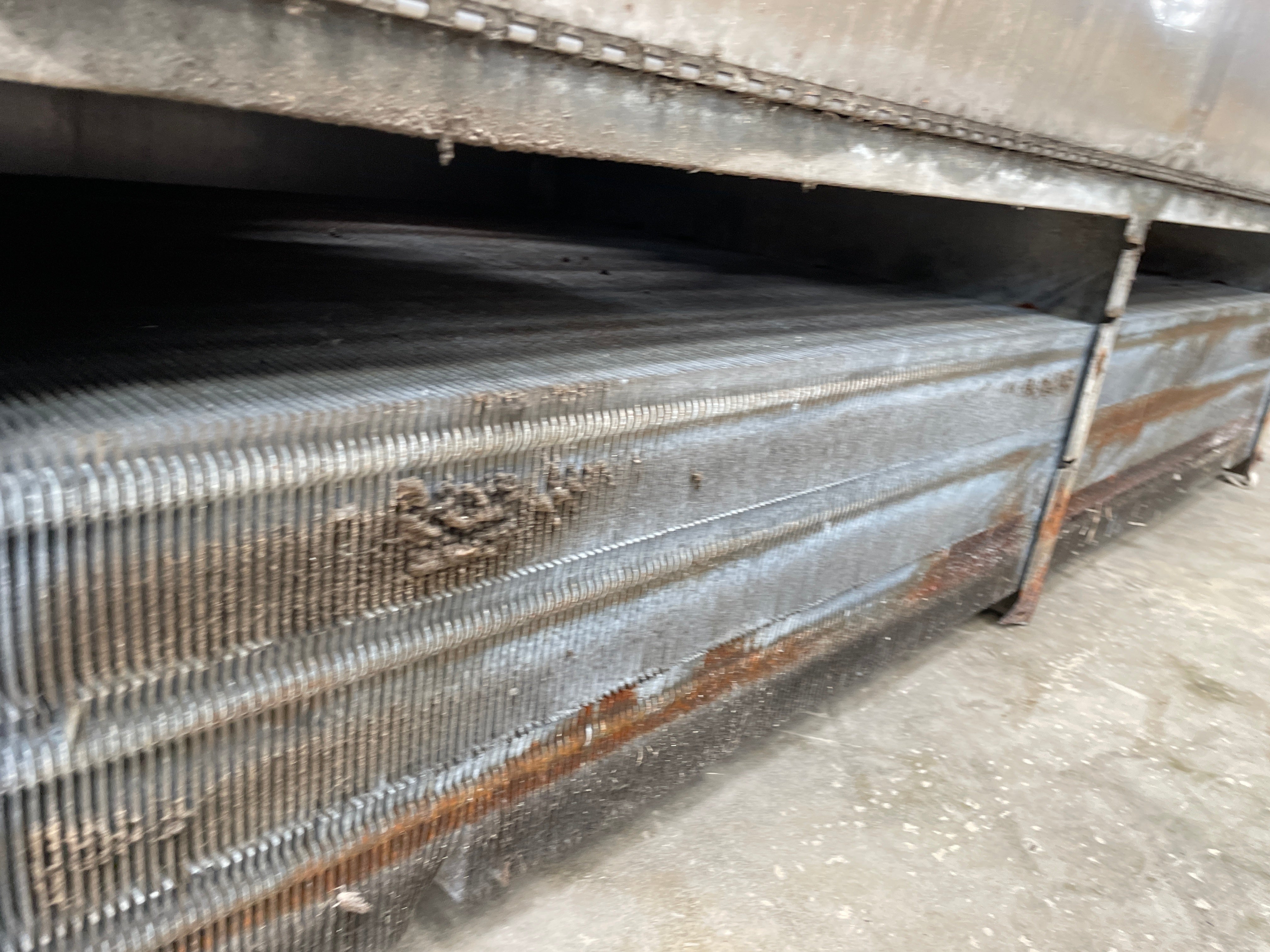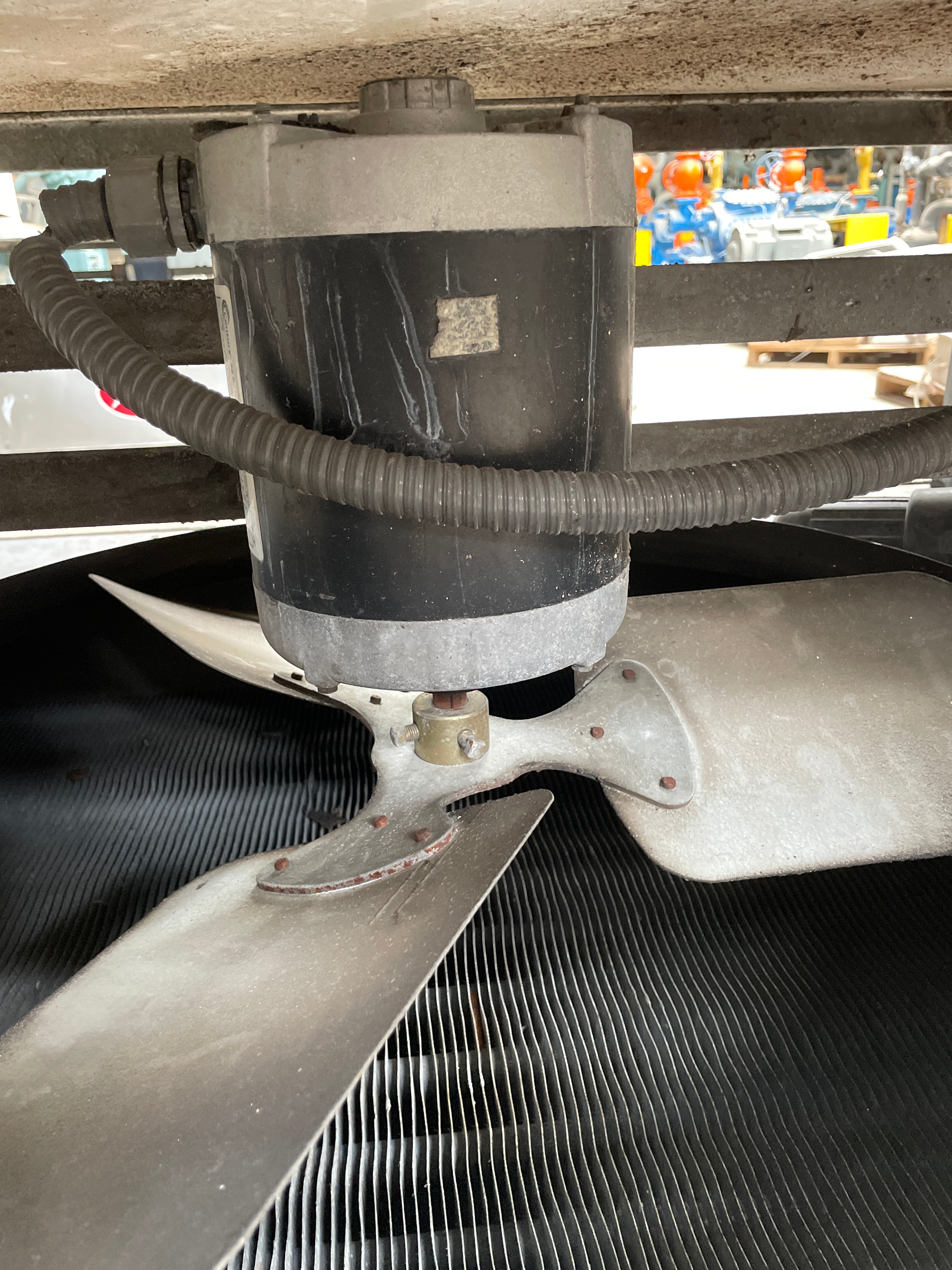 Vilter UF 21-64-1-2-XA-HGC Ammonia Evaporator Coil - 9 TR, 2 Fans (Low Temperature) This evaporator Coil uses Low Temperature frosted coils. A capacity of 7560 (BTUH / °F TD) and an estimated tonnage of 9(TR) @15TD. An Air Flow of 11600CFM and a face velocity of 550 FPM. Direct Expansion top fed coils with a gas defrost system. This unit was previously ran with Ammonia. The package includes 2 motors for the fans.