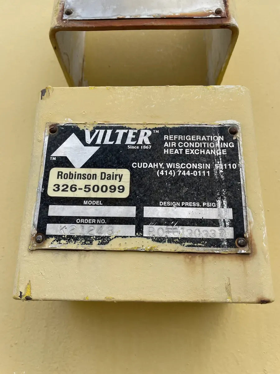 Vilter Vertical Ammonia Receiver ( 79in x 79in. 2000 Gallons) Serial Number: 50935. Tank National Board Number: 48034. Tank Estimated Capacity (Gallons): 2000. Tank MAWP (PSI @ Temp): 250 PSI @ 500 F. Tank MAWT (PSI @ Temp): -20 F @ 250 PSI. Previous Refrigerant was Ammonia (R717 | NH3). Manufactured in 2001. Shipping Dimensions (Inches): 79 x 79 x 125. 8000 LB