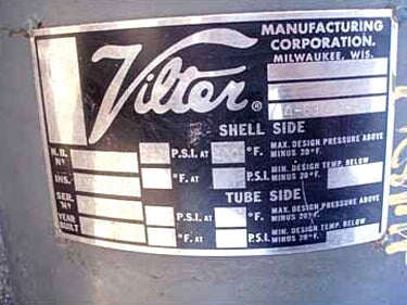 Vilter Vertical Oil Separator Tank. S/N: 3-54814-18. Nat'l Bd: 13.025. Approximate capacity: 25 gallons. Inside straight-wall dimensions: 1 ft. 3 in. dia. x 2 ft. 6 in. H. MAWP: 250 psi @ 400°F. Inlet: (1) 2-1/2 in. dia. port. Outlets: (1) 3 in. dia. suction port, (1) 3 in. dia. discharge port, (1) 1/2 in. dia. discharge port. Overall dimensions: 3 ft. L x 1 ft. 4 in. W x 6 ft. 4 in. H.