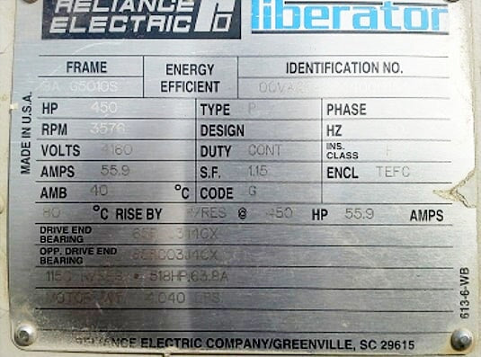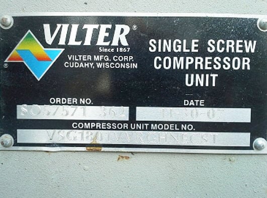 Surplus Unused 2007 Vilter VSG Single Screw Compressor Package (minus the screw compressor) with Allen-Bradley progRam Industriesmable controller. Model: VSG1801. Sales Order: SO57571-362, Serial Number: 4103, Test Pressure: 600 PSIG, Rated Discharge Pressure: 400 PSIG, MAWP: 450 PSIG, Date: 11-30-07, Compressor Unit Model VSG1801VVRGHNECST. This compressor package was installed, but never was used in service. Motor leads were pulled from the junction boxes, but never were terminated at the starter. We purchased the units February 2013 and have them at our indoor warehouse in Texas. According to Vilter, common applications for the Vilter VSG is gas liquification, vapor recovery, flare gas recover, coal bed methane recovery, field and fuel gas boosting, wellhead recovery, enhanced oil recovery, landfill gas recovery, LNG boil off, gas gathering, bio-gas, digester, carbon dioxide CO2, nitrogen, hydrogen, and other refrigerants. Package features Vilter control panel with Allen-Bradley Panelview Plus 1000, 600 PSIG Oil Separator, Chil-Con, and Insultec components. Reliance Electric Liberator Motor: 450 HP, 3576 RPM, 4160V, 55.9 Amps, 3-phase, 19A G5010S Frame, Code G, 1.15 S.F., CONT Duty, TEFC Enclosure, weight: 4,300 lbs. Overall Dimensions (with suction strainer removed): 14 ft. 4 in. L x 6 ft. 6 in. W x 8 ft. 4 in. H. (ACN1550)