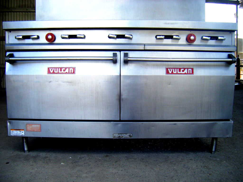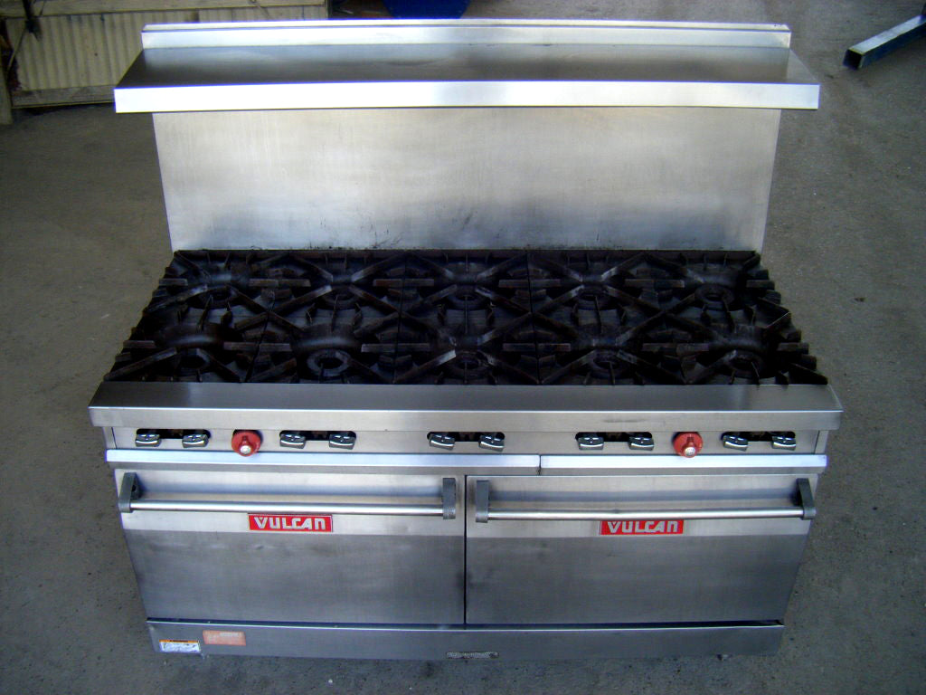 Vulcan 10-Burner Gas Stove. (10) 1 ft. x 1ft. burners. (2) 2 ft. 2 ¼ in. W x 1 ft. 9 ¾ in. L x 1 ft. 2 ½ in. H ovens. Overall dimensions: 5 ft. 4 in. L. x 2 ft. 10 in. W. x 5 ft. 3-1/2 in. H.