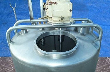 Walker Single Shell Mix Tank- 410 Gallon. S/N: 1377, DRG: 94494-G1. Stainless steel. Motor and motor drive. Propeller dia.: 19-1/2 in. Shaft dimensions: 1-1/2 in. dia. x 43 in. L. (12) Breakers/dividers on bottom dimensions: 4 in. W x 7-1/2 in. H. Inlets/outlets: spray ball 2 in. 'S' line (spray ball), (3) inlet pipes: 4-3/4 in., 3-3/4 in., and 10 in. Manway: 16 in. x 20 in. Overall dimensions: 63 in. L x 60 in. W x 94 in. H.