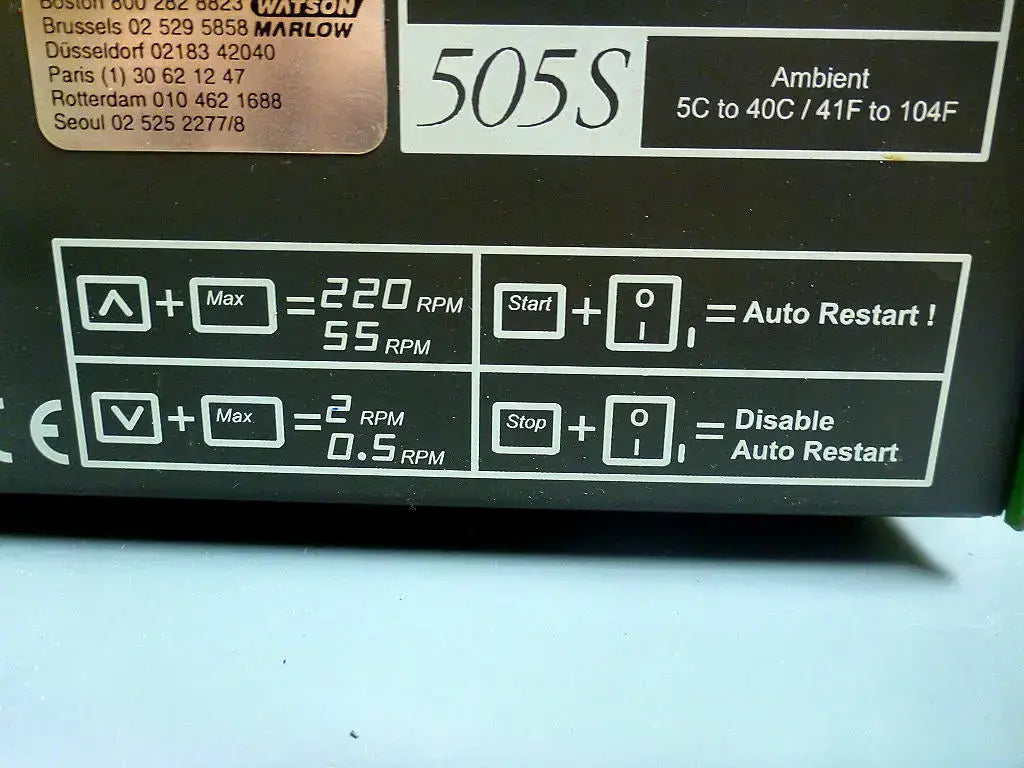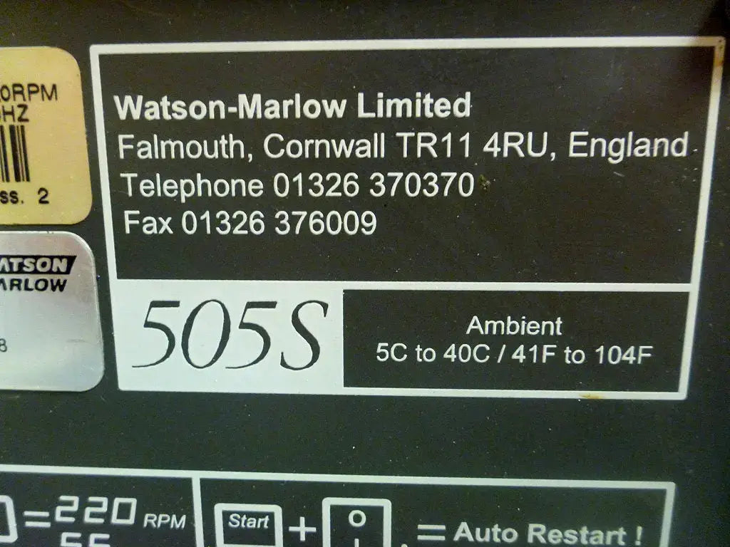 Watson-Marlow 505S Peristaltic Pump. Variable output 2-220 RPM. 100-120 V / 220-240 V, 50/60 hz. Ambient 5ºC-40ºC / 41ºF-104ºF. Overall dimensions: 1 ft. 1 in. L x 8-3/4 in. W x 4-1/4 in. H.