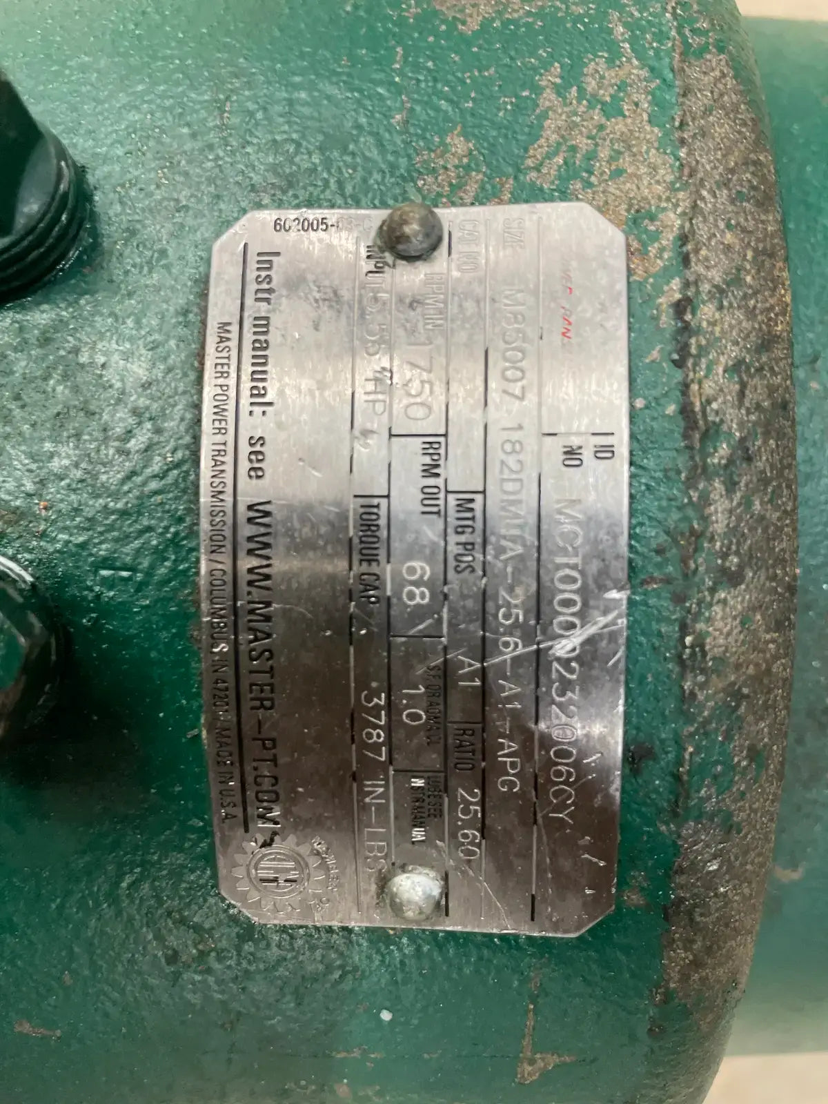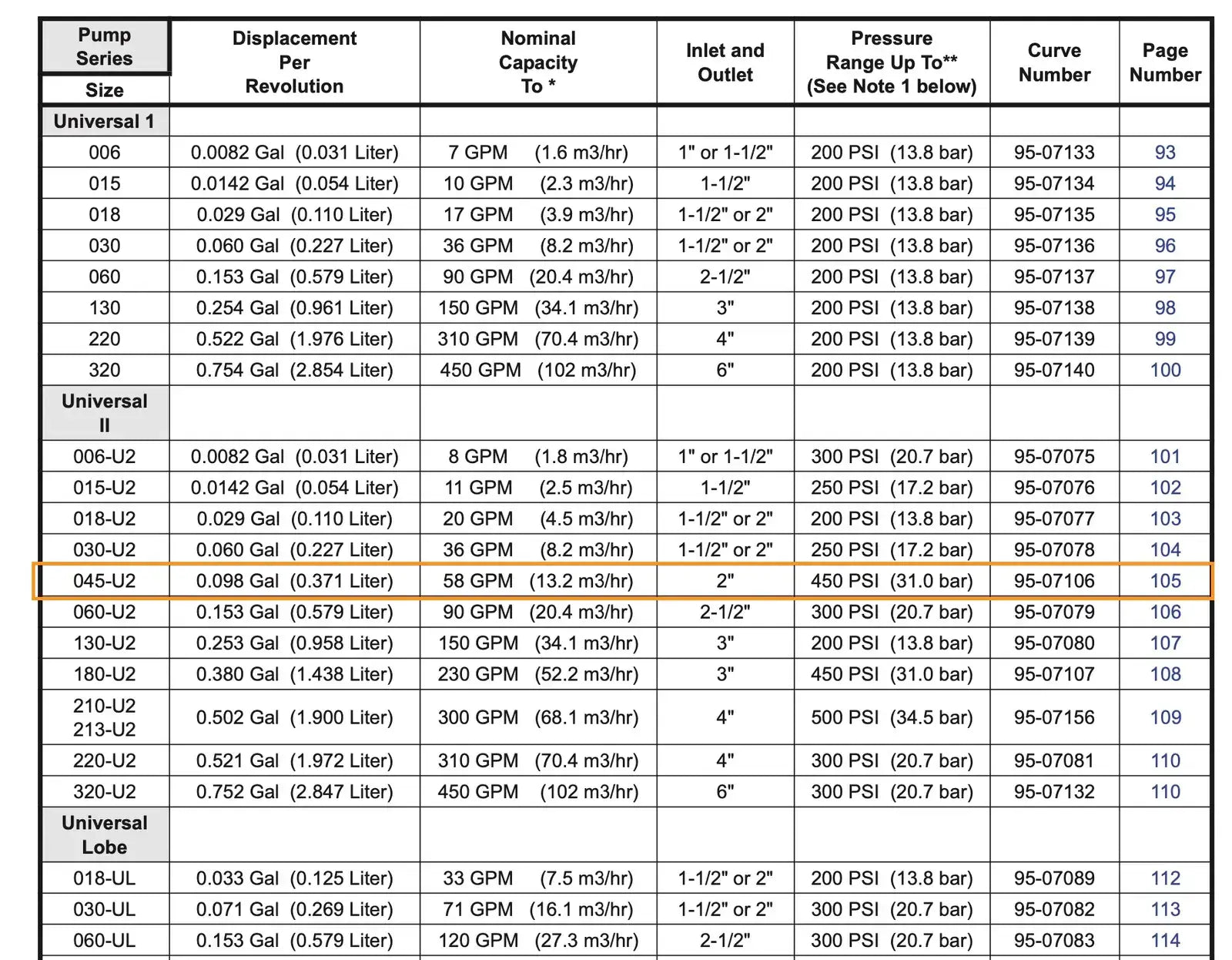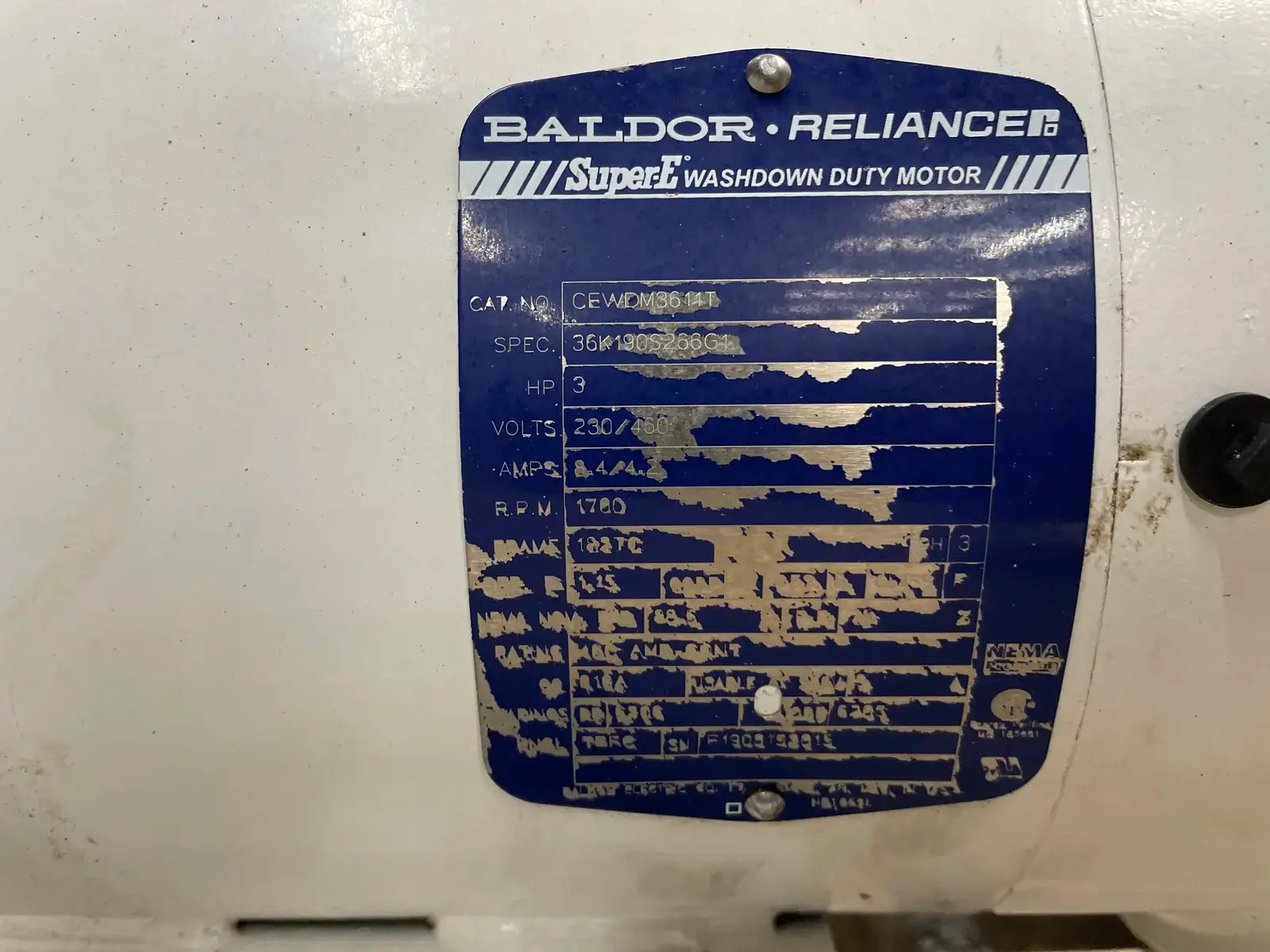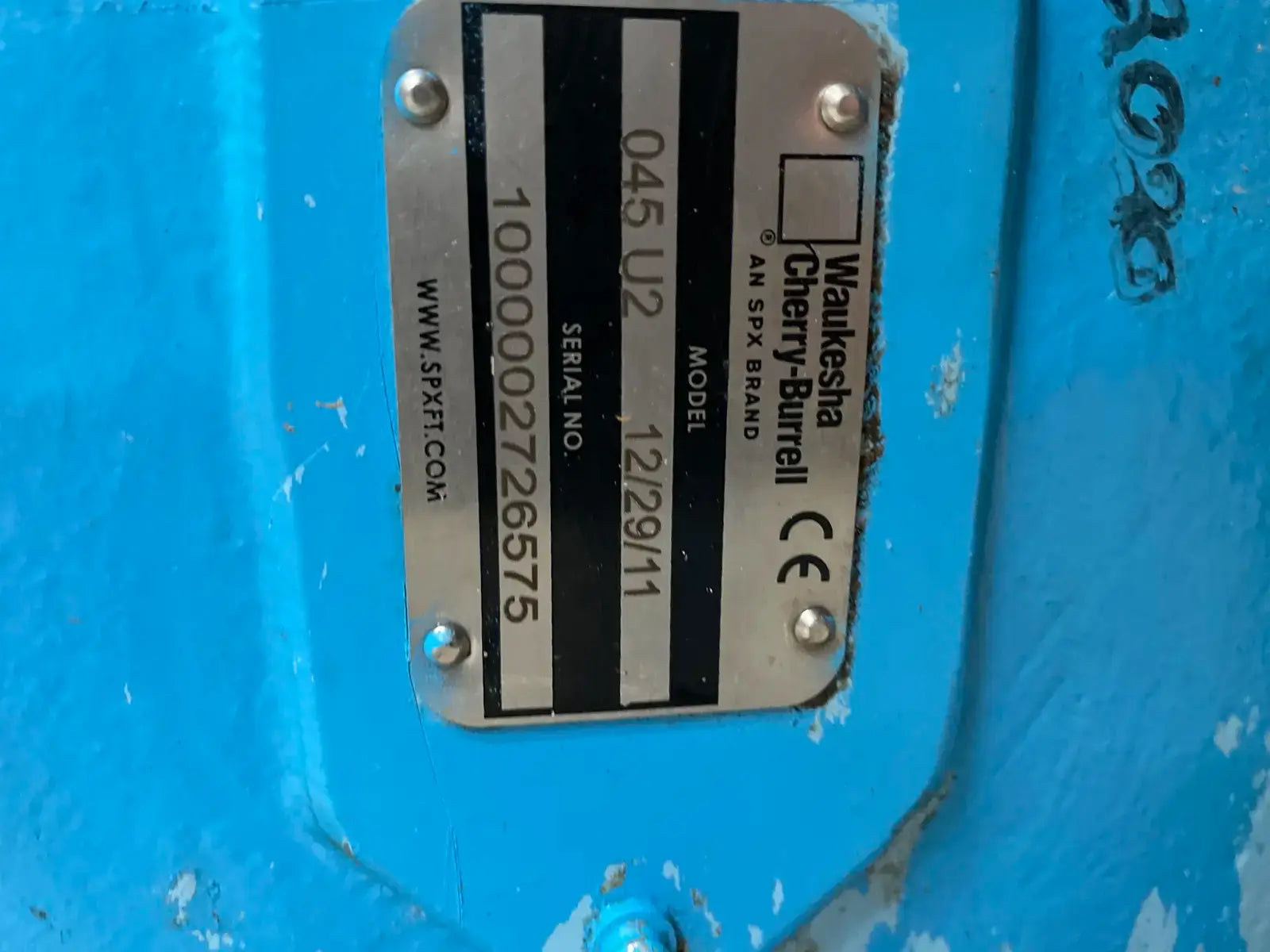 Waukesha Positive Displacement Pump. Model: 045 U2. Serial No: 1000002726575. Displacement Per Revolution: 0.098 Gal (0.371 Liter). Nominal Capacity: 58 GPM (13.2 M3/HR). Tri-Clamp Inlet/Outlet: 2 in. Pressure Range Up to 450 PSI (31.0 bar). Driven by a Baldor Washdown Electric Motor: 3 HP, 230/460 Volts, 1760 RPM, 8.4/4.2 Amps. Drive Ratio: 25.60.