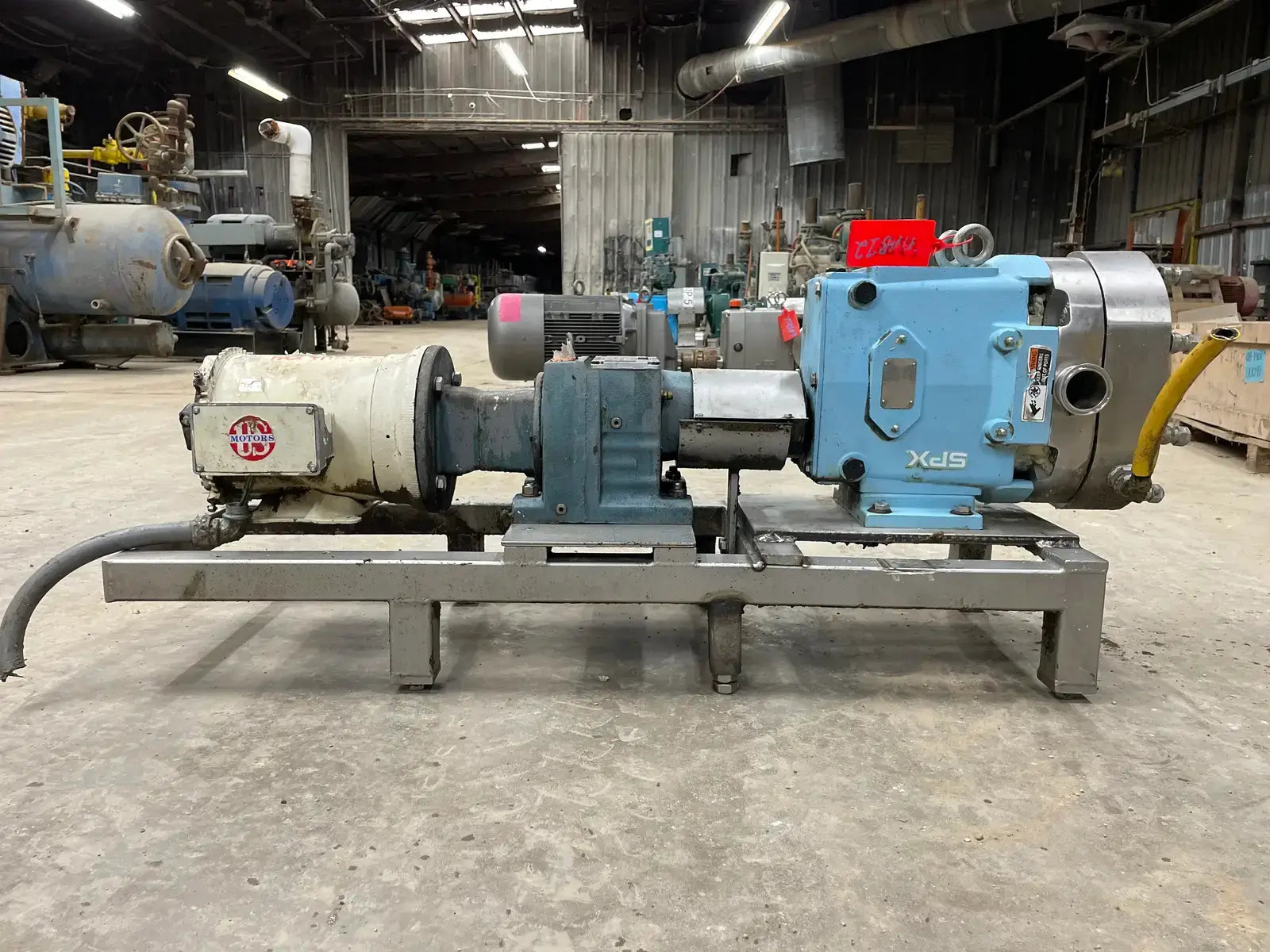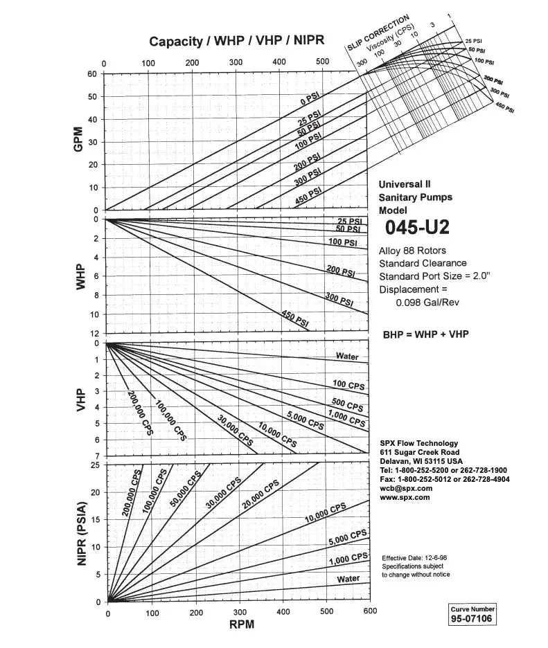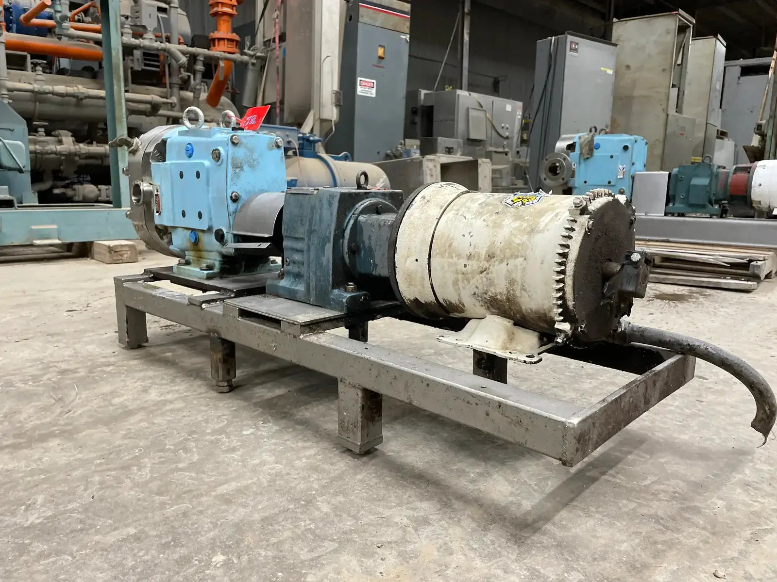 Waukesha Positive Displacement Pump. Model: 045-U2 JUL2014. Serial No: 2939220 R1-3. Nominal Capacity: 58 GPM ( 13.2M/hr.). Maximum Pressure: 450 PSI (31.0 bar). Displacement Per Revolution: 0.098 Gal. (0.371 Liter). Tri-Clamp Inlet/Outlet Size: 2 in. Euro Drive: 37.50 Ratio, Rpm: 3810.