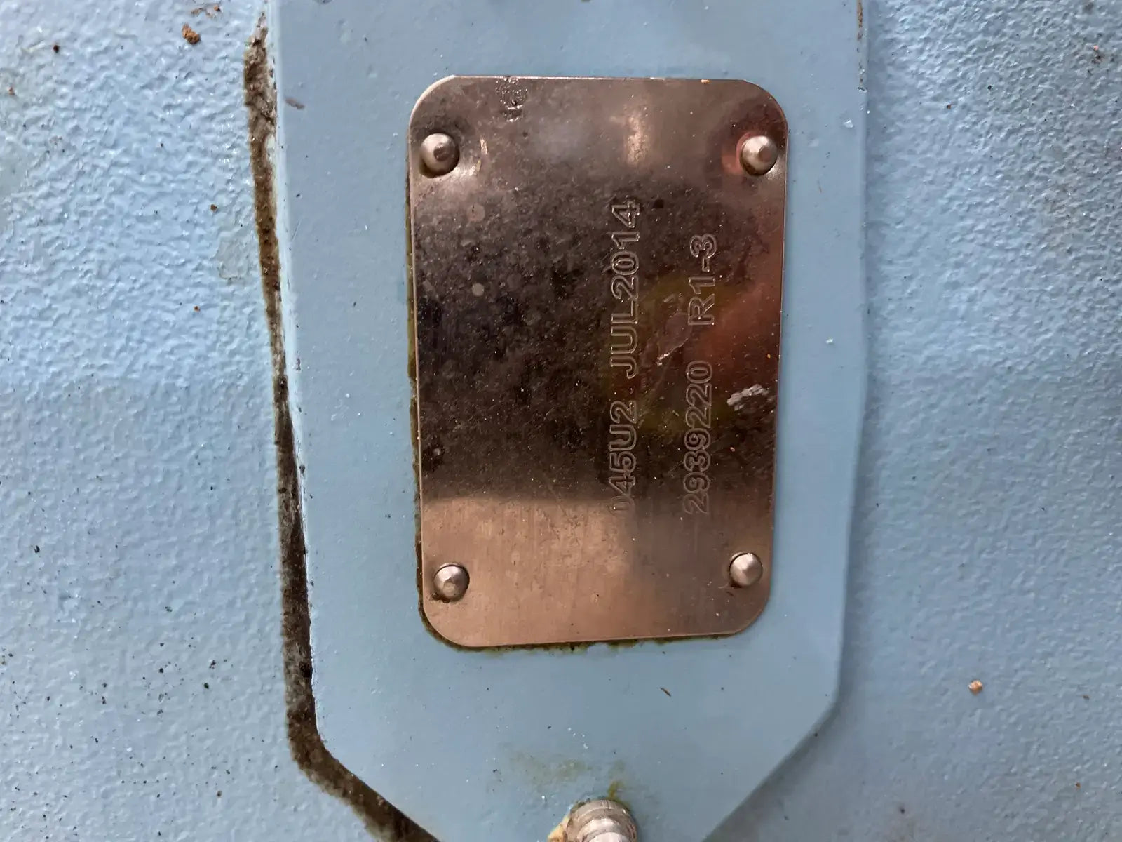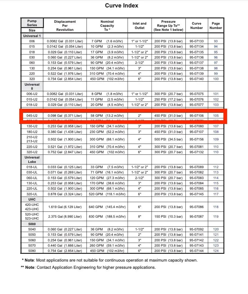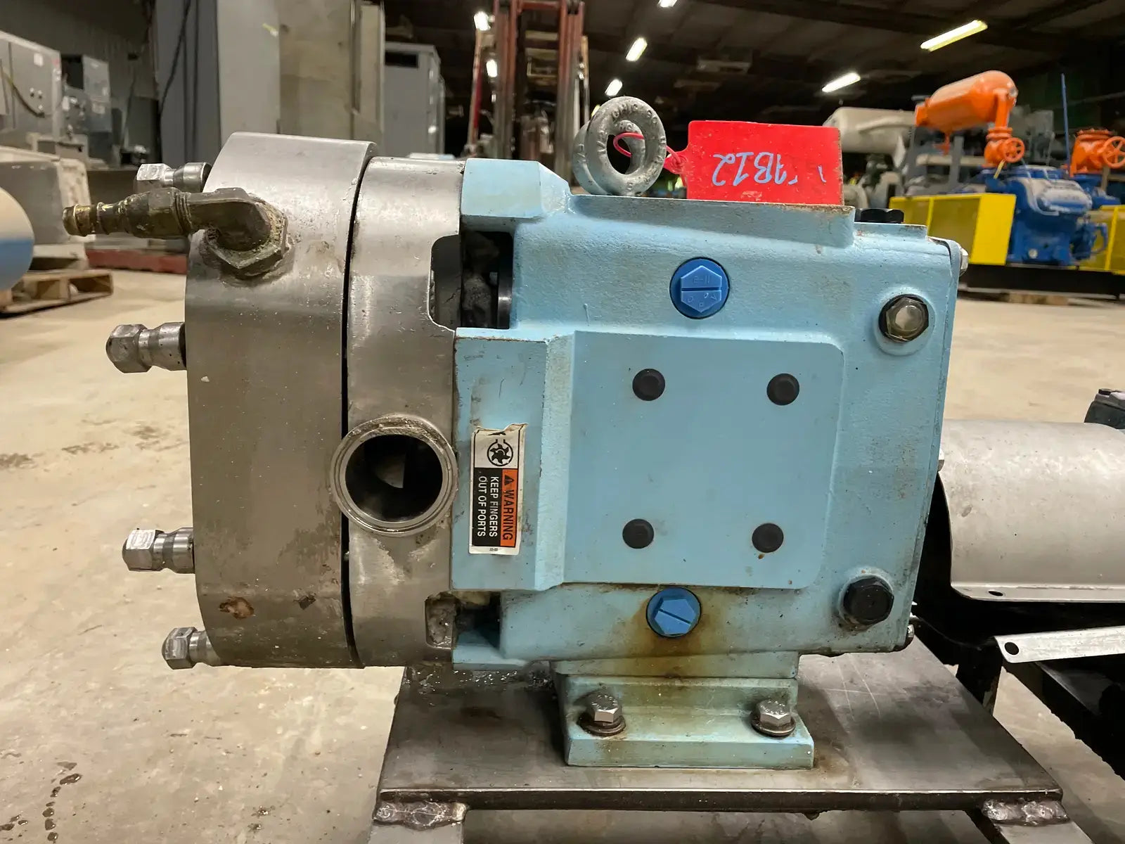 Waukesha Positive Displacement Pump. Model: 045-U2 JUL2014. Serial No: 2939220 R1-3. Nominal Capacity: 58 GPM ( 13.2M/hr.). Maximum Pressure: 450 PSI (31.0 bar). Displacement Per Revolution: 0.098 Gal. (0.371 Liter). Tri-Clamp Inlet/Outlet Size: 2 in. Euro Drive: 37.50 Ratio, Rpm: 3810.