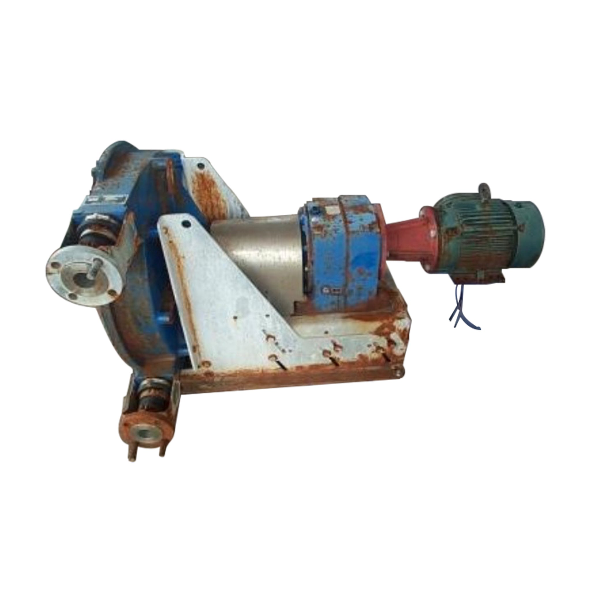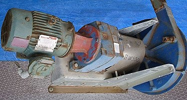 Waukesha Bredel Peristaltic Positive Displacement Pump. Model: SP50. S/N: 51954. Maximum capacity continuous: 46 gpm. Maximum capacity intermittently: 9 gpm. Capacity per revolution: 0.76 gal. Cast iron construction. Reliance Electric Duty Master Motor, 5 hp, 1730 rpm, 230/460 V, 14.0/7.0 amps, 60 Hz, 3 phase. Brook Hansen Drive, ratio of 45, 38 rpm (final). Applications include: corrosives, abrasives, shear sensitive fluids, high viscosity fluids, large solids, etc. The pump is equipped with a 1-1/2 in. dia. flange inlet and a 1-1/2 in. dia. flange outlet. Overall dimensions: 51-1/2 in L x 33-1/2 in. W x 30 in. H.
