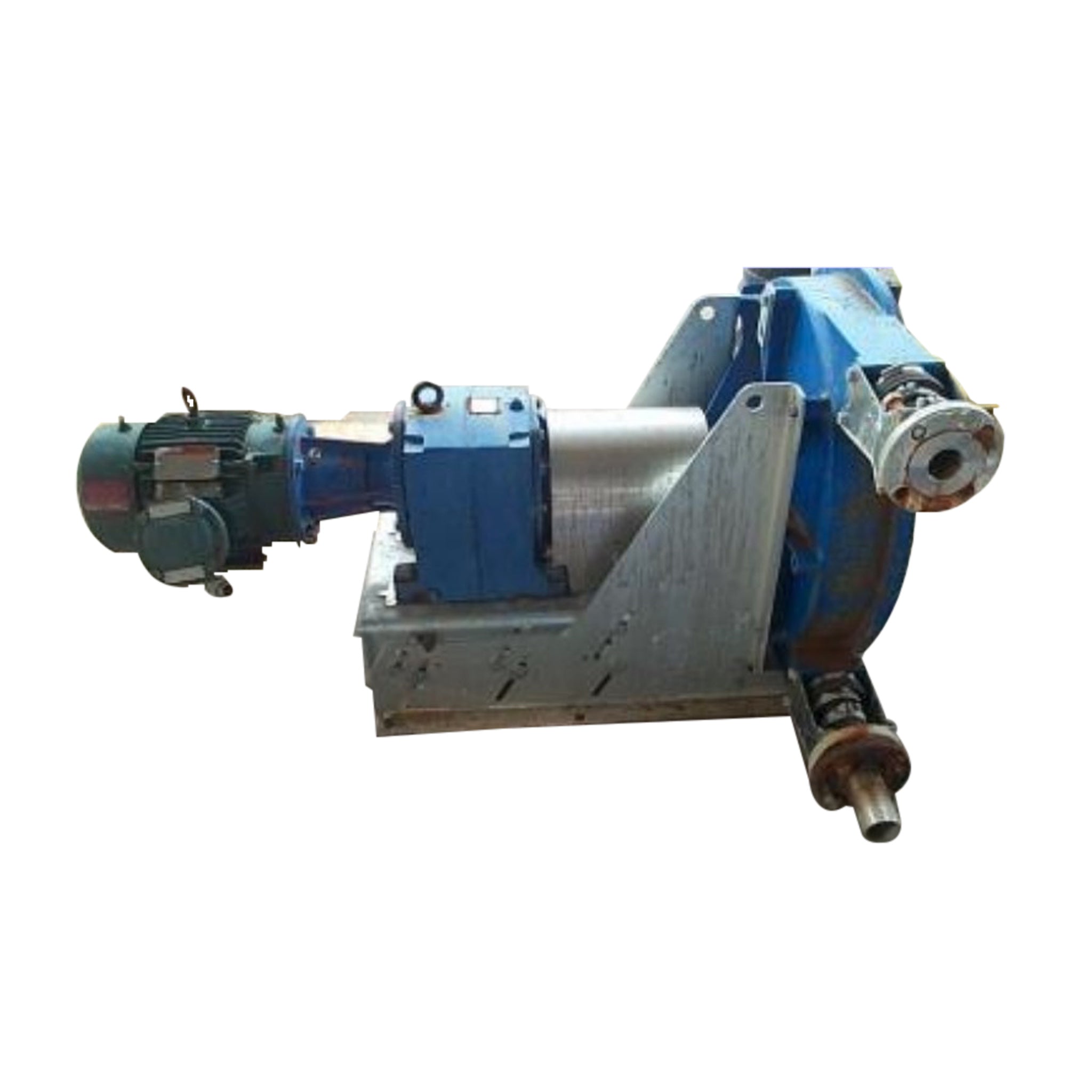 Waukesha Bredel Peristaltic Positive Displacement Pump. Model: SP50. S/N: 51956. Maximum capacity continuous: 46 gpm. Maximum capacity intermittently: 9 gpm. Capacity per revolution: 0.76 gal. Cast iron construction. Reliance Electric Duty Master Motor, 5 hp, 1730 rpm, 230/460 V, 14.0/7.0 amps, 60 Hz, 3 phase. Brook Hansen Drive, ratio of 45, 38 rpm (final). Applications include: corrosives, abrasives, shear sensitive fluids, high viscosity fluids, large solids, etc. The pump is equipped with a 1-1/2 in. dia. flange inlet and a 1-1/2 in. dia. flange outlet. Overall dimensions: 51-1/2 in. L x 33-1/2 in. W x 30 in. H.