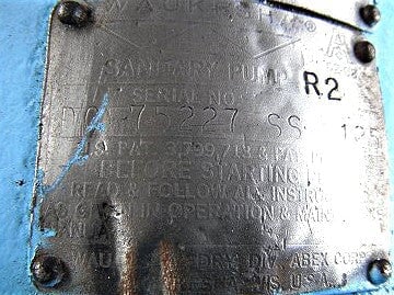 Waukesha Positive Displacement Pump. Model: 125. Flow rate for new pump is 140 gpm with required horsepower and pressure. Discuss with salesperson your process and product to determine if this pump should handle your specific duty. Inlet/outlet: (2) 2-1/2 in. bevel seat fittings. Single mechanical seal option. Reliance Electric motor: 10 hp, 1755 rpm, 230/460 V, 27.0/13.5 amps, 60 Hz, 3 phase, 215TC Frame. Motor drive: 5.85 ratio, 300 rpms final. Typical food applications include milk products, vegetables, fruits, flavorings, bakeries, and meats. Overall dimensions: 4 ft. 4 in. L x 1 ft. 7 in. W x 2 ft. 1 in. H.(ACN140).