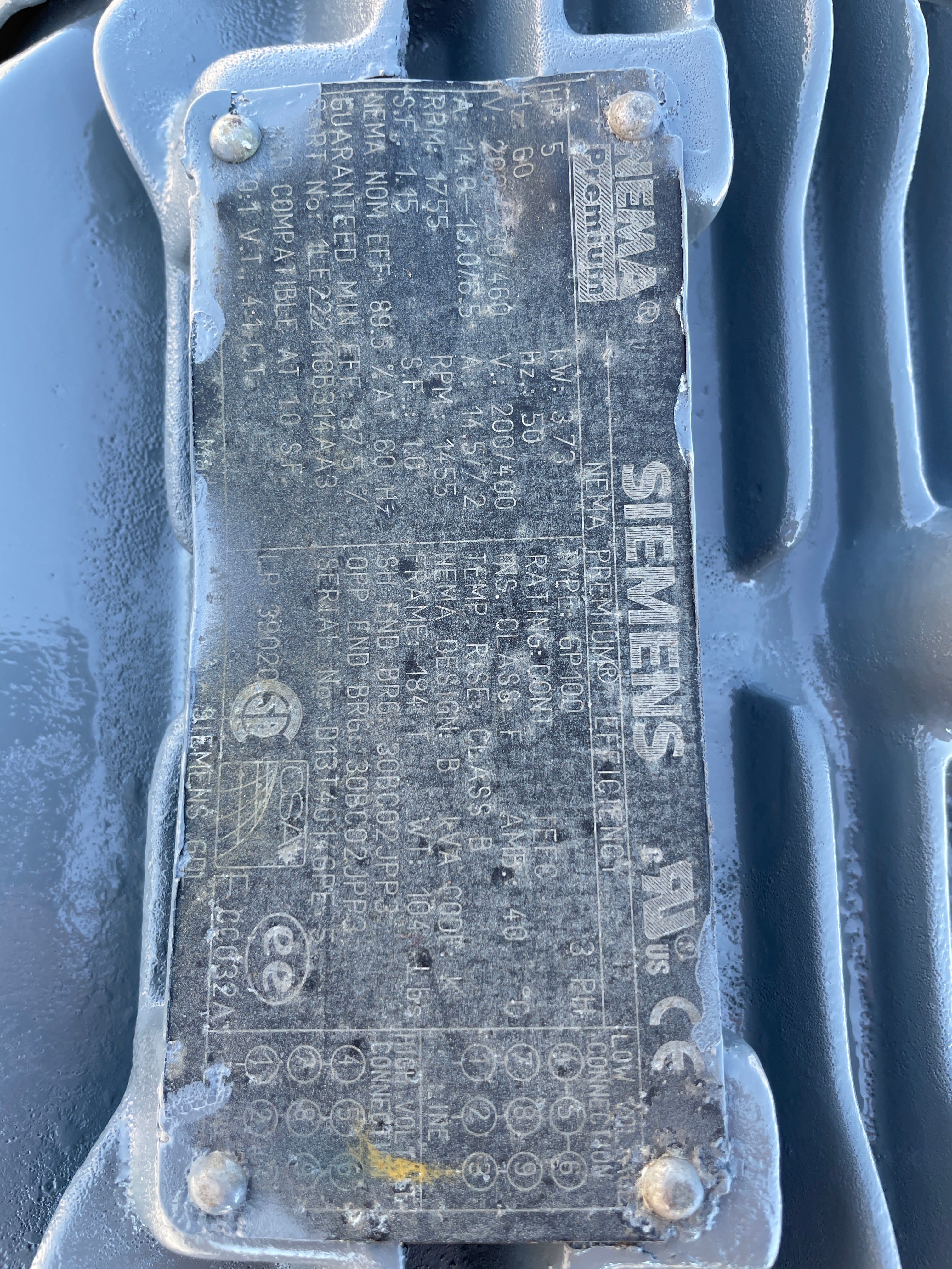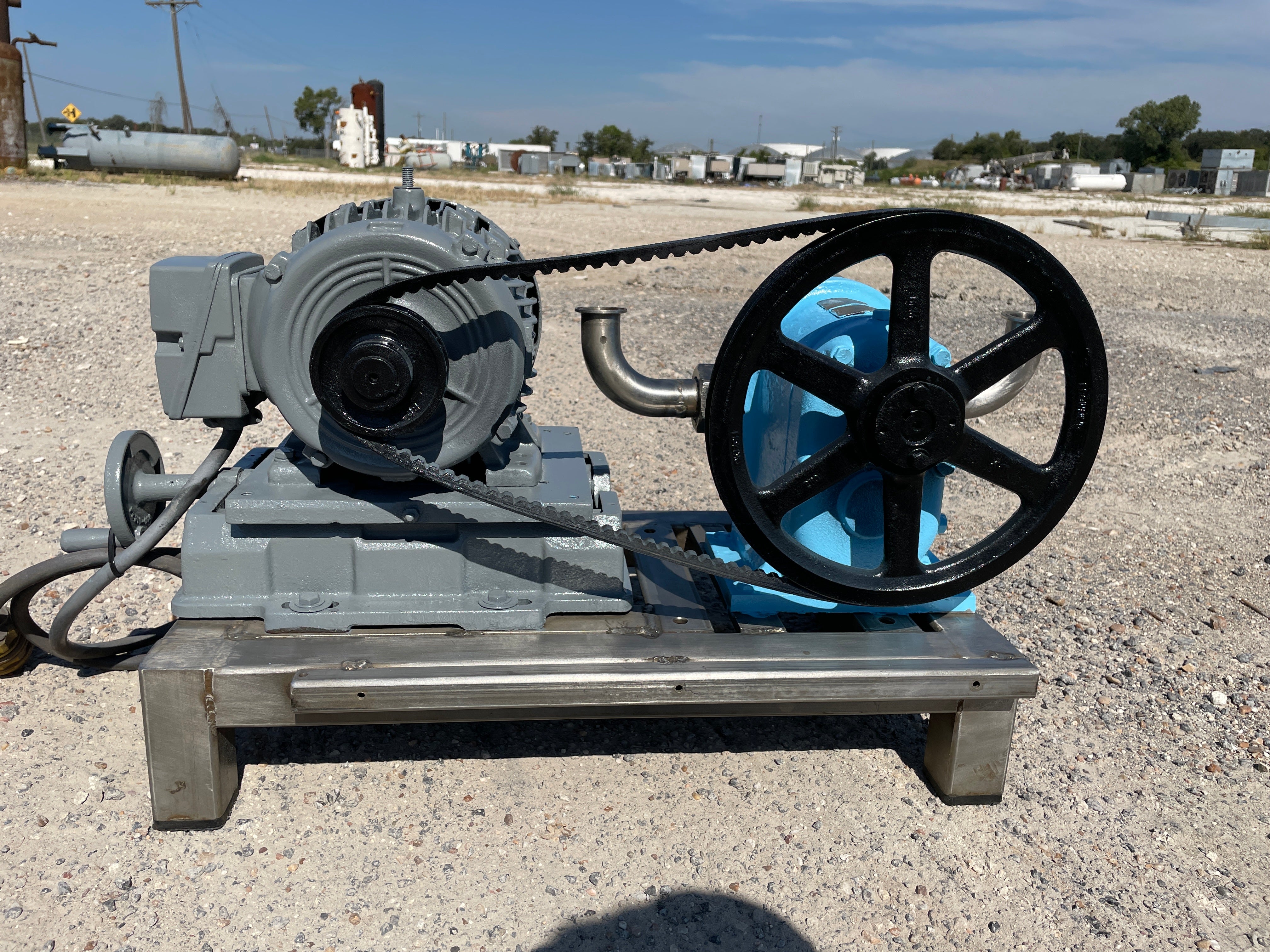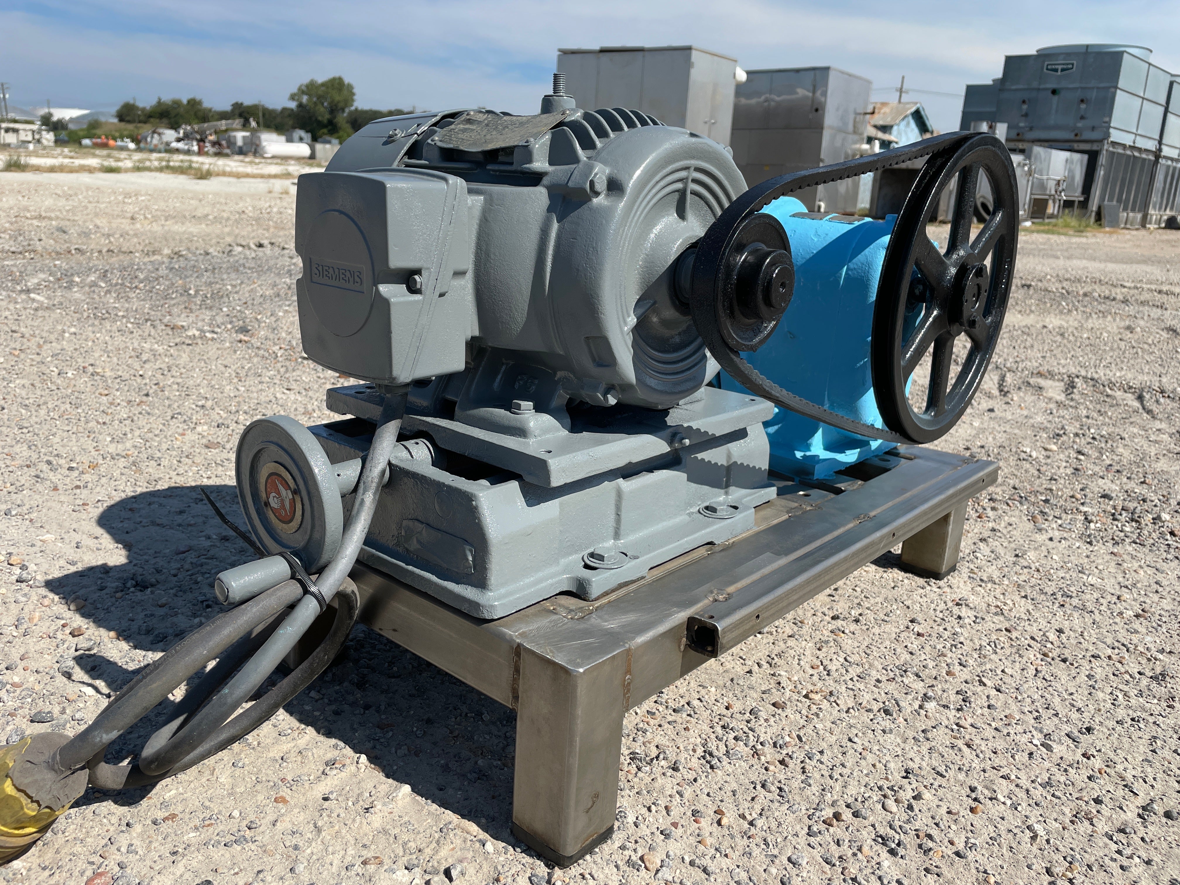 Waukesha Cherry-Burrell Positive Displacement Pump - Serial No: D0 74570-SS, Size: 25. Pump is belt Driven by a 5 HP Motor on a Stainless Steel Frame. Reliance Electric Company Reeves Drive - Model: 92B-H336. Siemens Efficiency Motor - Hp: 5, Hz: 60, Volts: 208-230/460, Amps: 14.0- 13.0/6.5, Rpm: 1755, S.F: 1.15, K.W: 3.73, Hz: 50, Volts: 200/400, Amps: 14.5/7.2, Rpm: 1455, S.F: 1.0. Guaranteed Min Eff: 87.5%