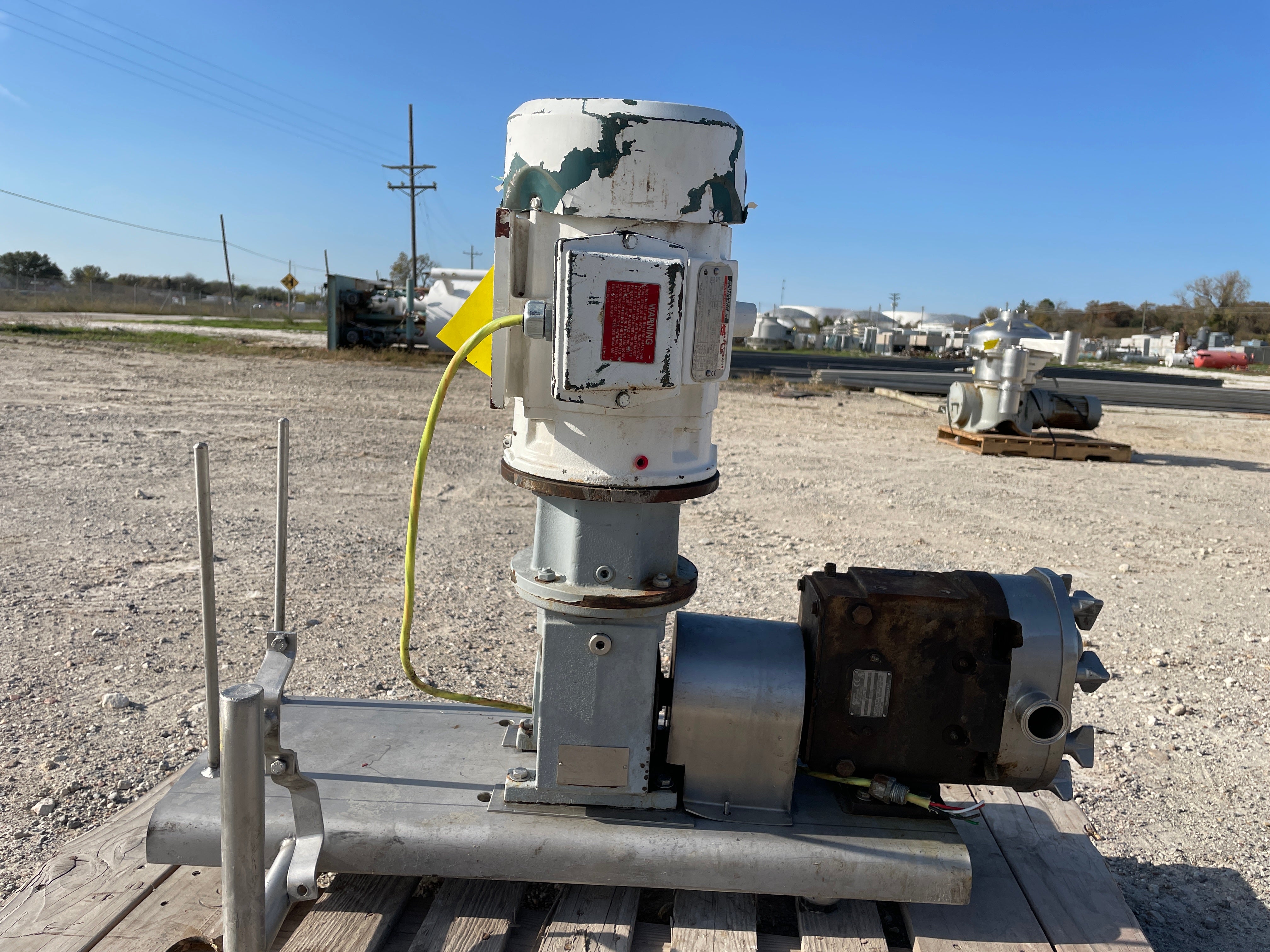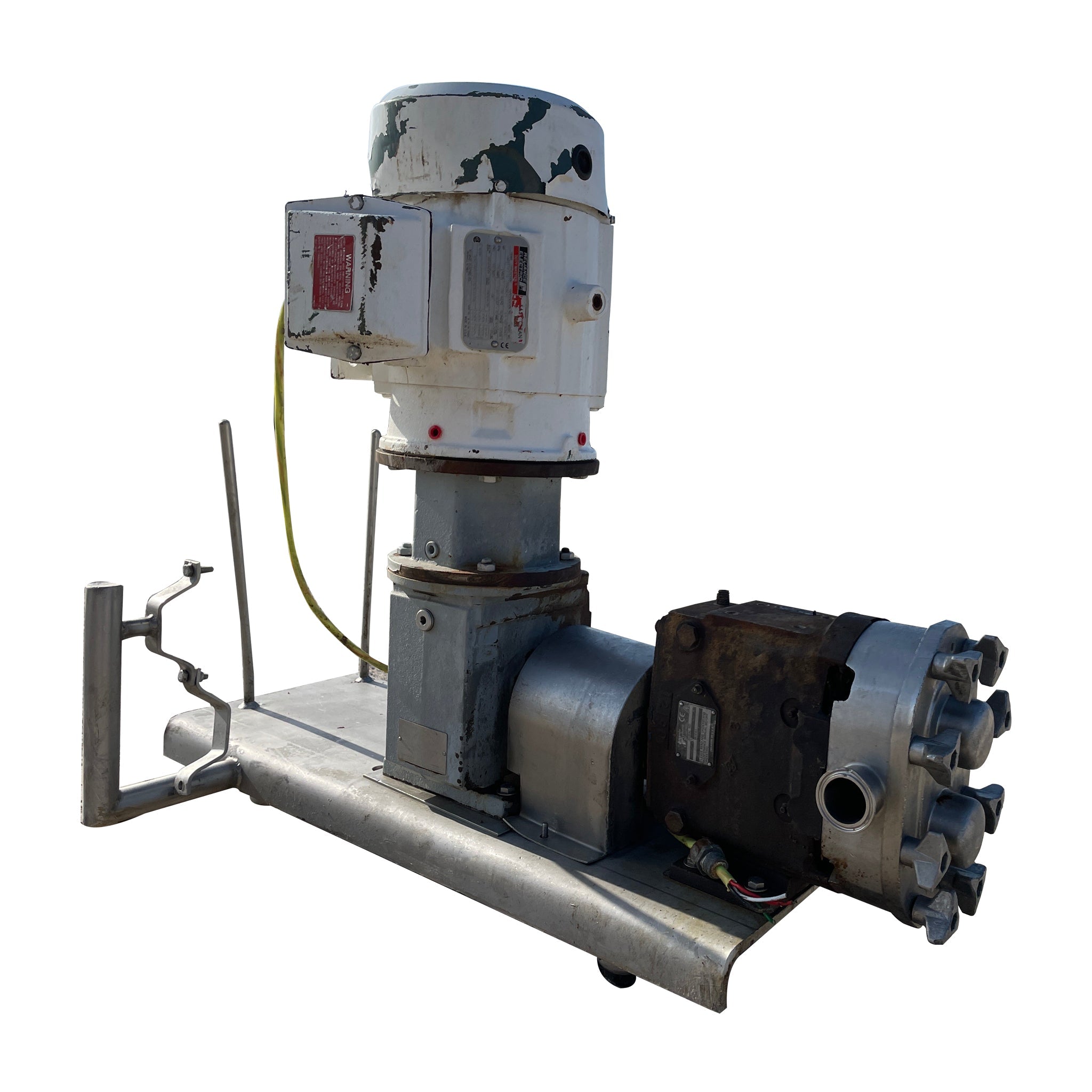 Waukesha Cherry-Burrell SS Positive Displacement Pump - Serial No: 304350, Model: 030. Displacement: 0.060 Gal/Rev. Nominal Capacity to 36 GPM: ( 8.2 M/hr), Port Size(in): 1.5, Max Pressure: 200 psi ( 13.8 Bar), Maximum RPM: 600, Temperaturer Range: -40 deg. C to 149 Deg.C. Alloy 88 Rotors Twin Wing Rotors. Standard clearance for up to 180 F on rotors clearance. Reliance Electric Duty Master: Frame: 184TC, Type: P, Design: B, Identification No: P18G3863-6, Model No: P18G3863C, HP: 3, Volts: 230/460, RPM: 1755, AMPS: 7.60/3.80, Encl: TEFC, Duty: Cont, Drive End Bearing End Bearing: 3OBC02JGG30A, HZ: 60, S.F: 1.15, AMB: 40 C, Code: K, Insul Class: F, Motor Weight: 105 LBS.