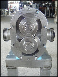 1999 Waukesha Positive Displacement Pump. Model: 18. Flow rate for new pump is 18 gpm with required horsepower and pressure. Discuss with salesperson your process and product to determine if this pump should handle your specific duty. Motor: 230 volts. Drive: 103 rpms final. (2) 3-1/2 in. rotors. Inlet/outlet: (2) 1-1/2 in. ACME. Features 316 stainless steel product contact surface. This pump meets 3A and BISCC standards and approval. Overall dimensions: 3 ft. L x 9 in. W x 1 ft. 6-1/2 in. H.