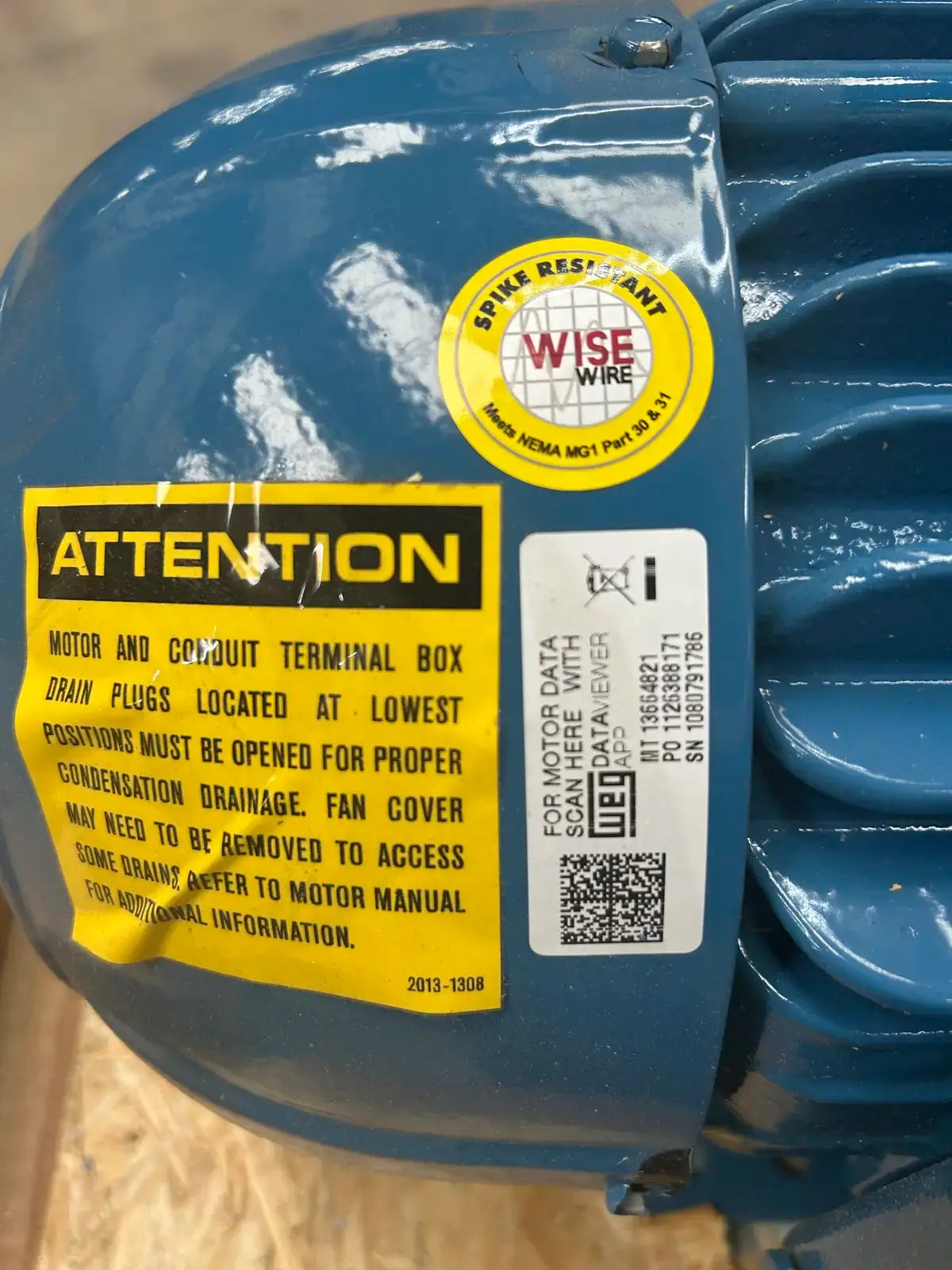 Marley Inverter Duty Motor Made by WEG. Model: MCT-A00504E1-W22G. Serial No: 16FEV231080791786. Power Supply - HP: 5, Ph: 3, Fr: 182/4T, RPM: 1750, Volts: 208-230/460, Hz: 60, Amps: 14.3-13.0/6.49.