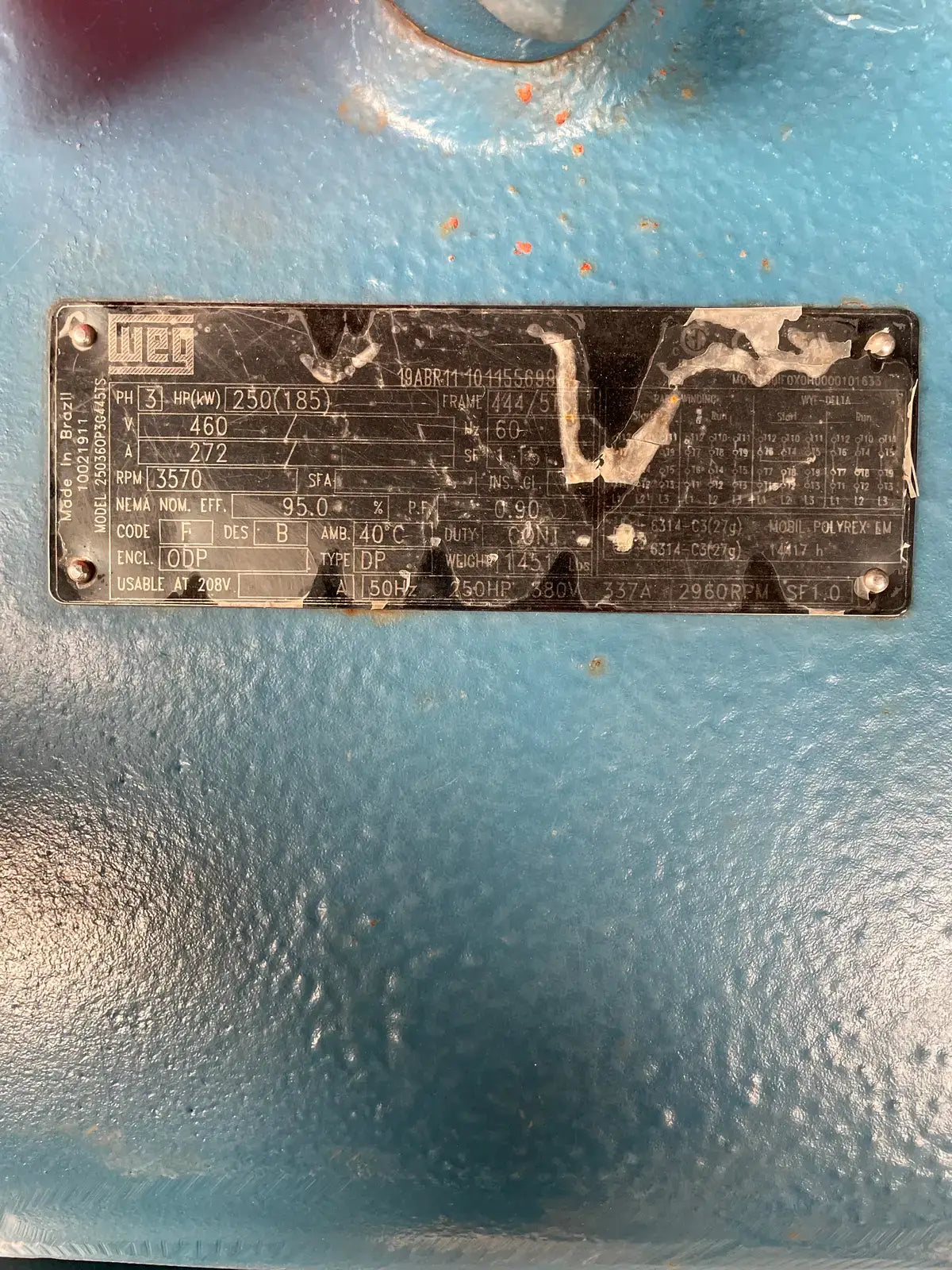 WEG NEMA Premium Efficiency Motor. Model: 250360P3G445TS. Serial No: 19ABR11 101155699. Power Supply - HP: 250, Volts: 460, Amps: 272, Frame: 444/5TS, Hz: 60, RPM: 3570, ENCL: ODP, Duty: CONT.