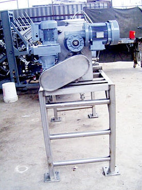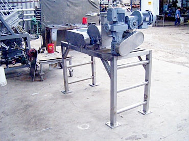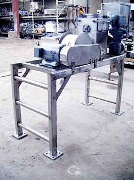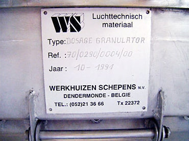 1994 Werkhuizen Schepens Dosage Granulator. Model: Gladiator. Type: Dosage Granulator. Blender paddle dimensions: 3 in. L x 1-1/4 in. W. Screw auger dimensions: 4 in. dia. x 1 ft. 3 in. L. Pitch: 3 in. Mill blade dimensions: 3 in. L x 1-1/2 in. W. Baldor Electric motor, Stober drive, Louis Allis electric motor, 3 hp, Inlets: (1) 10 in. dia. product Infeed. Outlet: (1) 1 ft. dia. product discharge. Overall dimensions: 5 ft. 2 in. L x 2 ft. 6 in. W x 4 ft. 11 in. H.