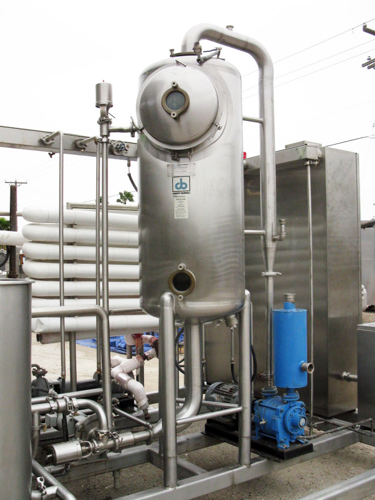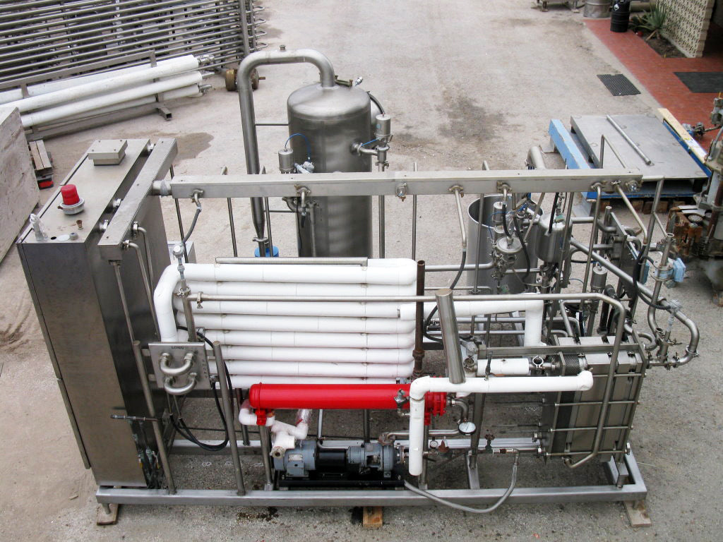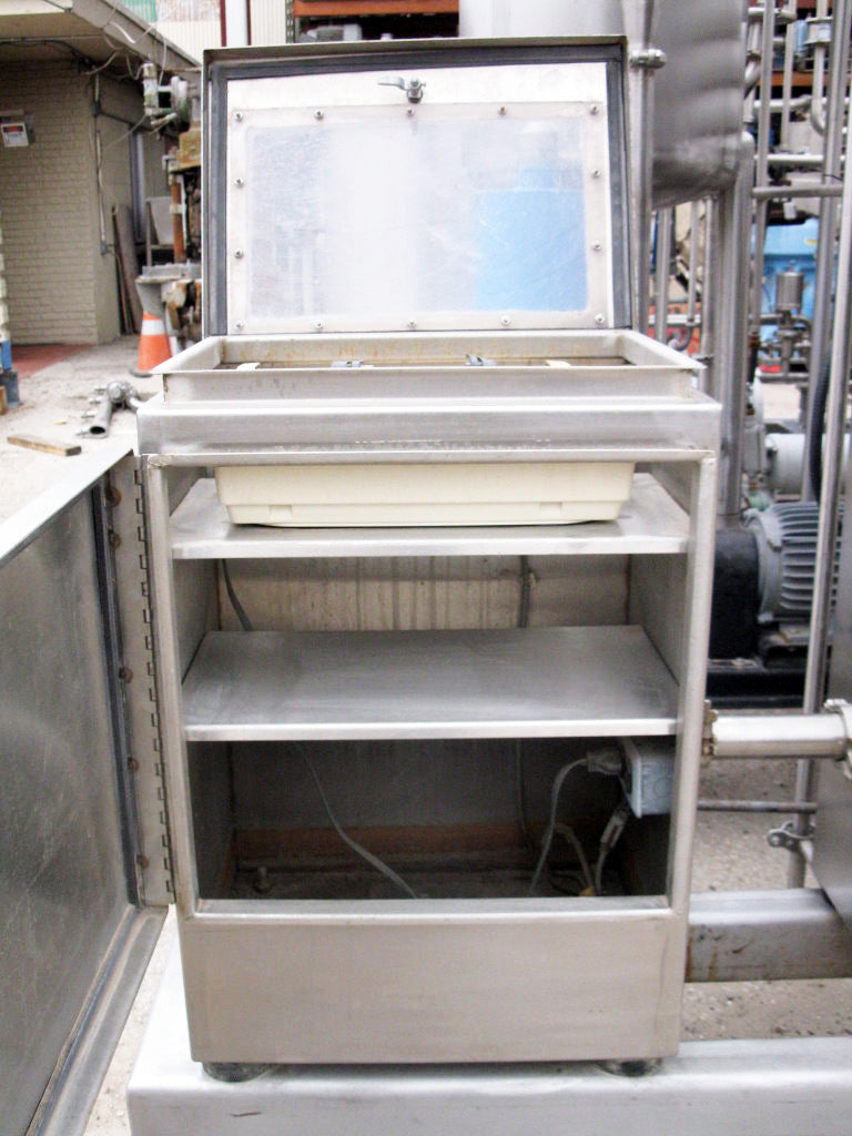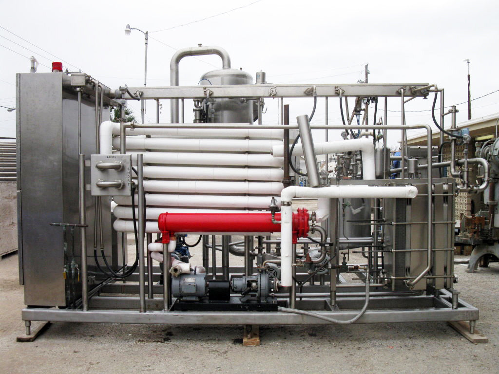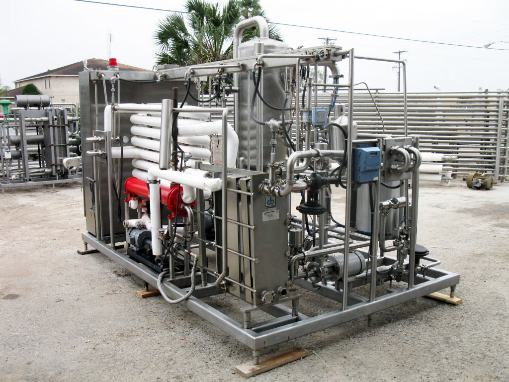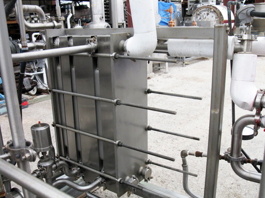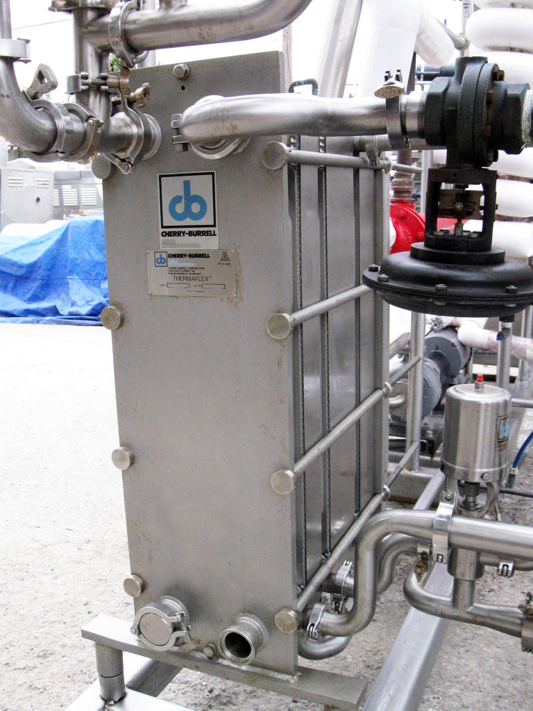 WHE Process Systems Ltd. Stainless Steel Skid-Mounted Vegetable Juice Pasteurizer. Capacity: 10,660 lbs. hr. Skid includes: a model 217SB-2 Cherry Burrell plate heat exchanger with (98) heat exchanger plates: plate overall dimensions: 1 ft. 1/2 in. W x 3 ft. 1/2 in. H. Heat transfer surface area per plate: 8 in. W x 2 ft. 9-1/2 in. H. Total heat transfer: 182.38 sq. ft. Siemens PLC with keypad, Epson dot matrix printer, balance tank, holder tube, divert valve, centrifugal timing pump with mag meter based timing system, deaerator, product removal pump, vacuum pump, shell and tube hot water make-up set, and interconnecting piping. (1) Travaini pump. Teco electric motor: 5 hp, 1750 rpm, 230/460V, 13/6.5 amps, 60 Hz, 3 phase. (1) Worthington centrifugal pump, model no. D1011, 6.50 impeller dia. motor: 3 hp, 3475 rpm, 230/460V, 9/4.8 amps, 60 Hz, 3 phase. Fristam centrifugal pump: model no. FPX712130. Baldor Electric motor: 3 hp, 3450 rpm, 208-230/460V, 8.2-7.8/3.9 amps, 60 Hz, 3 phase. (1) Cherry-Burrell centrifugal pump: model no. 4BHK-F. Leeson motor: 3 hp, 1740 rpm, 208-230/460V, 8.8/4.4 amps, 60 Hz, 3 phase. (1) Fristam centrifugal pump. Model no. FP741205. Leeson motor: 2 hp, 1740 rpm, 208-230/460V, 6.2/3.1 amps, 60 Hz, 3 phase. (1) WHE Process Systems LTD. stainless steel balance tank: inside dimensions: 2 ft. dia. x 2 ft. 8 in. straight wall (approximately 60 gallons). (1) WHE Systems LTD. Control Panel. (10) Cherry-Burrell stainless steel valves. (1) Epson LX-800 printer. (1) Shell and tube heat exchanger. (1) Rosemount transmitter paRam Industrieseter. Initial duty was to pasteurize 10,600 lbs/hr of single strength vegetable juice with a Fahrenheit temperature progression of 40-90-230-260-129-99-70-65 using 22,500 lbs/hr of 260°F water, 22,500 lbs/hr of 265 °F hot water and 22,500 lbs/hr of 55 °F potable water. Overall dimensions: 13 ft. 5 in. L x 8 ft. W x 10 ft. H.