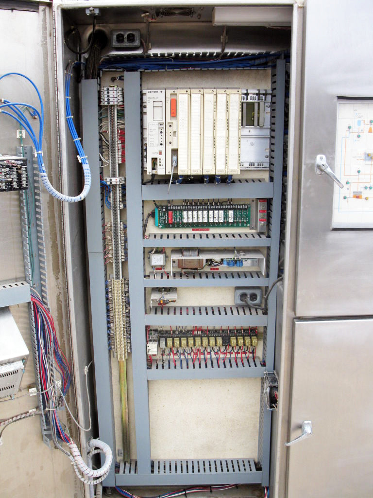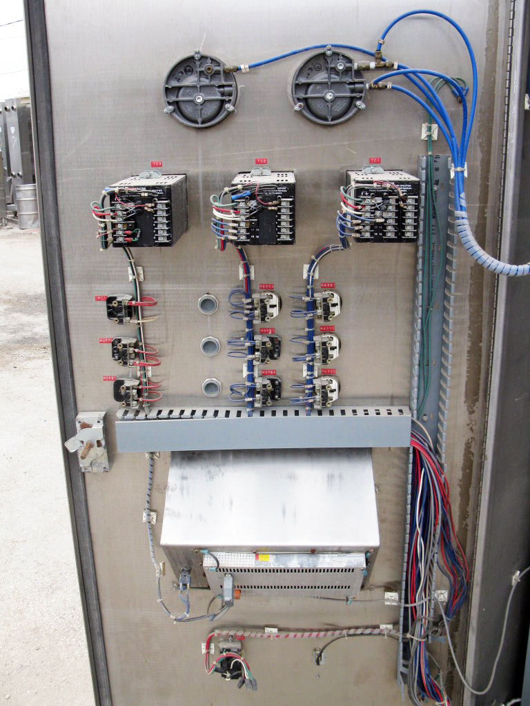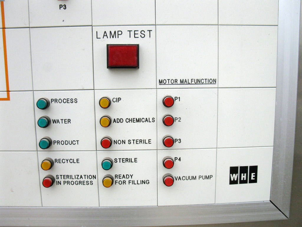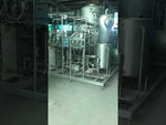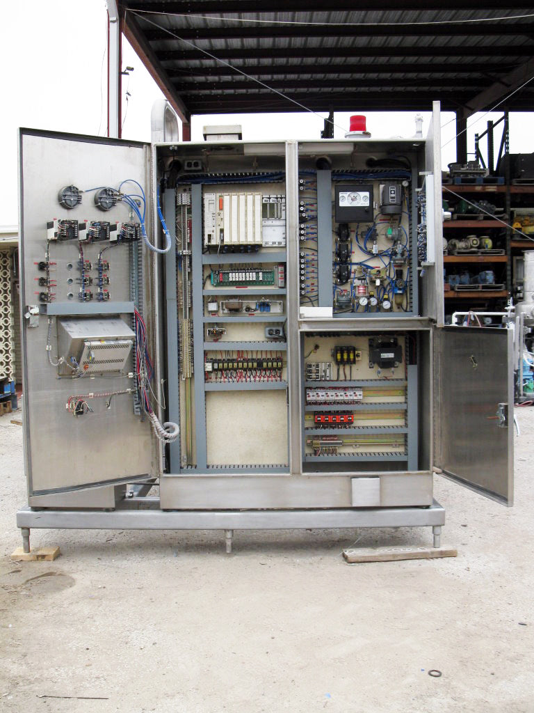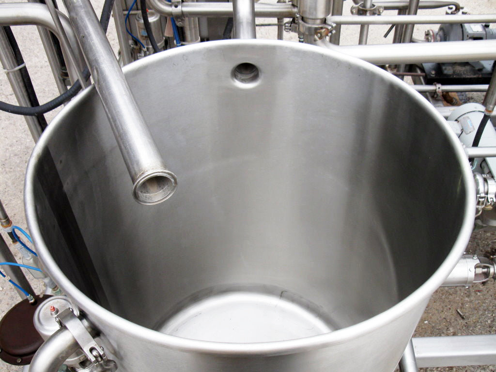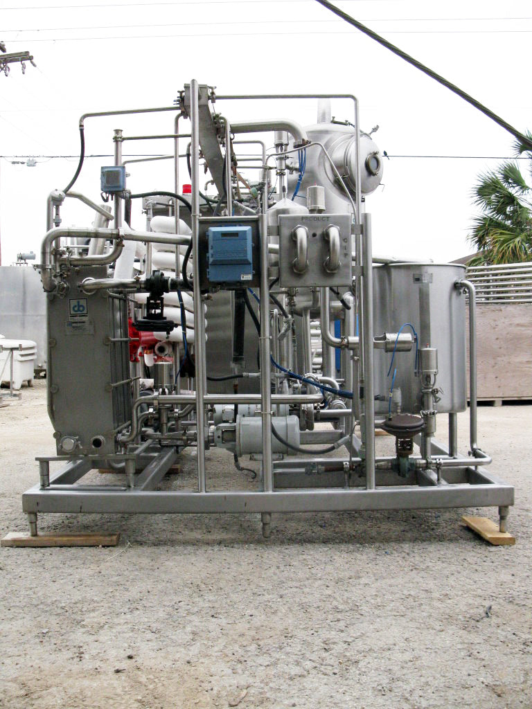 WHE Process Systems Ltd. Stainless Steel Skid-Mounted Vegetable Juice Pasteurizer. Capacity: 10,660 lbs. hr. Skid includes: a model 217SB-2 Cherry Burrell plate heat exchanger with (98) heat exchanger plates: plate overall dimensions: 1 ft. 1/2 in. W x 3 ft. 1/2 in. H. Heat transfer surface area per plate: 8 in. W x 2 ft. 9-1/2 in. H. Total heat transfer: 182.38 sq. ft. Siemens PLC with keypad, Epson dot matrix printer, balance tank, holder tube, divert valve, centrifugal timing pump with mag meter based timing system, deaerator, product removal pump, vacuum pump, shell and tube hot water make-up set, and interconnecting piping. (1) Travaini pump. Teco electric motor: 5 hp, 1750 rpm, 230/460V, 13/6.5 amps, 60 Hz, 3 phase. (1) Worthington centrifugal pump, model no. D1011, 6.50 impeller dia. motor: 3 hp, 3475 rpm, 230/460V, 9/4.8 amps, 60 Hz, 3 phase. Fristam centrifugal pump: model no. FPX712130. Baldor Electric motor: 3 hp, 3450 rpm, 208-230/460V, 8.2-7.8/3.9 amps, 60 Hz, 3 phase. (1) Cherry-Burrell centrifugal pump: model no. 4BHK-F. Leeson motor: 3 hp, 1740 rpm, 208-230/460V, 8.8/4.4 amps, 60 Hz, 3 phase. (1) Fristam centrifugal pump. Model no. FP741205. Leeson motor: 2 hp, 1740 rpm, 208-230/460V, 6.2/3.1 amps, 60 Hz, 3 phase. (1) WHE Process Systems LTD. stainless steel balance tank: inside dimensions: 2 ft. dia. x 2 ft. 8 in. straight wall (approximately 60 gallons). (1) WHE Systems LTD. Control Panel. (10) Cherry-Burrell stainless steel valves. (1) Epson LX-800 printer. (1) Shell and tube heat exchanger. (1) Rosemount transmitter paRam Industrieseter. Initial duty was to pasteurize 10,600 lbs/hr of single strength vegetable juice with a Fahrenheit temperature progression of 40-90-230-260-129-99-70-65 using 22,500 lbs/hr of 260°F water, 22,500 lbs/hr of 265 °F hot water and 22,500 lbs/hr of 55 °F potable water. Overall dimensions: 13 ft. 5 in. L x 8 ft. W x 10 ft. H.