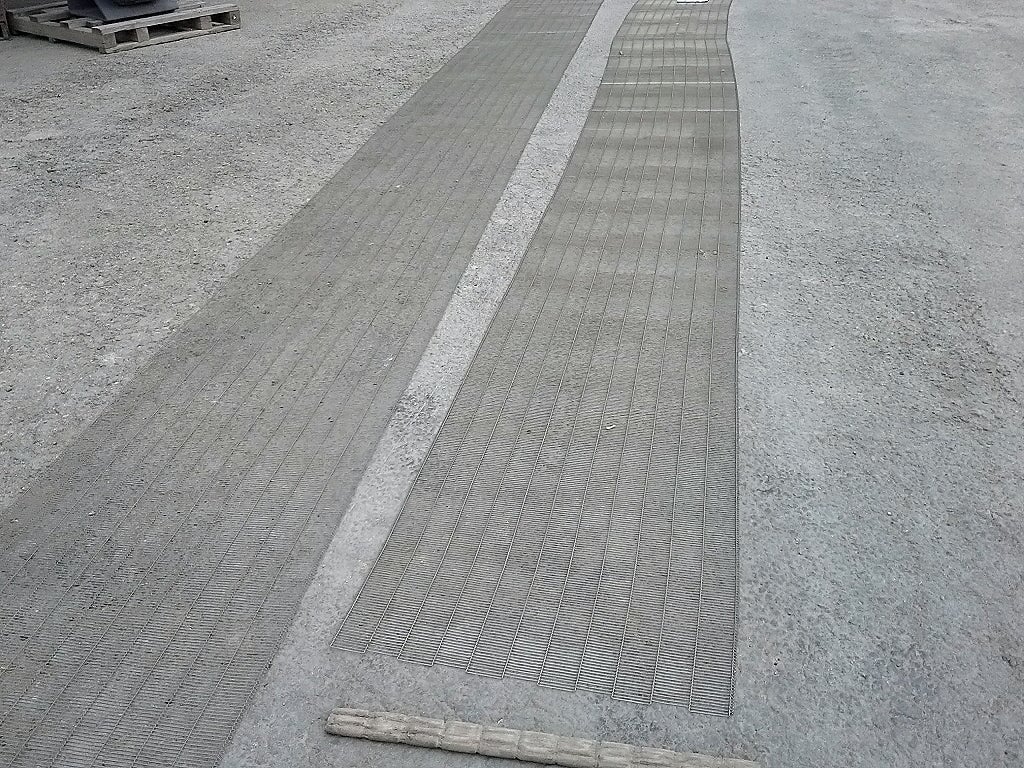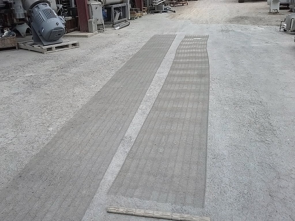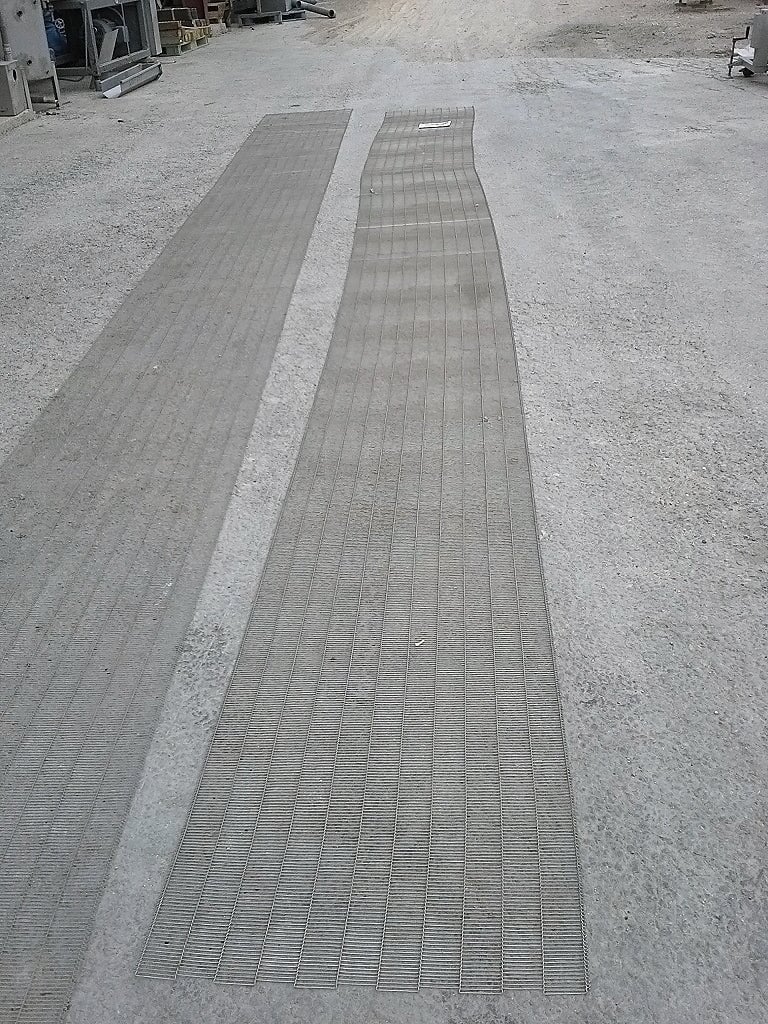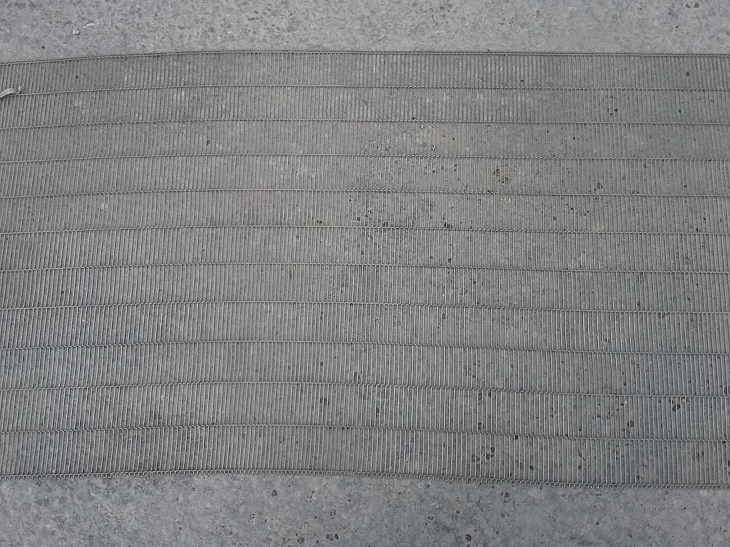 Wire Belt Company of America Flat-Flex Belt. Model: Flat-Flex Belt. Approximately 26 ft. of 3/8 in. x 0.062 in. Flat-Flex belting. 42 strands per foot. Typical applications: meat, poultry, fruit and vegetable processing, electronics manufacturing, freezing or drying processes. Wire diameter of 0.063 inches. 0.227 inch opening between wires. Single loop edges. Overall dimensions: 26 ft. L x 2 ft. 5 in. W x 1/16 in. H.