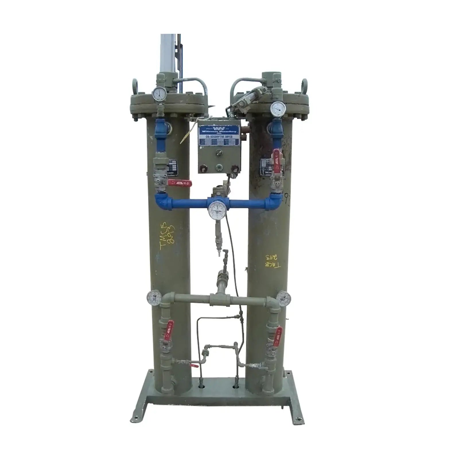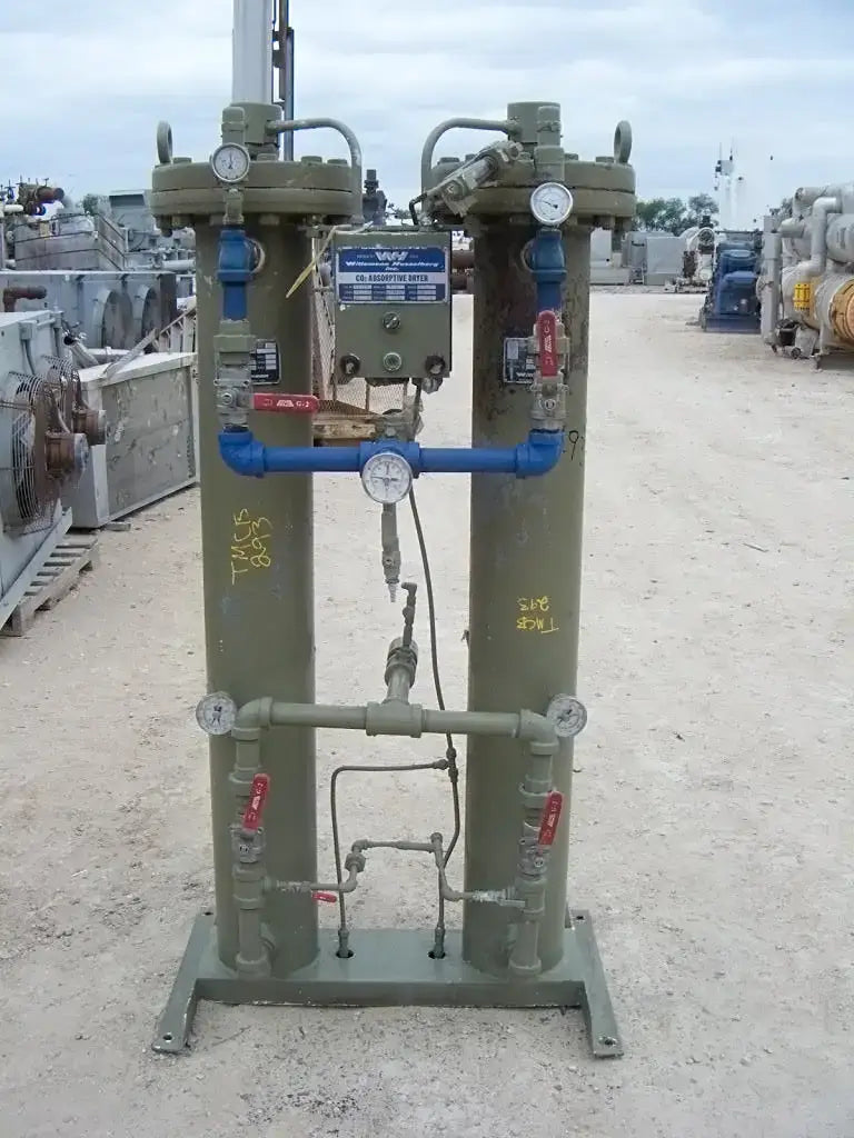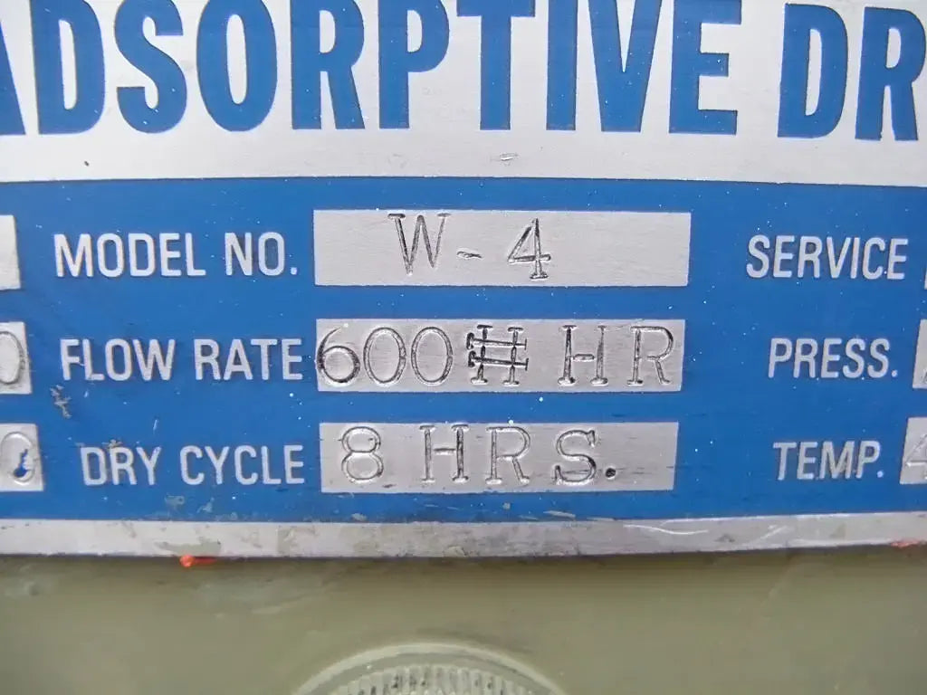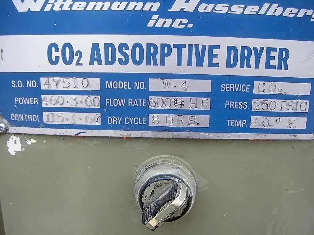 Wittemann Hasselberg CO2 Adsorptive Dryer. Model: W-4. S/N: 47510. Power requirements: 460 V, 3 phase, 60 Hz. Control power requirements: 115 V, single phase, 60 Hz. MAWP: 250 psig @ 40 F. Left tube model: CRNC-8399.2. S/N left tube: 46873-4L. Year built: 1977. MAWP: 300 psi @ 650 F. Right tube model: CRNC-8399.2. S/N right tube: 46873-4R. MAWP: 300 psi @ 650 F. Inlets/Outlets: (2) 2 in. NPT male. Overall dimensions: 3 ft. 1 in. L x 2 ft. W x 6 ft. H.