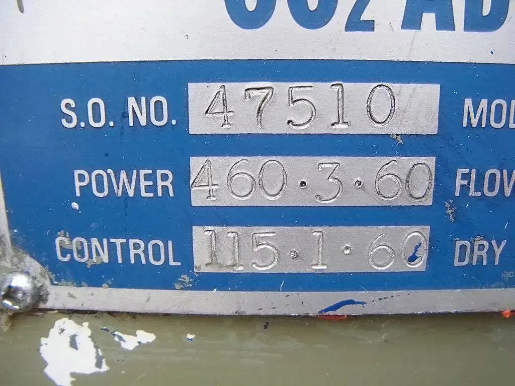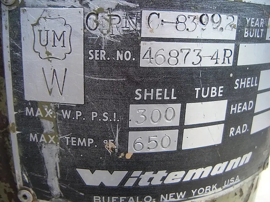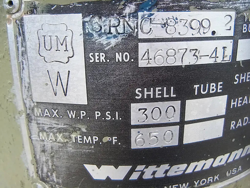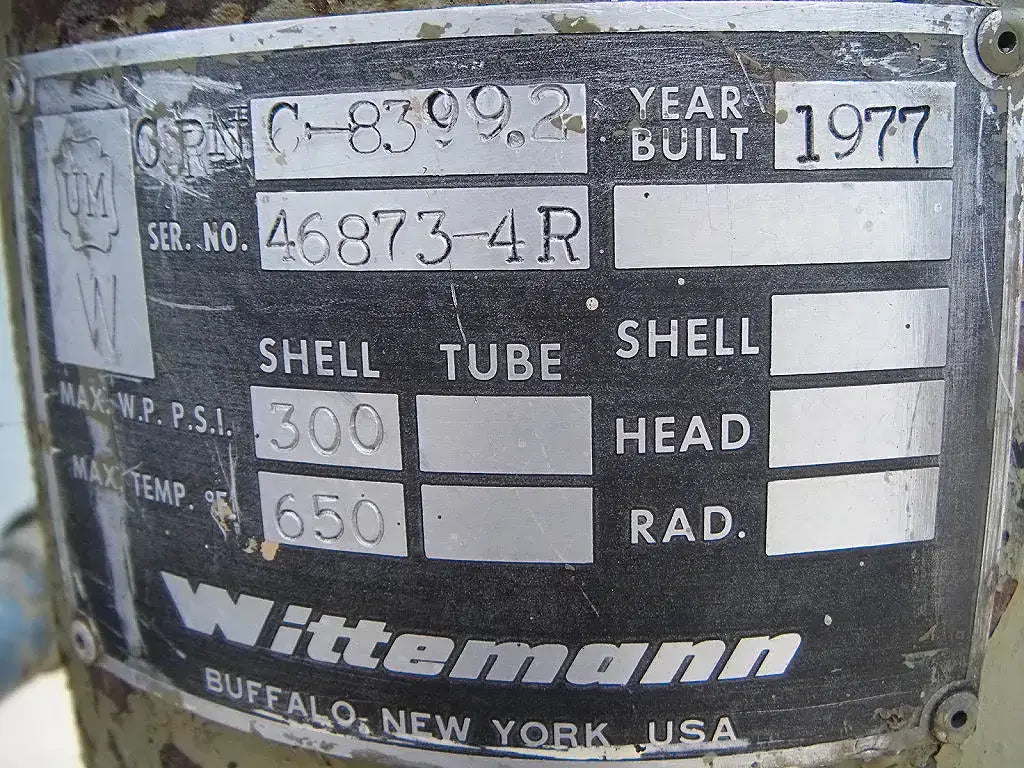 Wittemann Hasselberg CO2 Adsorptive Dryer. Model: W-4. S/N: 47510. Power requirements: 460 V, 3 phase, 60 Hz. Control power requirements: 115 V, single phase, 60 Hz. MAWP: 250 psig @ 40 F. Left tube model: CRNC-8399.2. S/N left tube: 46873-4L. Year built: 1977. MAWP: 300 psi @ 650 F. Right tube model: CRNC-8399.2. S/N right tube: 46873-4R. MAWP: 300 psi @ 650 F. Inlets/Outlets: (2) 2 in. NPT male. Overall dimensions: 3 ft. 1 in. L x 2 ft. W x 6 ft. H.