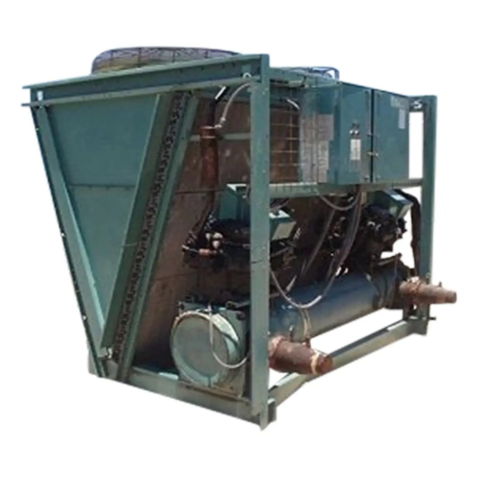 York Air Cooled Liquid Chiller- 100 Ton. Model: YCAS08446. S/N: YBWL101498. Outdoor use. Refrigerant: R-22. Test pressure (hi/lo): 450/300 psig. Power supply: 460 V, 60 Hz, 3 phase. Minimum circuit ampacity: 202 amps. Max. dual element fuse size: 225 amps. Maximum circuit breaker size: 225 amps. (2) Copeland 8-Cylinder Reciprocating Compressors, Models: 8DP2-5000FSD and 8DP15000FSD, S/N's: 11516 and 11104, power supply: 460 V, 80 RLA, 510 LRA. (2) Condenser Fans, 5 hp, power supply: 460 V, 7.1 FLA, 41.8 LRA. Electronic Controls, power supply: 115 V, 60 Hz, single phase. (2) Oil Heaters, power supply: 115 V, 60 Hz, single phase, 100 watts (ea). Cooler heater, power supply: 115 V, 60 Hz, single phase. Inlets/outlets: (2) 4 in. dia. ports. Overall dimensions: 9 ft. 7 in. L x 8 ft. W x 7 ft. 10 in. H.