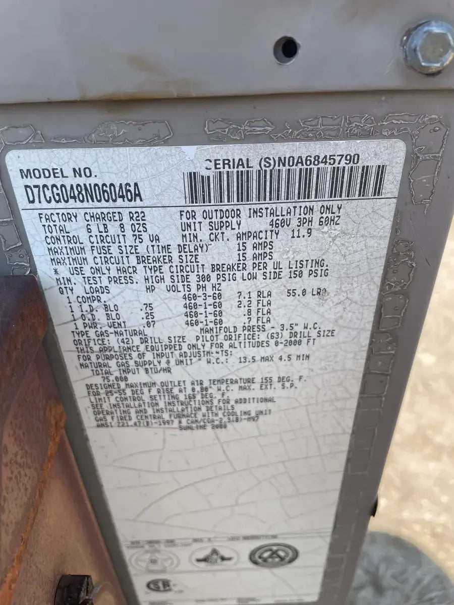 York Sunline Single Air Condensing Unit. Model: D7CG048N06046A, Serial No: SN0A6845790. Unit Power Supply: 460V/3PH/60Hz. Minimum Circuit Ampacity: 11.9. Maximum Fuse Size( Time Delay): 15 AMPS. Maximum Circuit Breaker Size: 15 AMPS. Type of Gas: Natural. Total Input BTU/HR: 75,000. Total of Tons: 4. Designed Maximum Outlet Air Temperature: 155 Deg F.