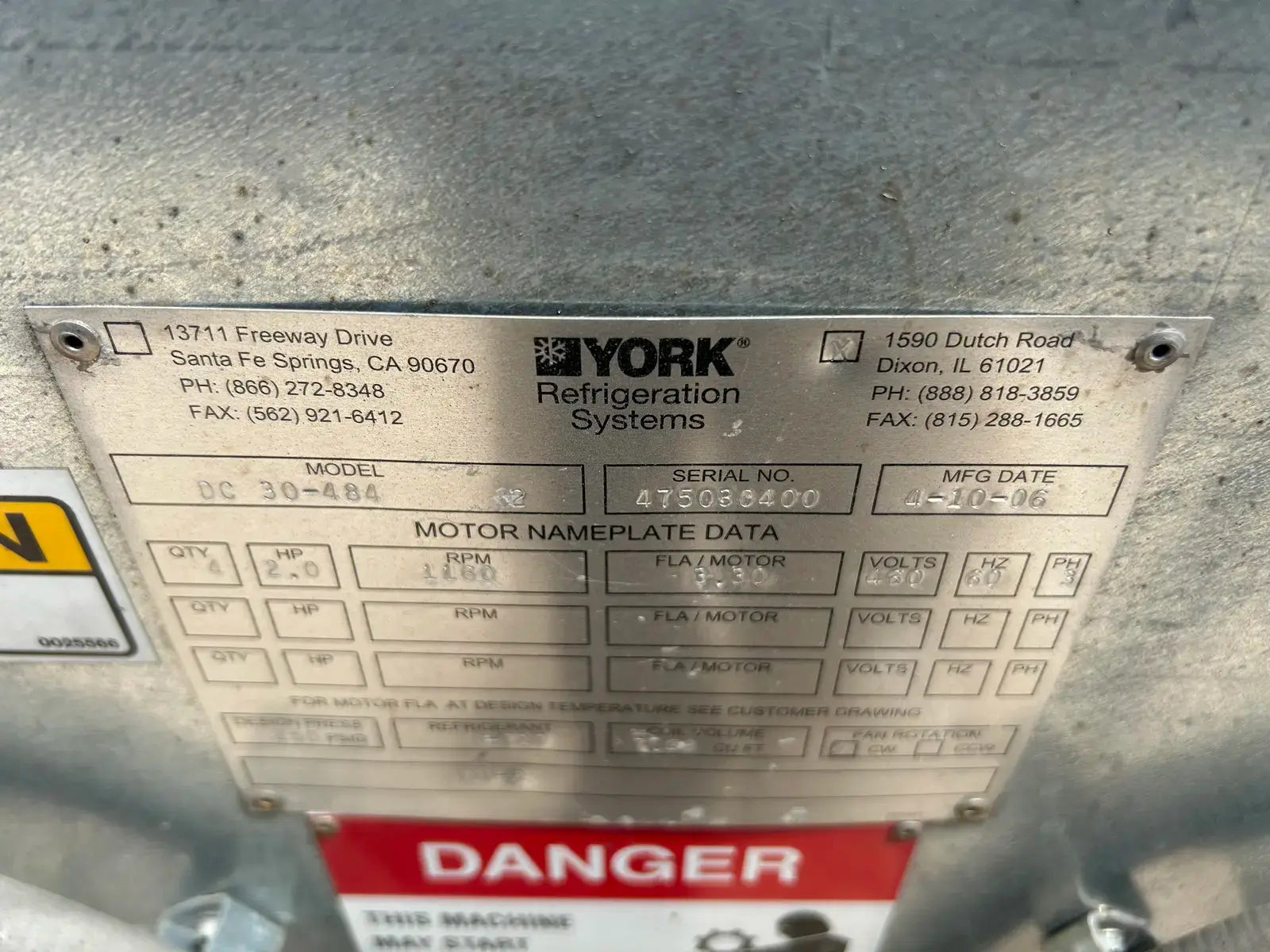 Frick/York Refrigeration 4-Fan Evaporator Coil. Model: DC30-484. Serial No:475030400. Design Pressure: 250 PSIG. Refrigerant: R-717. Coil Volume: 7.99.