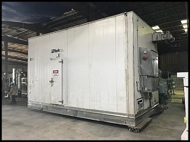 York Food Systems Series S Spiral Freezing System. Model: S/1923 93-9C. Belting material: stainless steel wire. Belt width: 19 inches (15 inches usable). Product height clearance: 2.75 inches. Wire belting gap size: approximately 5 mm. Calculated total belting 600 feet. Number of tiers: 24. Length of belting on tiers: 534 feet. Stainless steel sliding doors provide access to the spiral on both sides. Previously used with ammonia refrigeration to freeze various seafood products (fillets and value added products) in a Kosher plant. Previous application was 2500-2800 LBS of 6 oz skin-on salmon portions per 10 hour day (250-280 LBS/HR). Previous application input temperature was +38F with an exit temperature of -5F. Spiral radius: 4 ft. 7 in. Box dimensions: 10 ft. wide x 20 ft. long. Approximate weight: 27,000 LBS. Overall dimensions: 11 ft. 1.5 in. W x 21 ft. 8 in. L x 12 ft. 7 in. H.