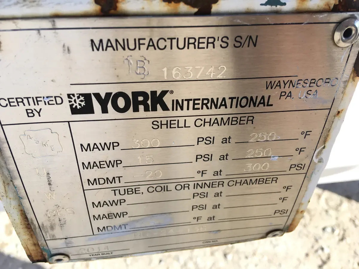 York International Horizontal Ammonia Receiver ( 24 in x 120in. 235 Gallons) Serial Number: HR-24-136. Tank National Board Number: 163742. Tank Estimated Capacity (Gallons): 235. Tank MAWP (PSI @ Temp): 300 PSI @ 250 F. Tank MAWT (PSI @ Temp): -20 F @ 300 PSI. Previous Refrigerant was Ammonia (R717 | NH3). Manufactured in 2014. Shipping Dimensions (Inches): 144 x 26 x 58. 2000 LB