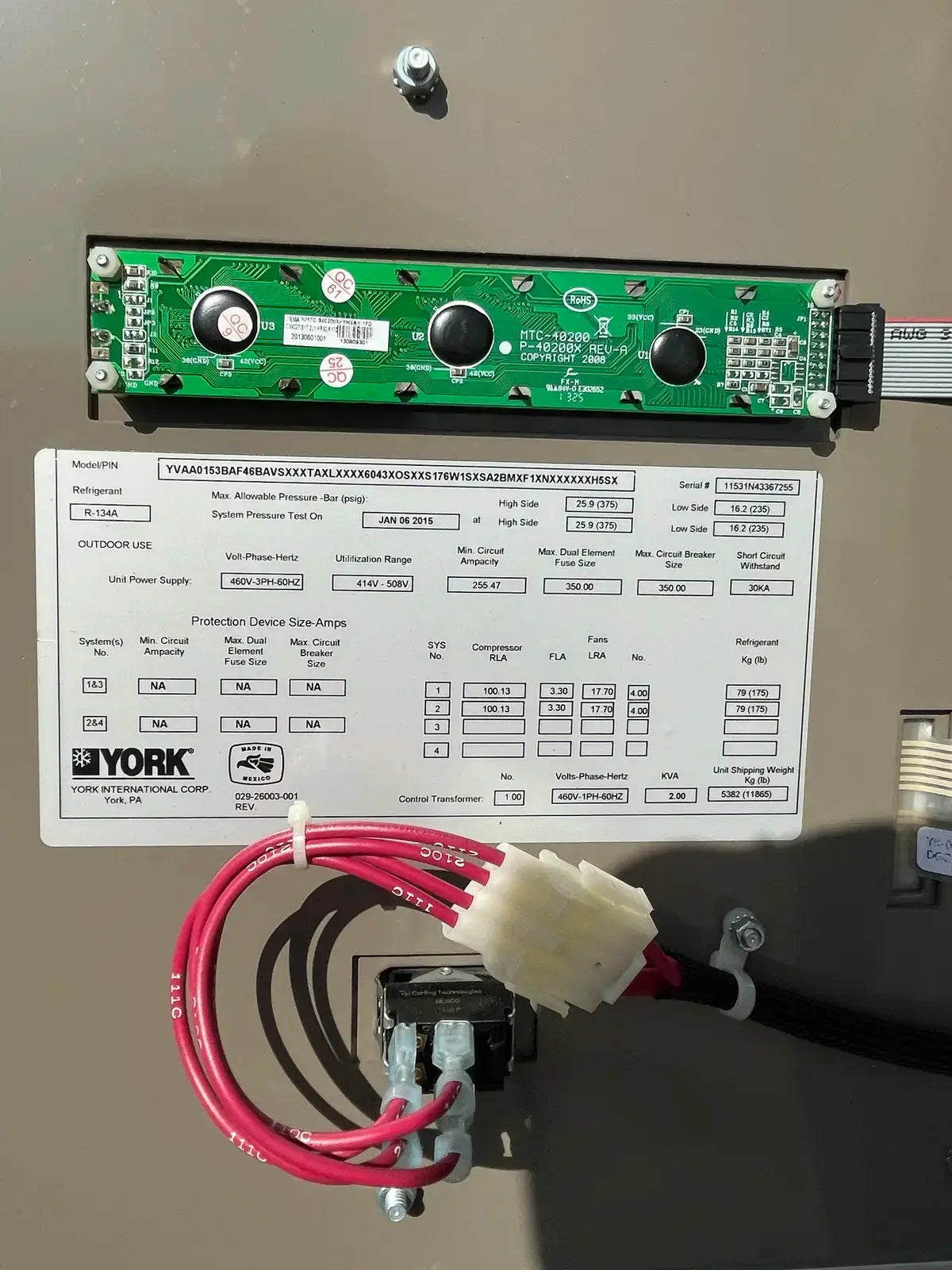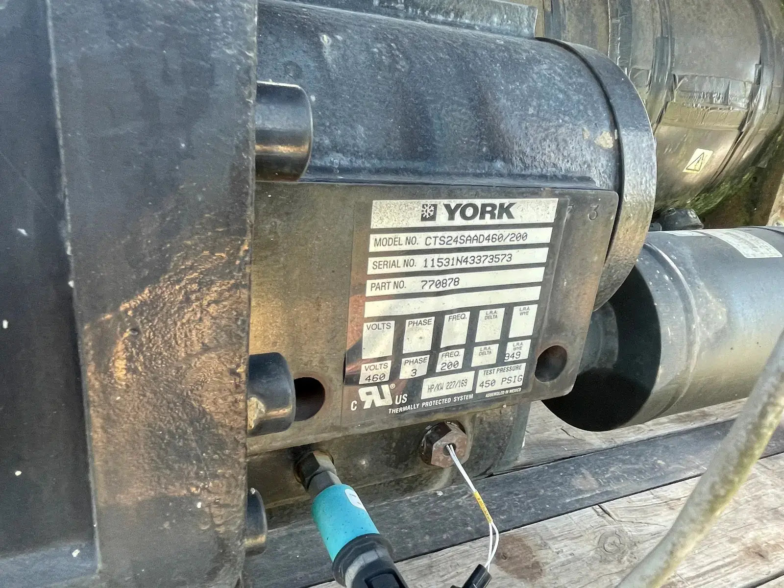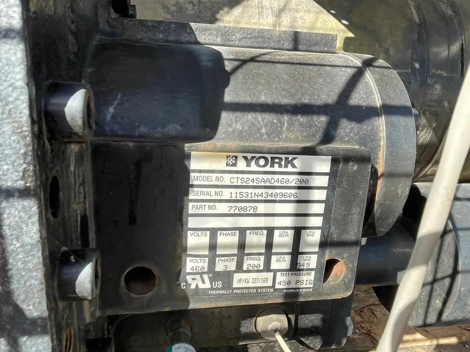 - Compressor Descriptions: (2) York Semi-Hermetic Screw Compressor: Model: CGTS24SAAD460/200. Power Supply: Volts: 460, Ph: 3, Freq: 200, LRA: 949. HP: 227. Test Pressure: 450 PSIG.